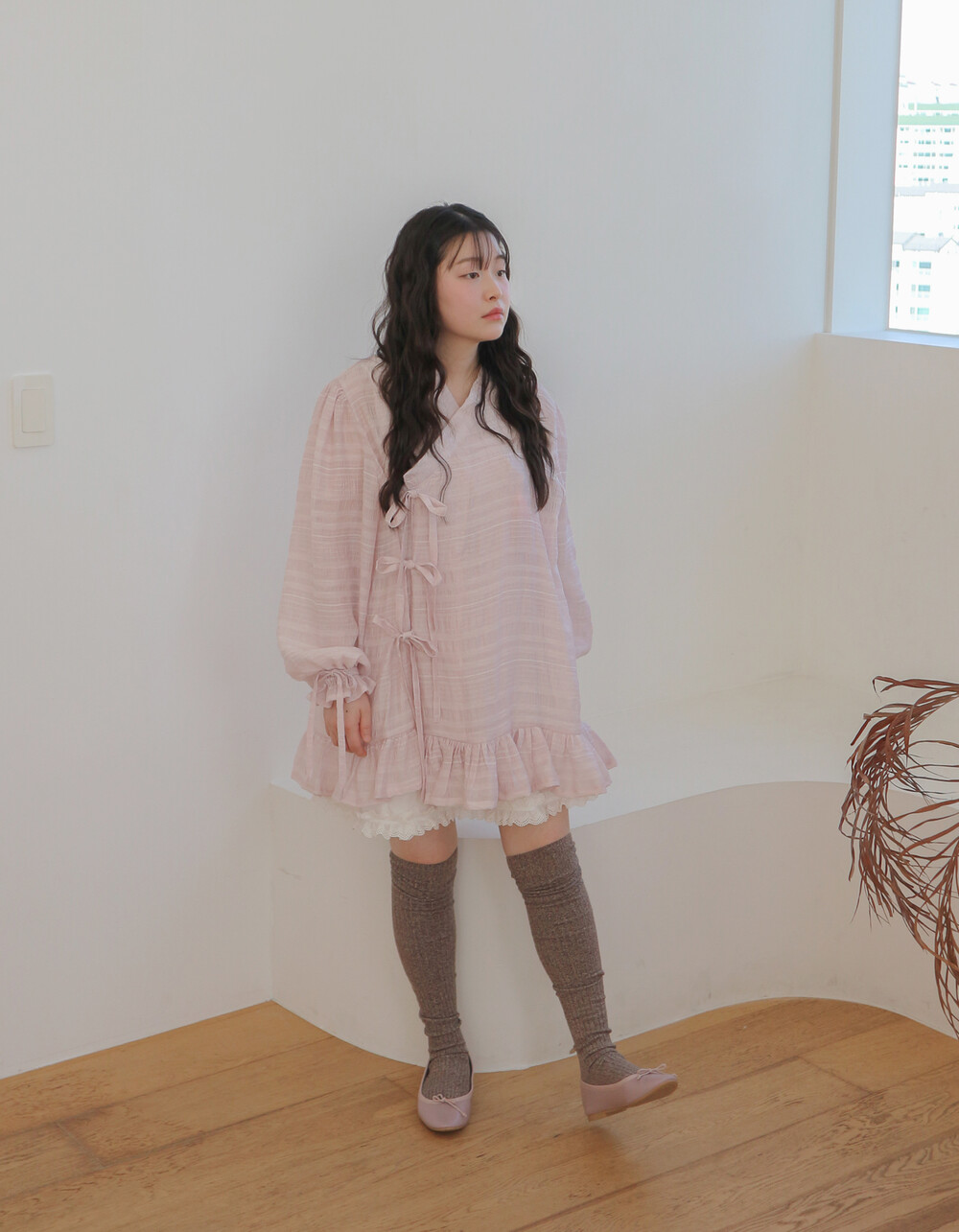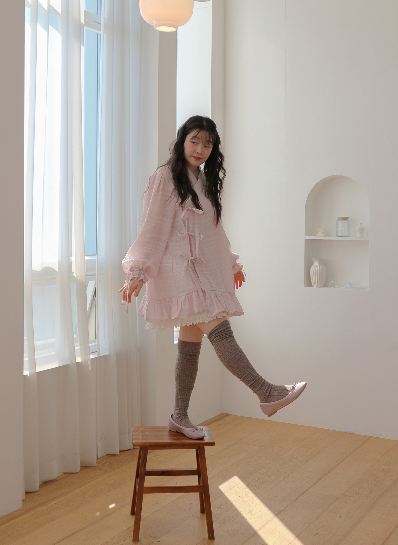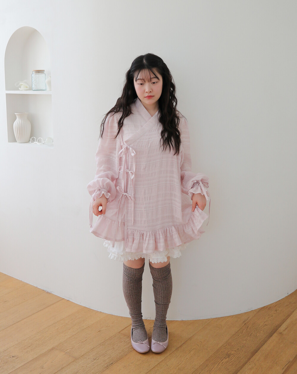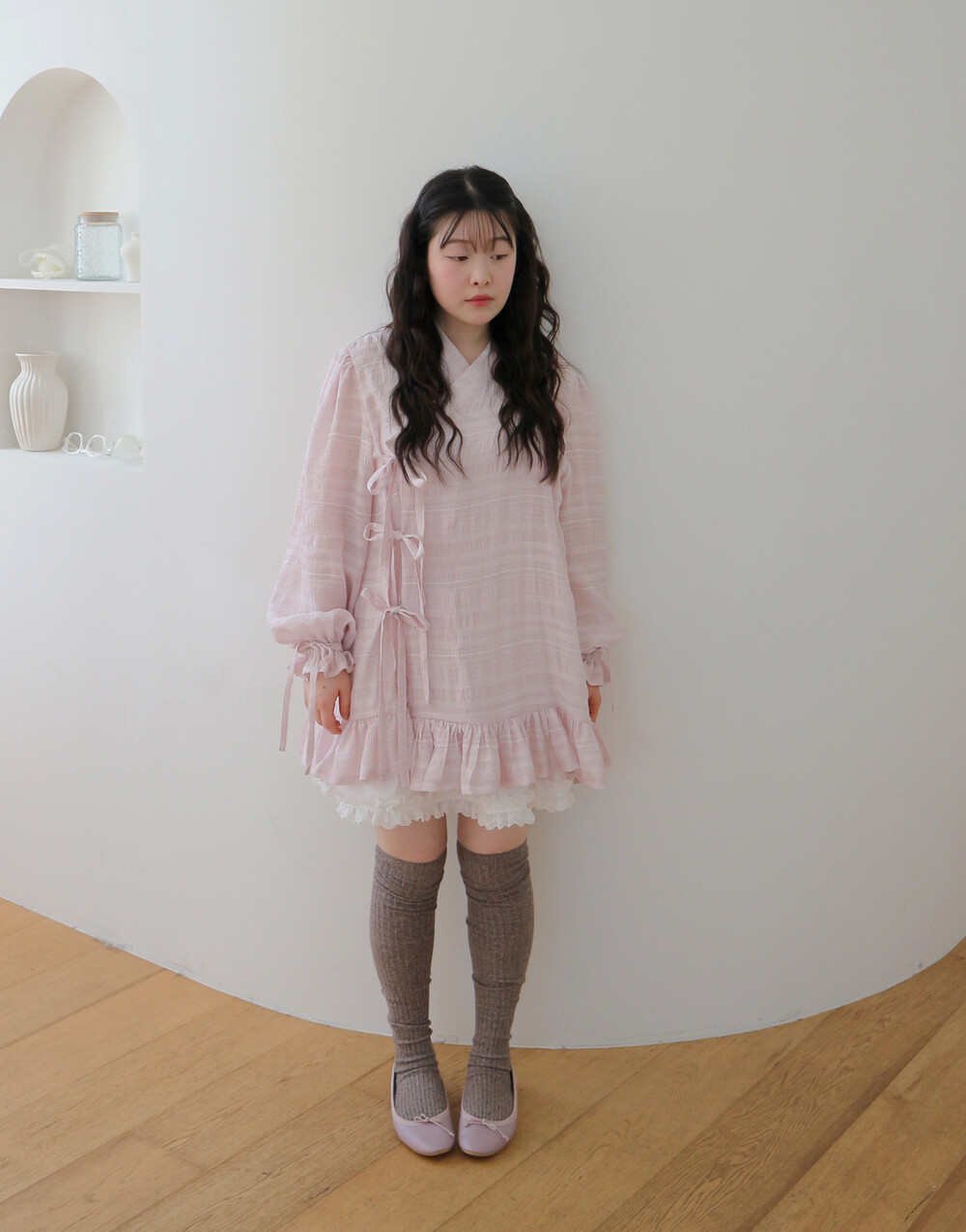 25 소라 링클 프릴 원피스의 아더 컬러로 제작되었으며, 발레코어 무드의 맑은 핑크색과