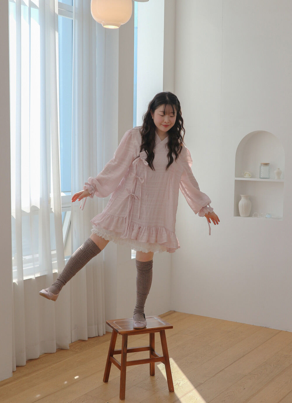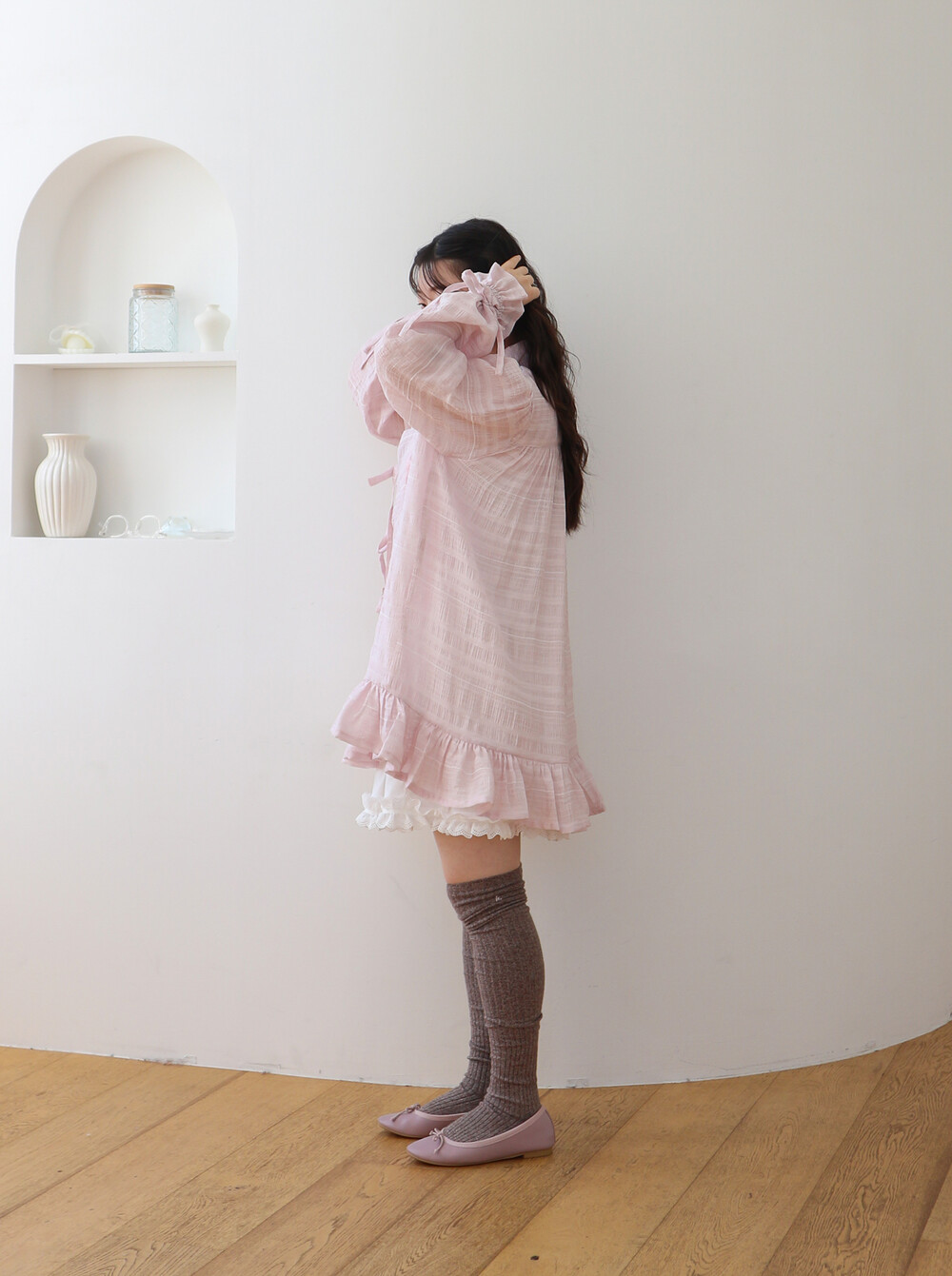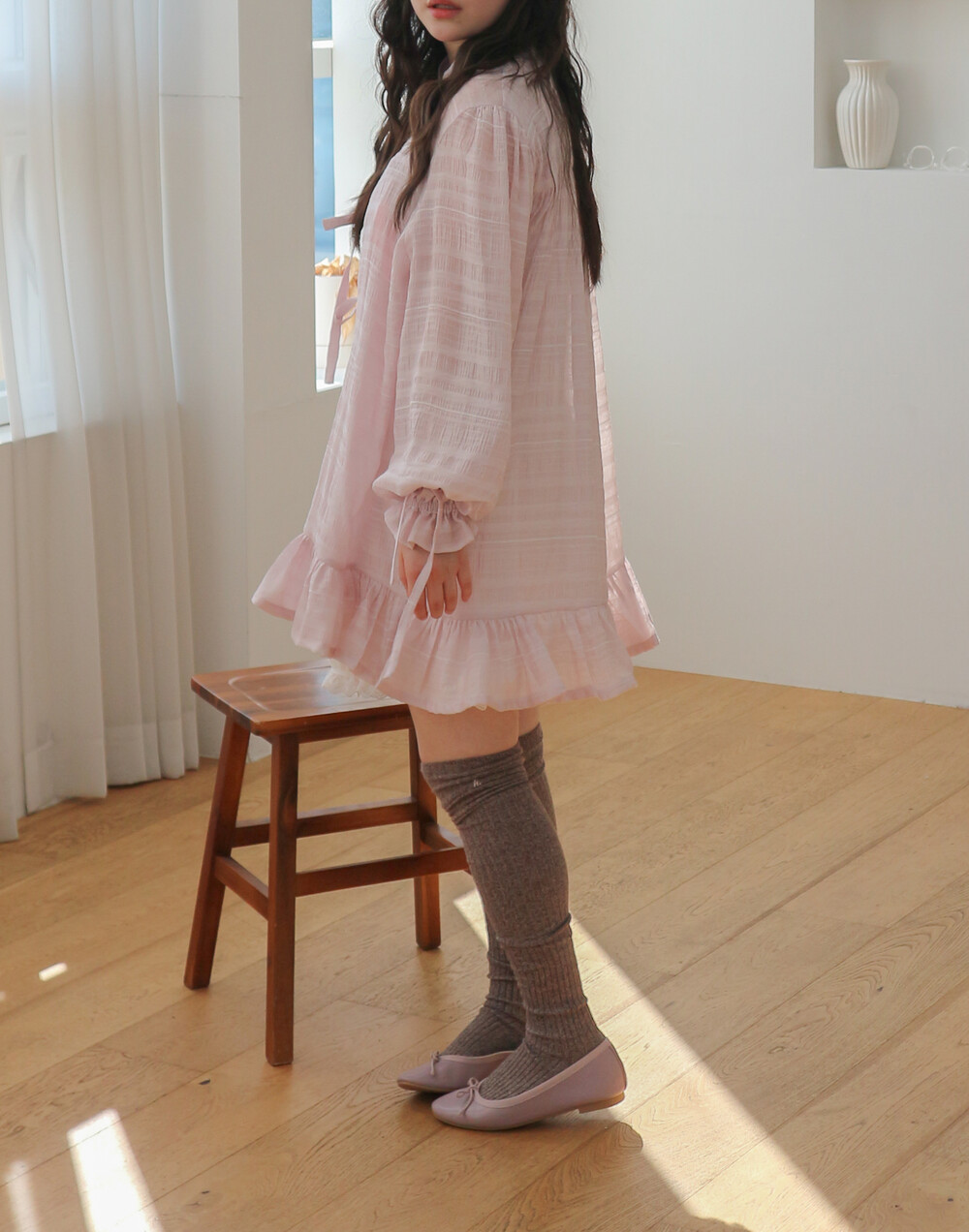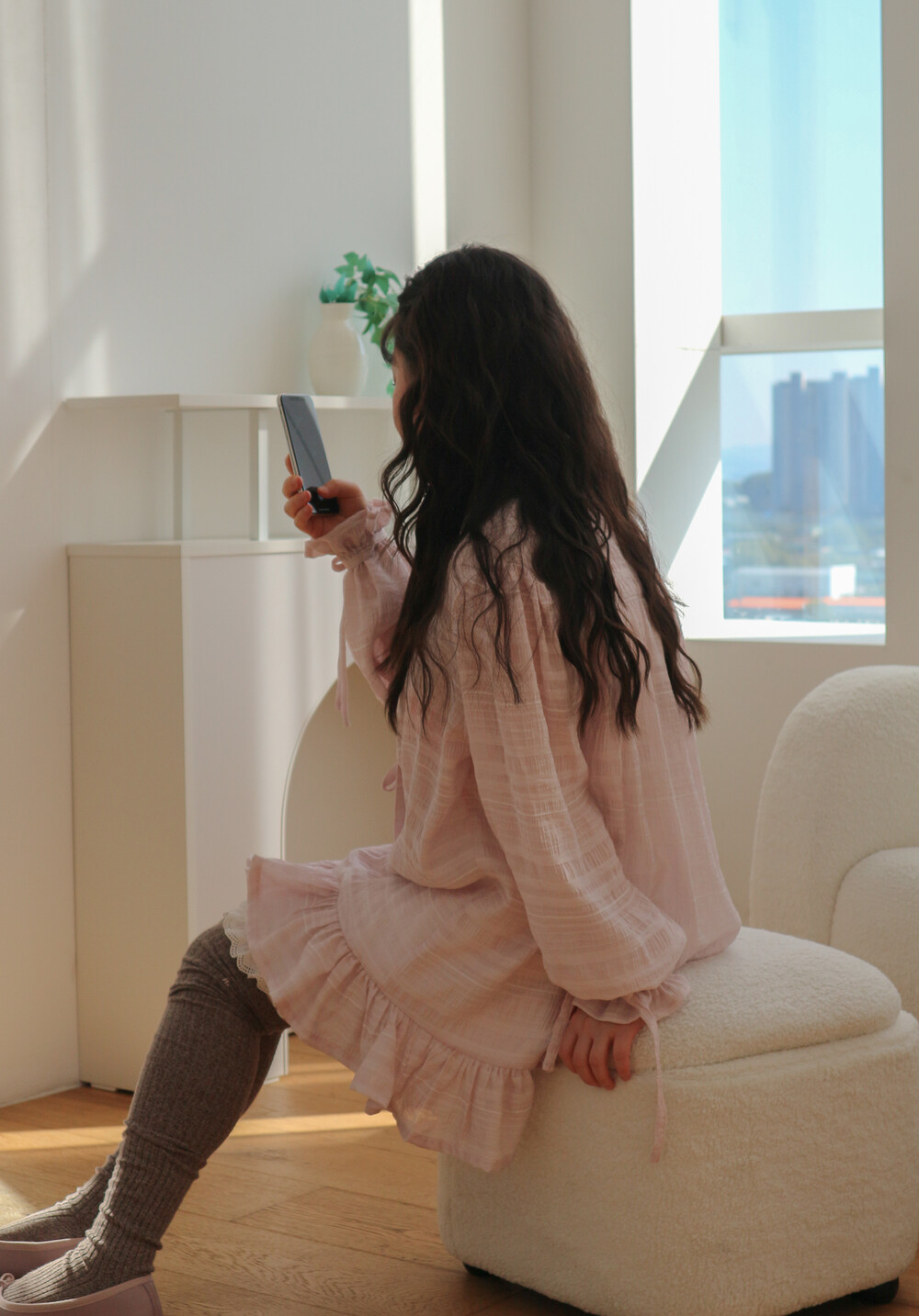 25 소라 링클 프릴 원피스의 아더 컬러로 제작되었으며, 발레코어 무드의 맑은 핑크색과