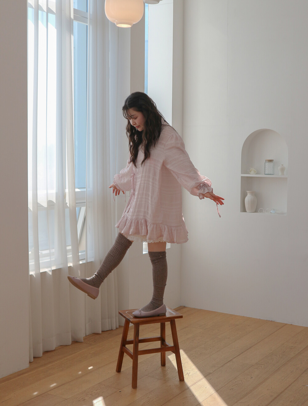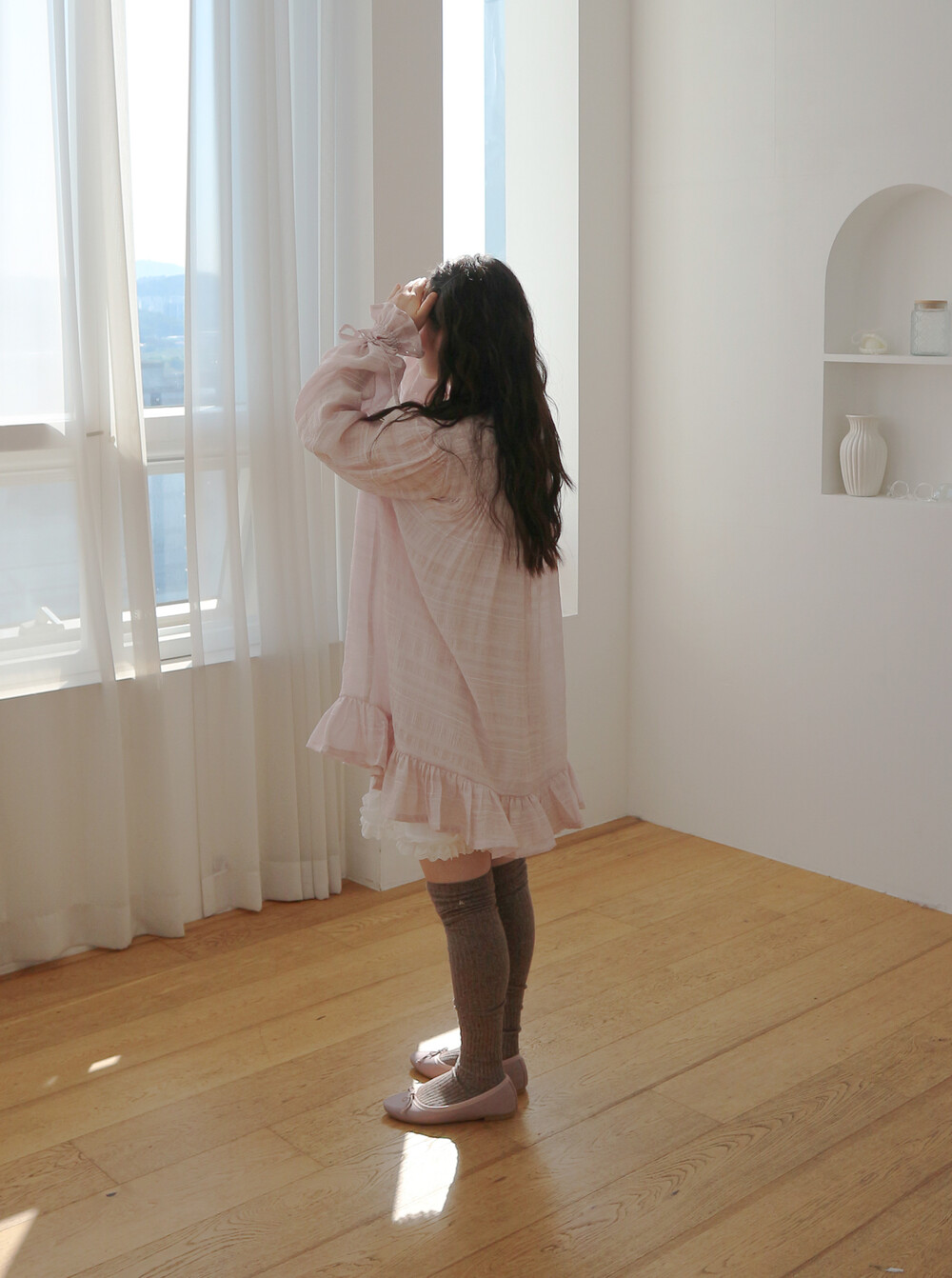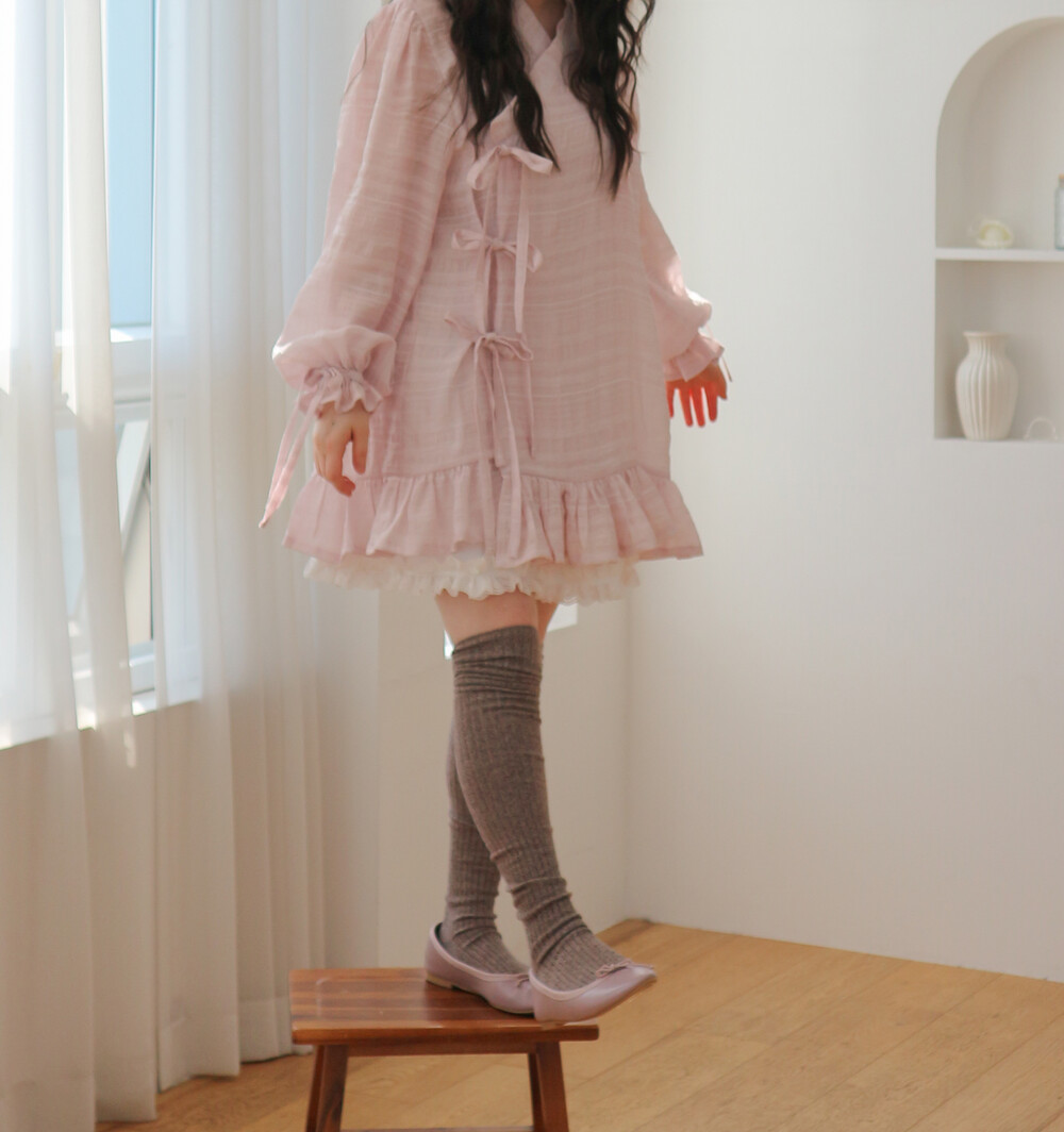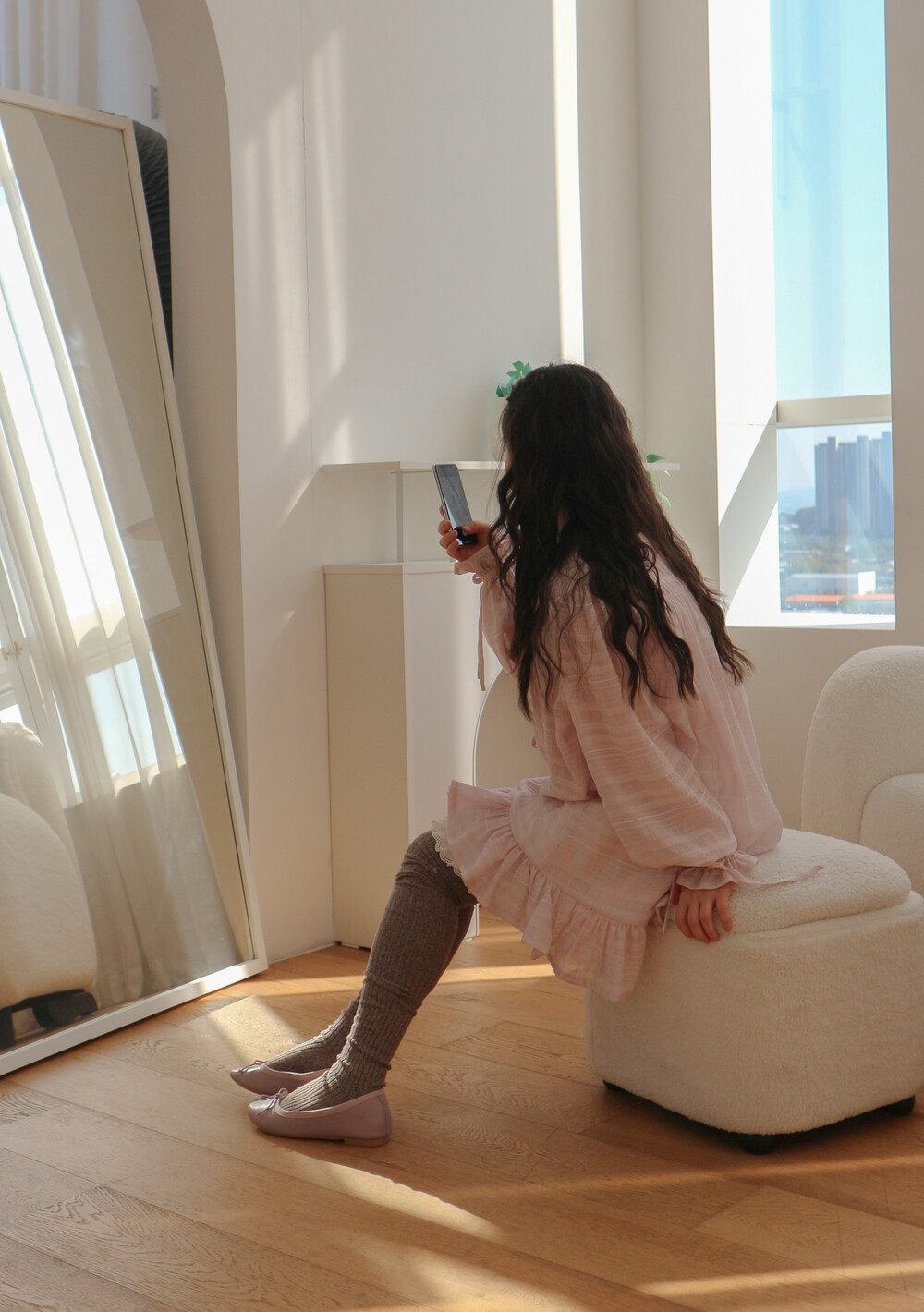 25 소라 링클 프릴 원피스의 아더 컬러로 제작되었으며, 발레코어 무드의 맑은 핑크색과