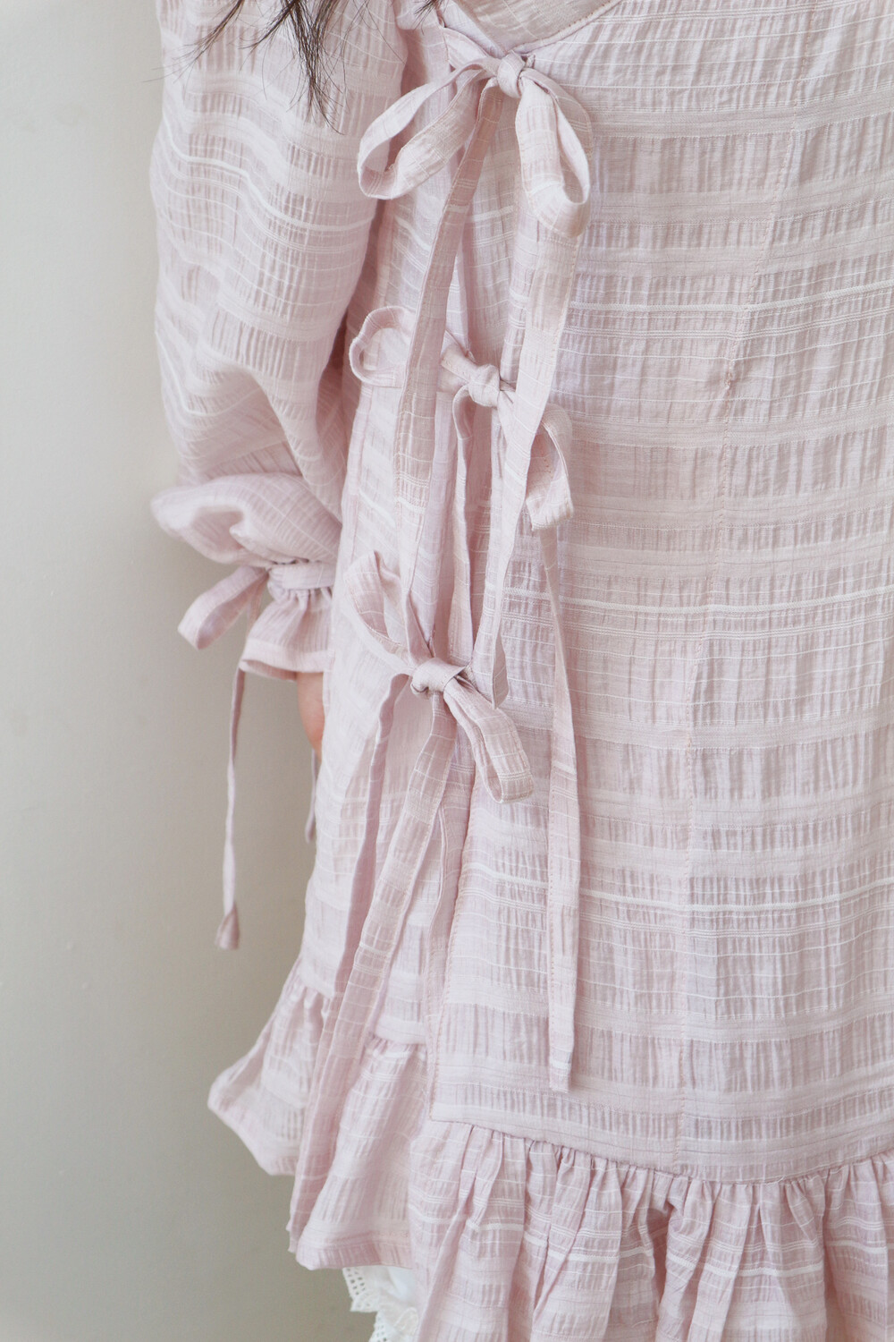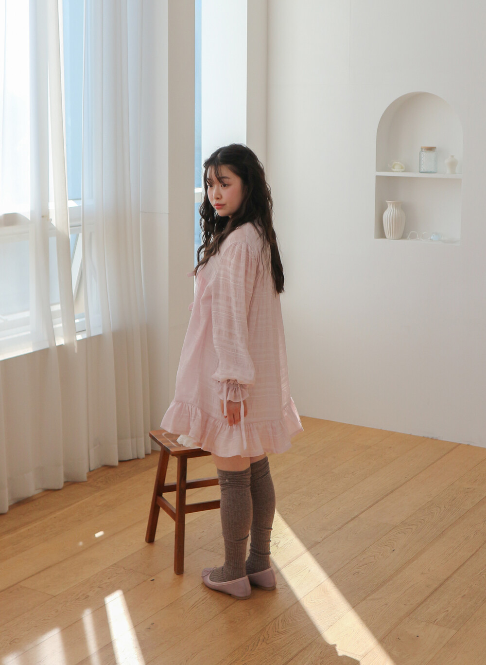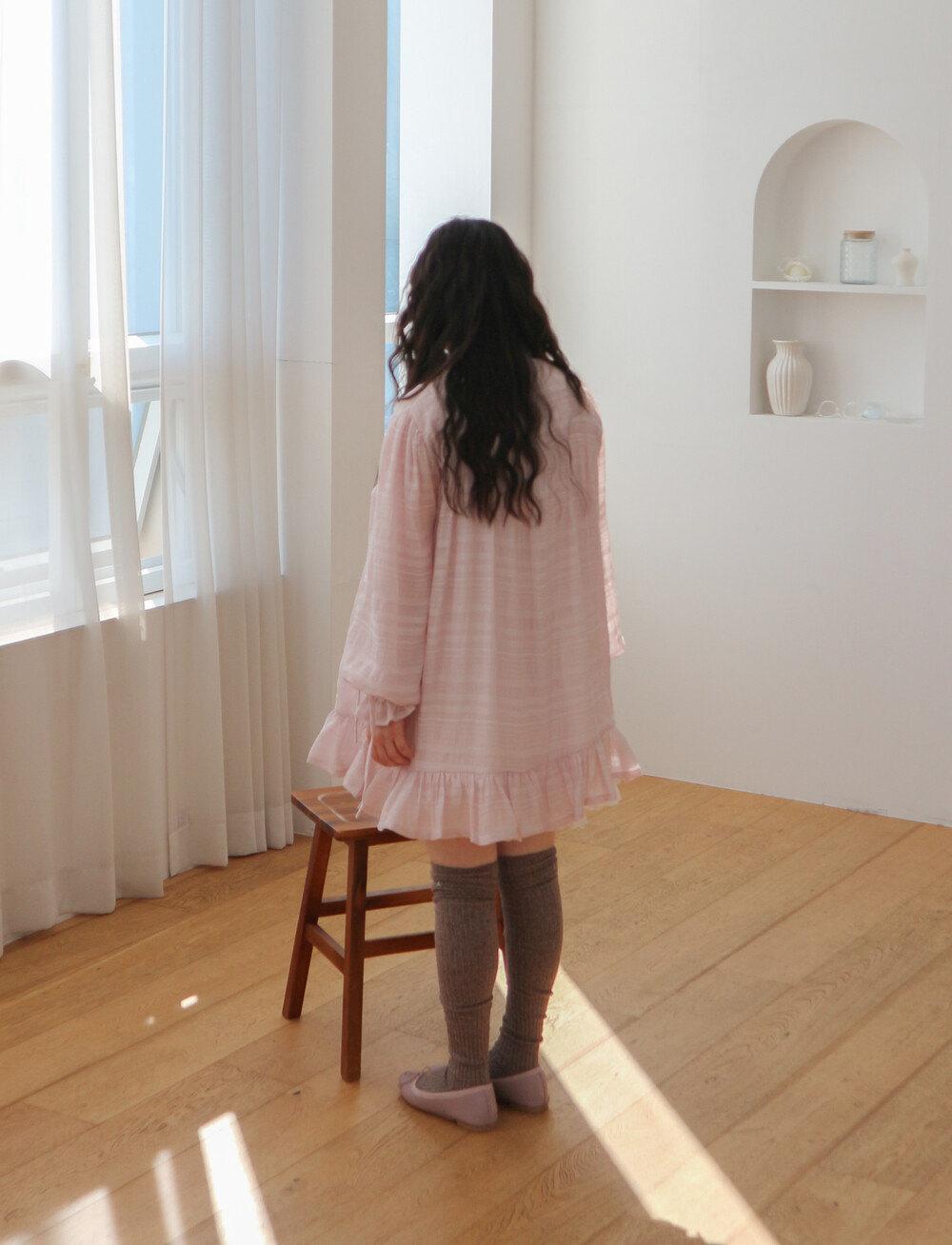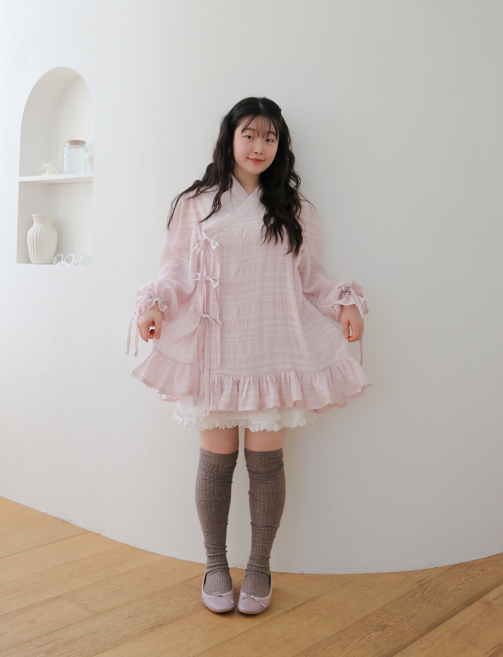 25 소라 링클 프릴 원피스의 아더 컬러로 제작되었으며, 발레코어 무드의 맑은 핑크색과