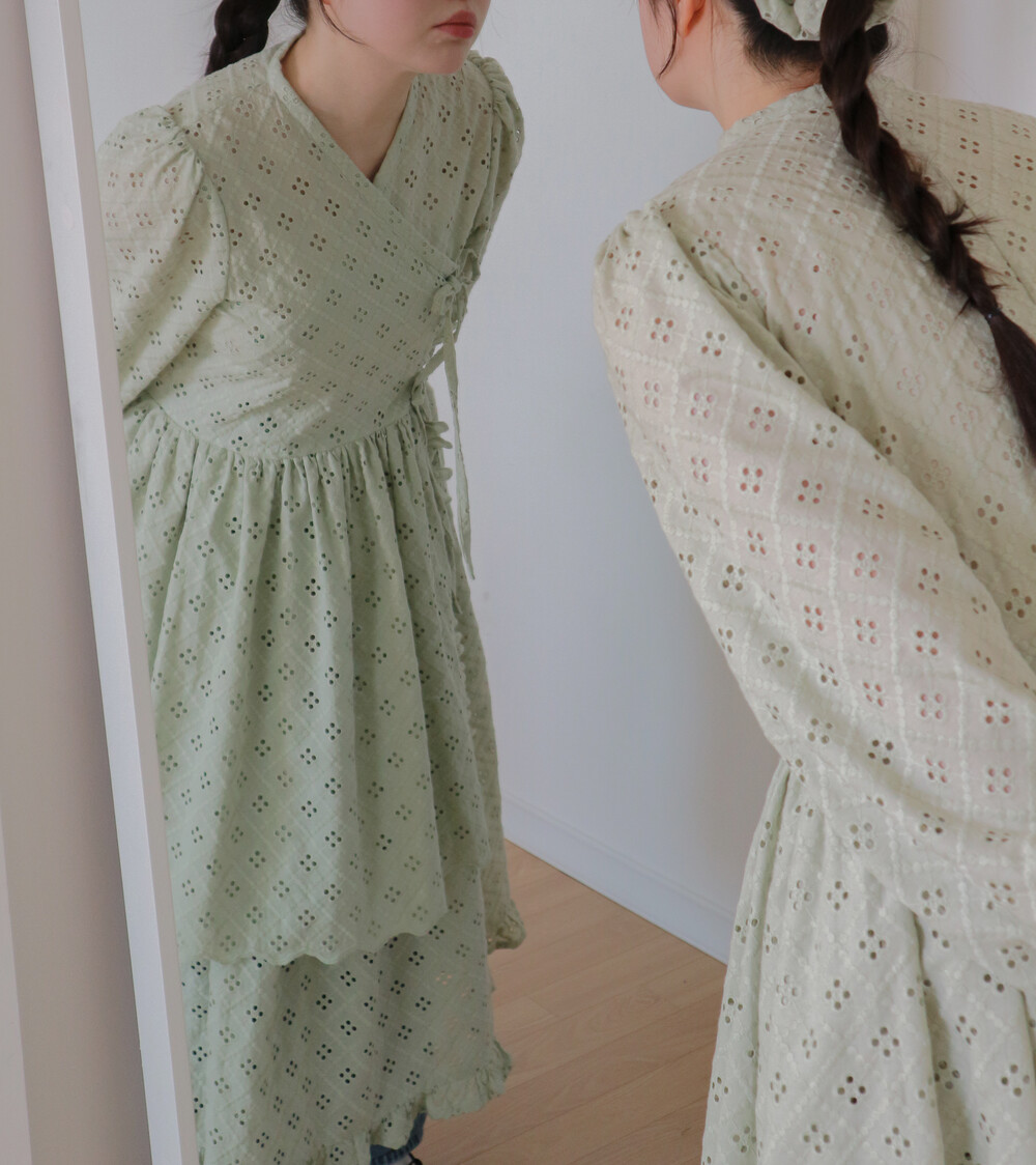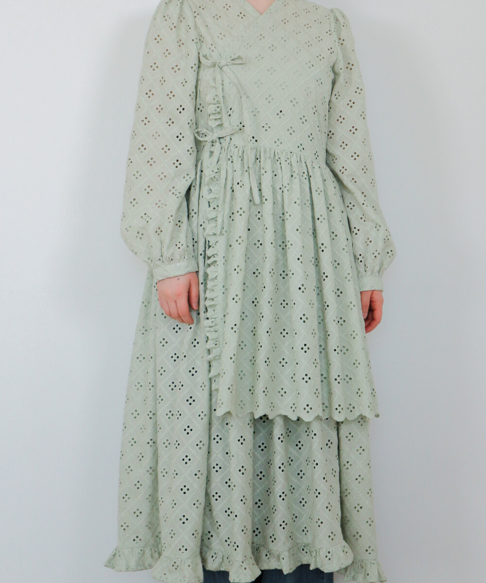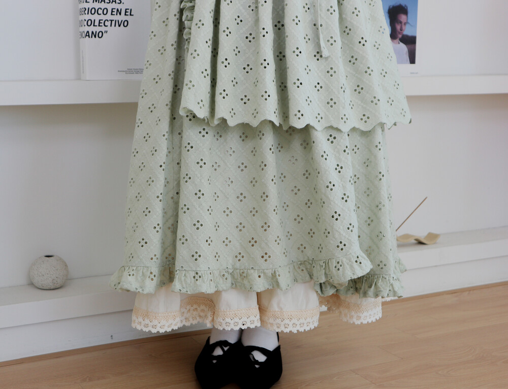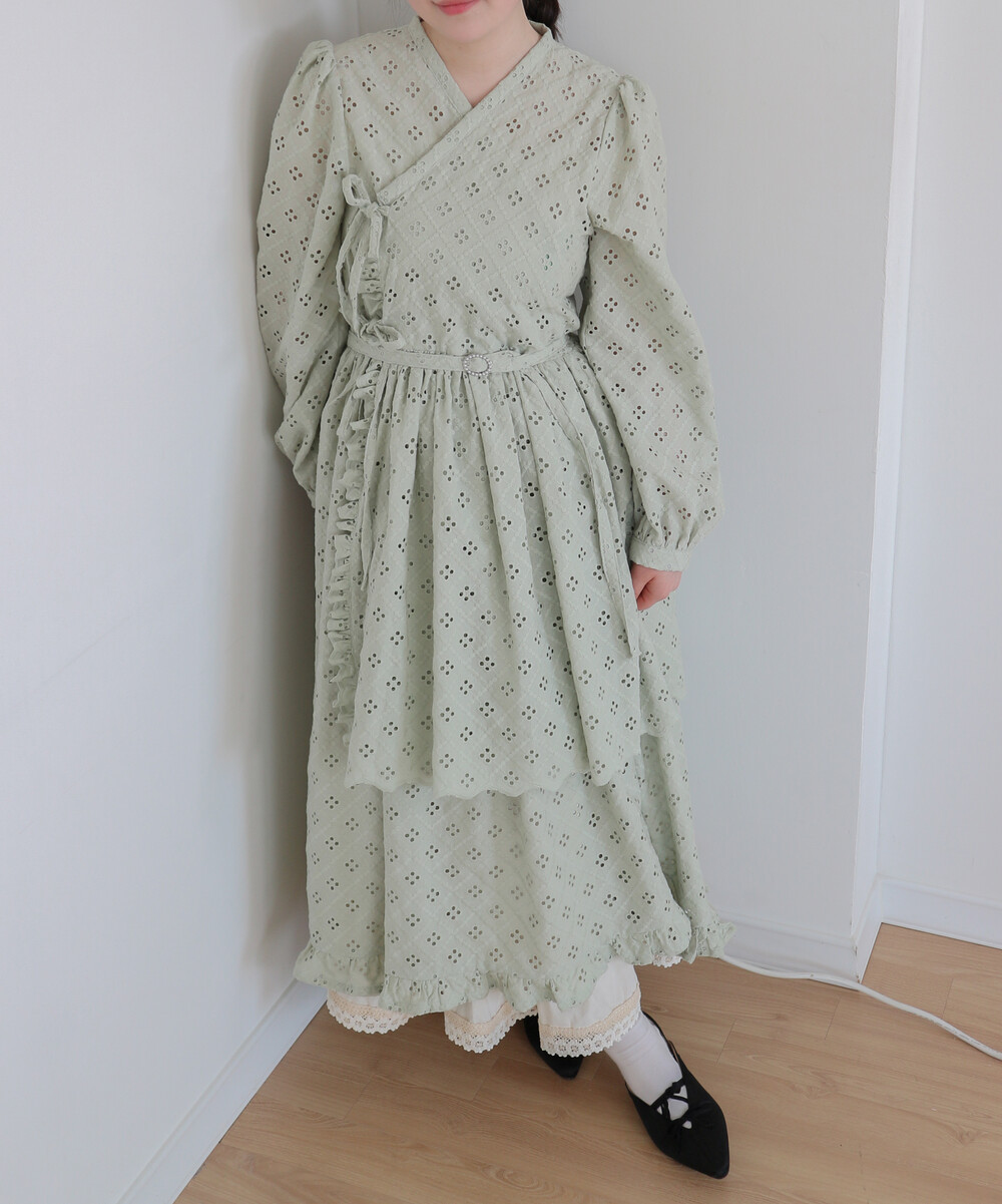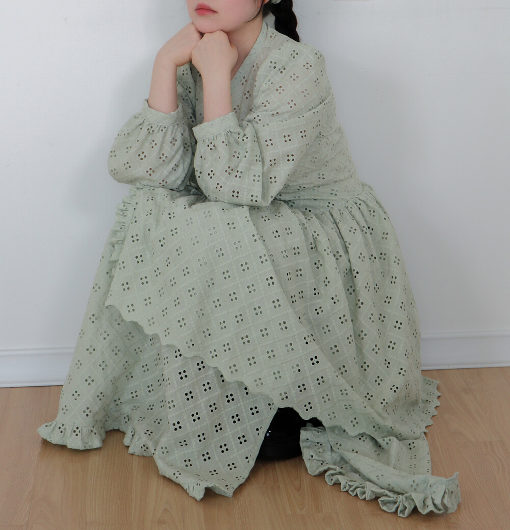 펀칭이 있는 면 레이스 원단으로 제작된 2단의 슬릿 철릭 원피스입니다.
