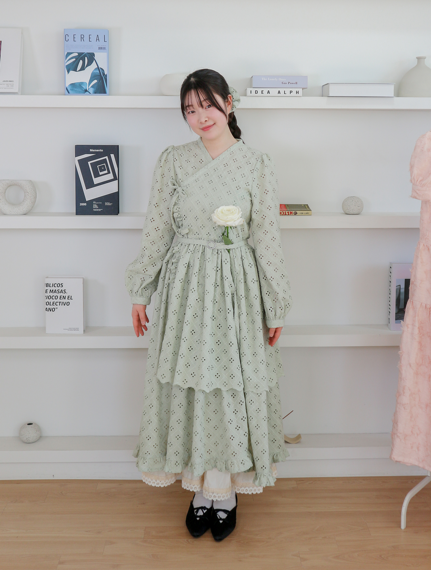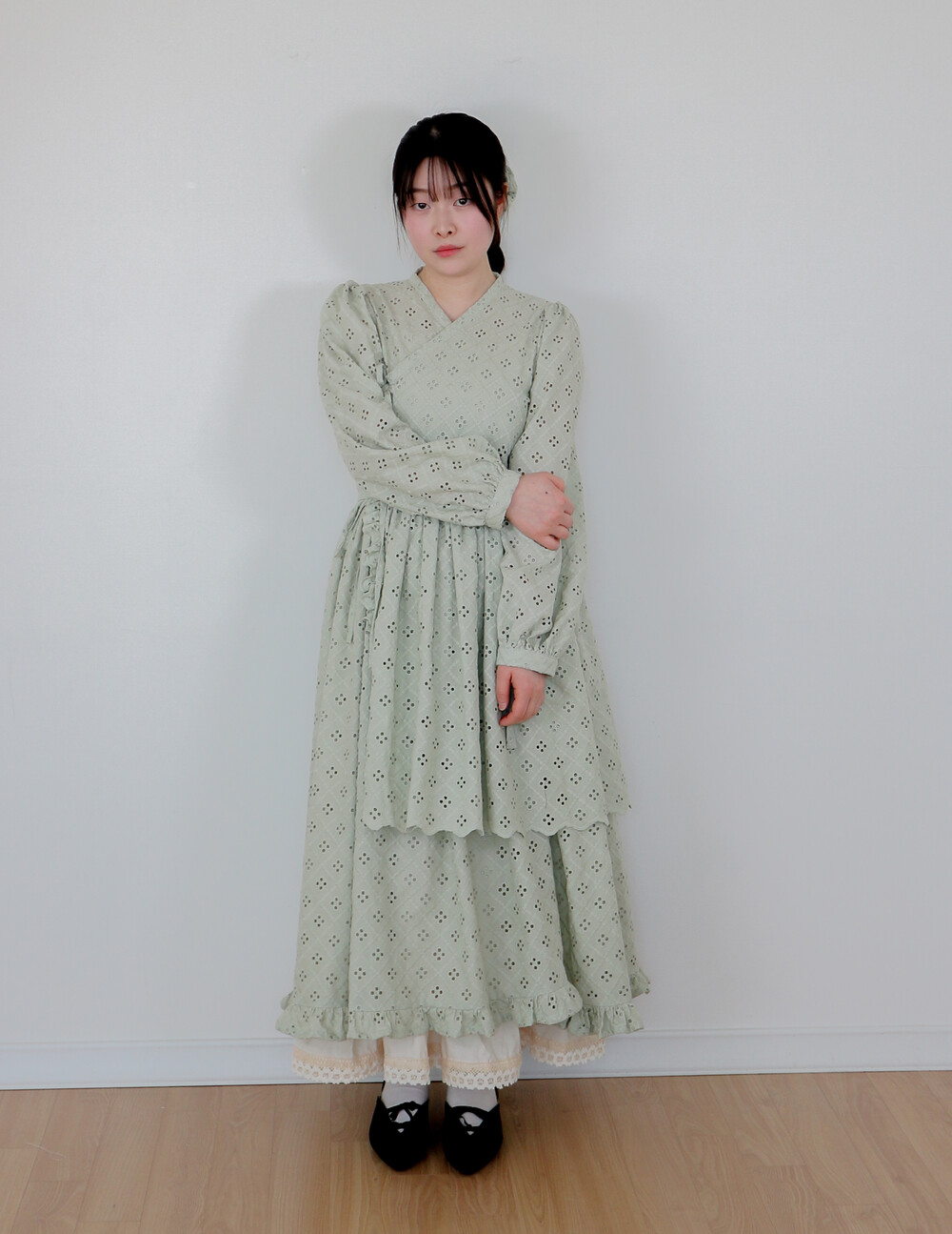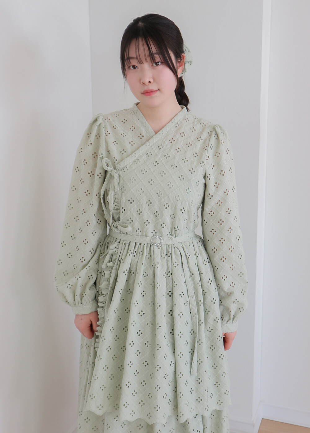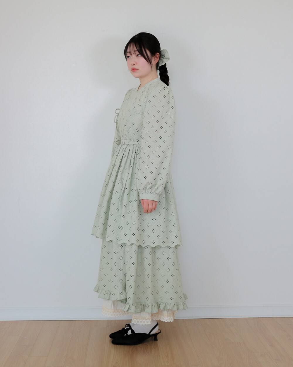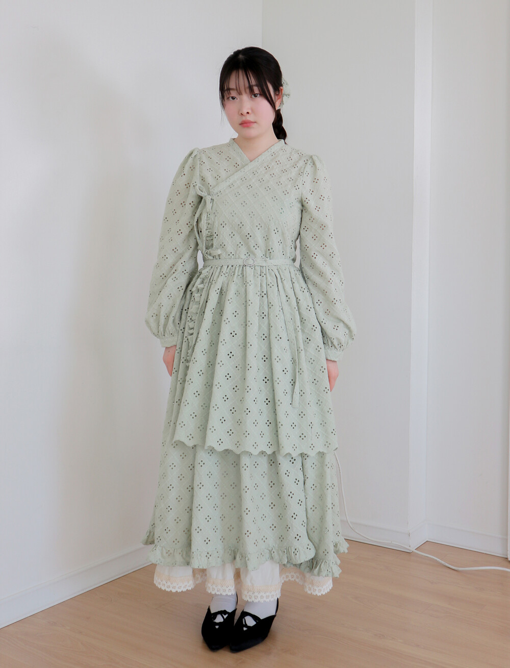 펀칭이 있는 면 레이스 원단으로 제작된 2단의 슬릿 철릭 원피스입니다.