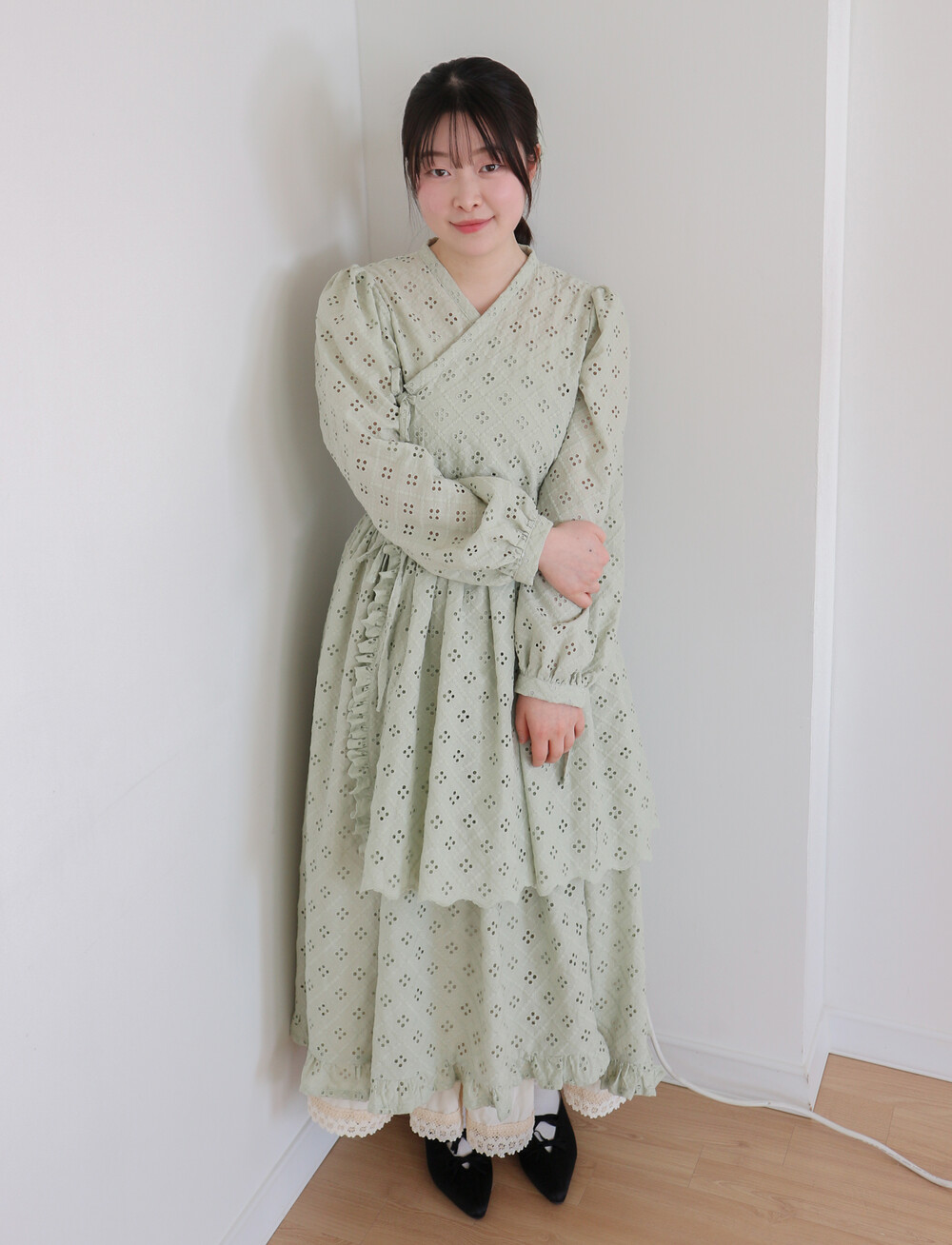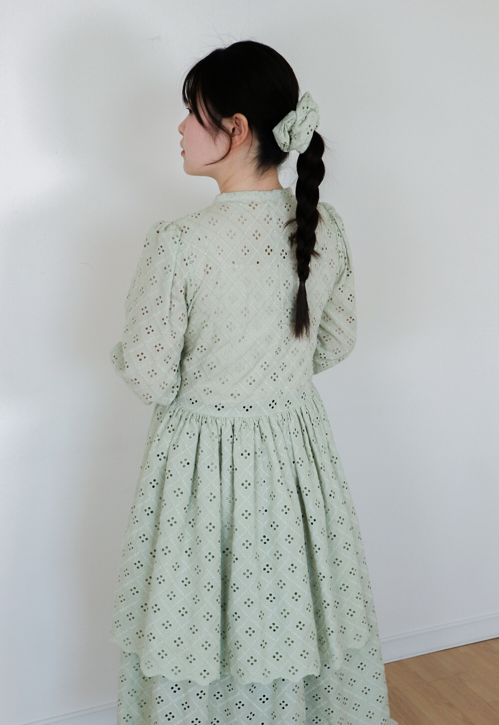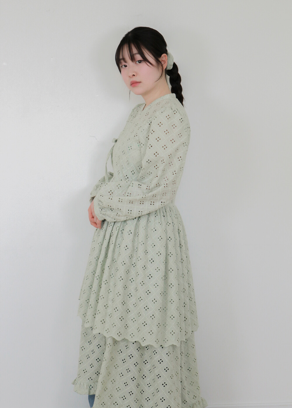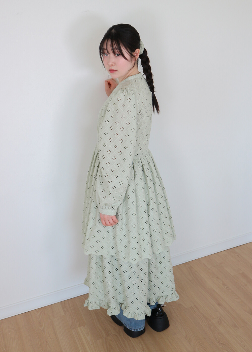 원단에 펀칭이 있어 비침이 있고, 긴 기장으로 제작되어 사랑스러운 느낌을 줍니다.