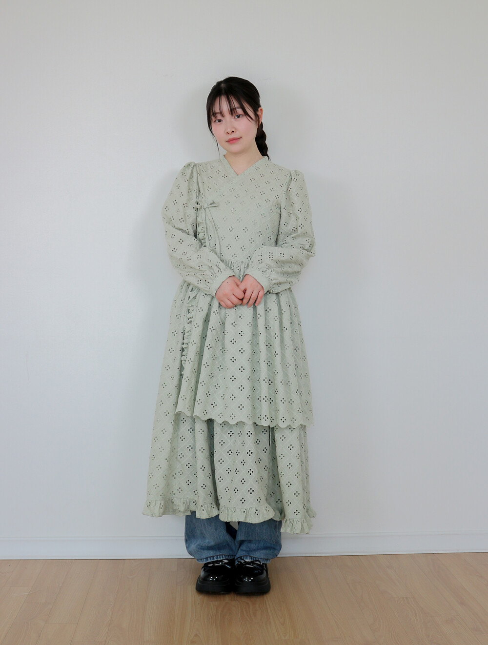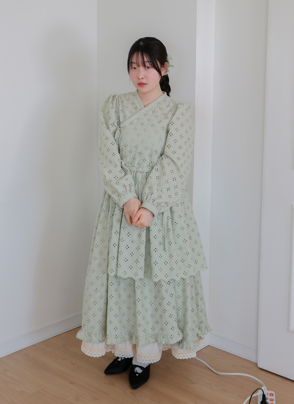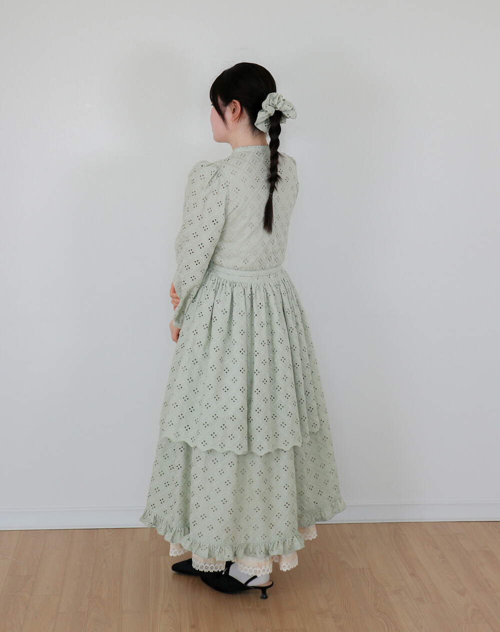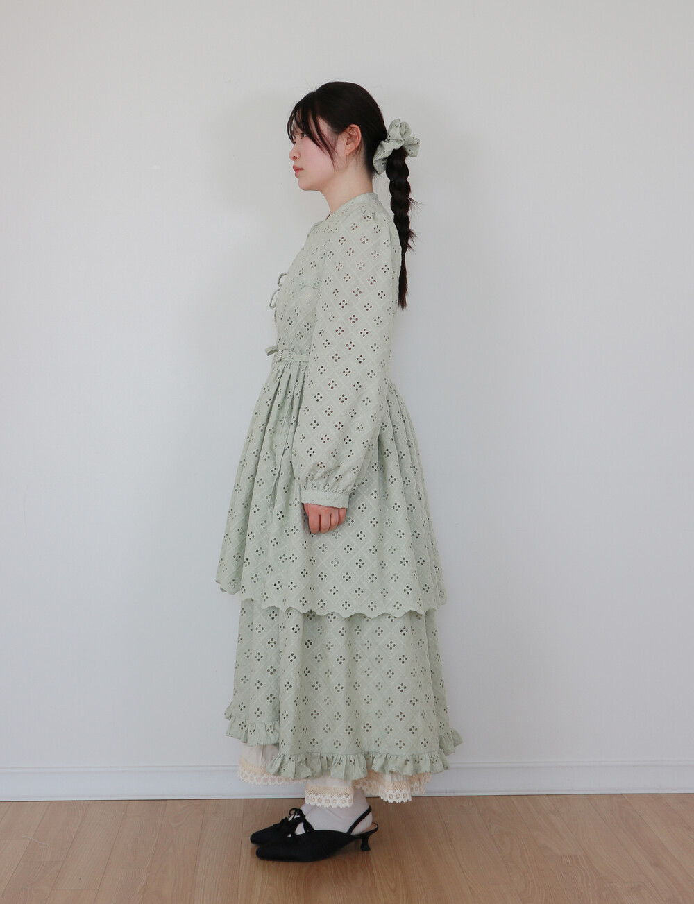 원단에 펀칭이 있어 비침이 있고, 긴 기장으로 제작되어 사랑스러운 느낌을 줍니다.