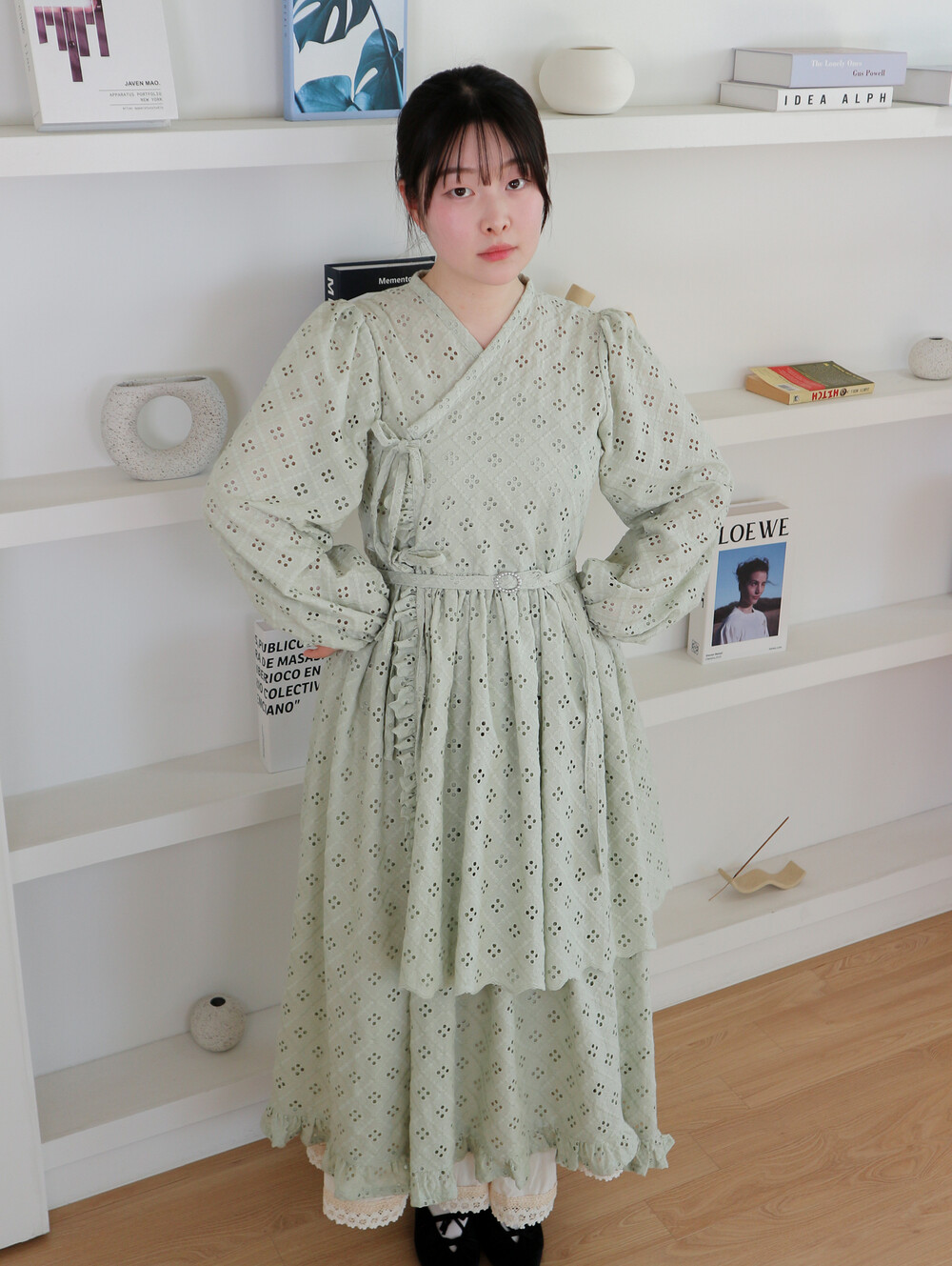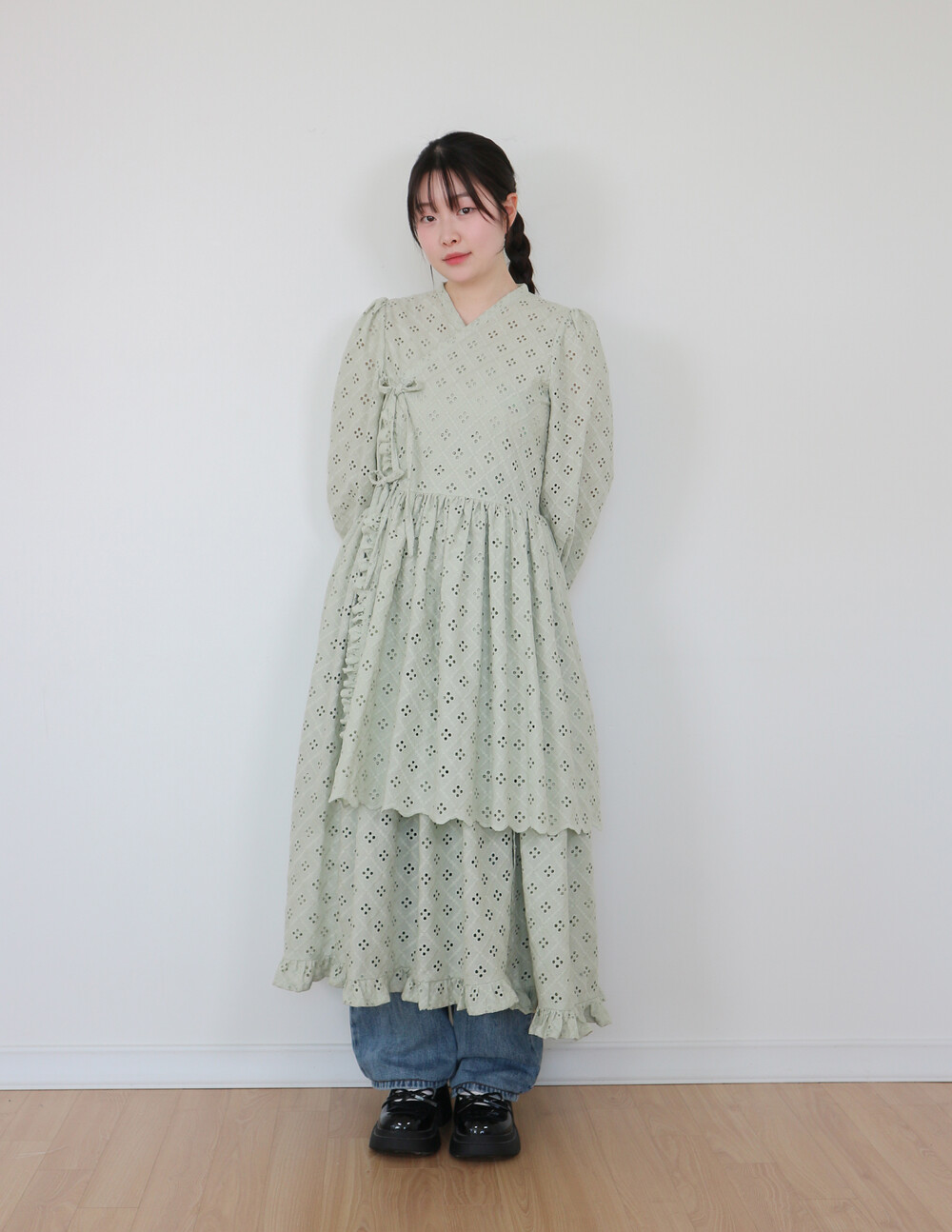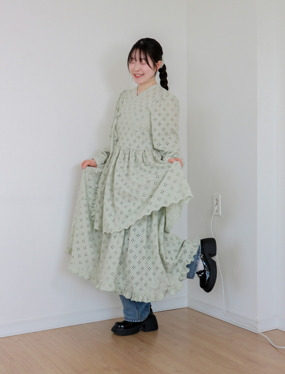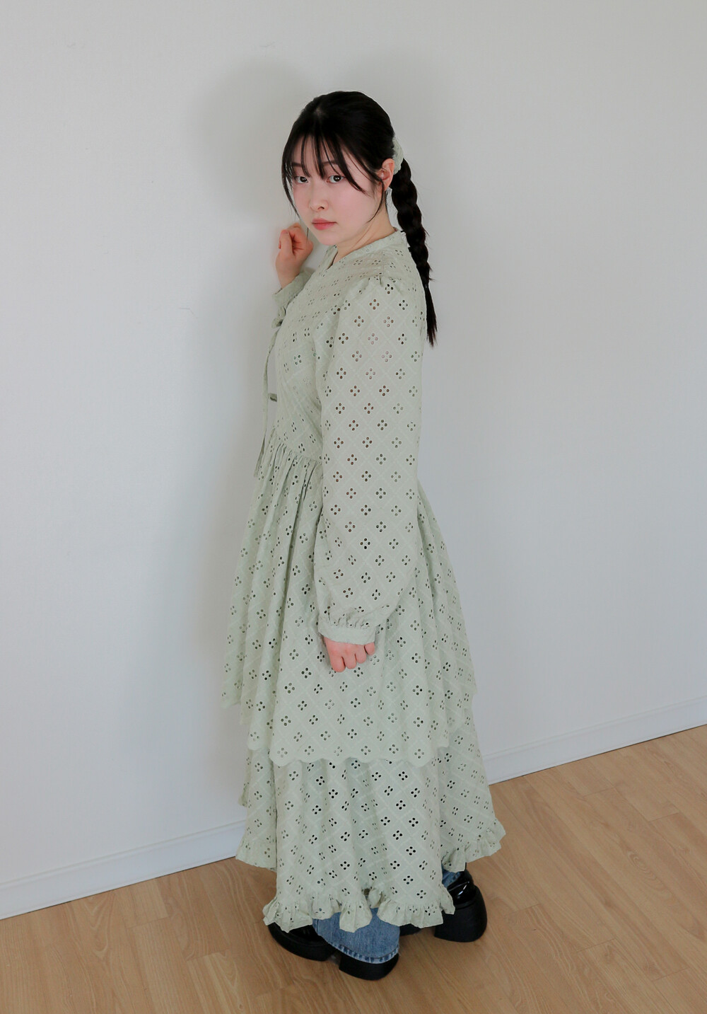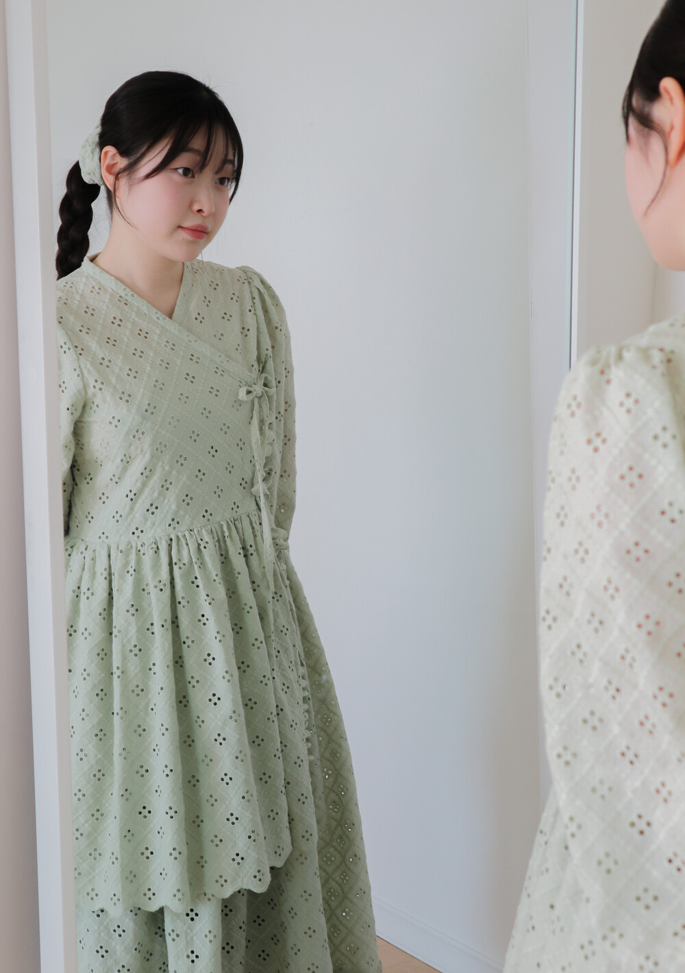 원단에 펀칭이 있어 비침이 있고, 긴 기장으로 제작되어 사랑스러운 느낌을 줍니다.