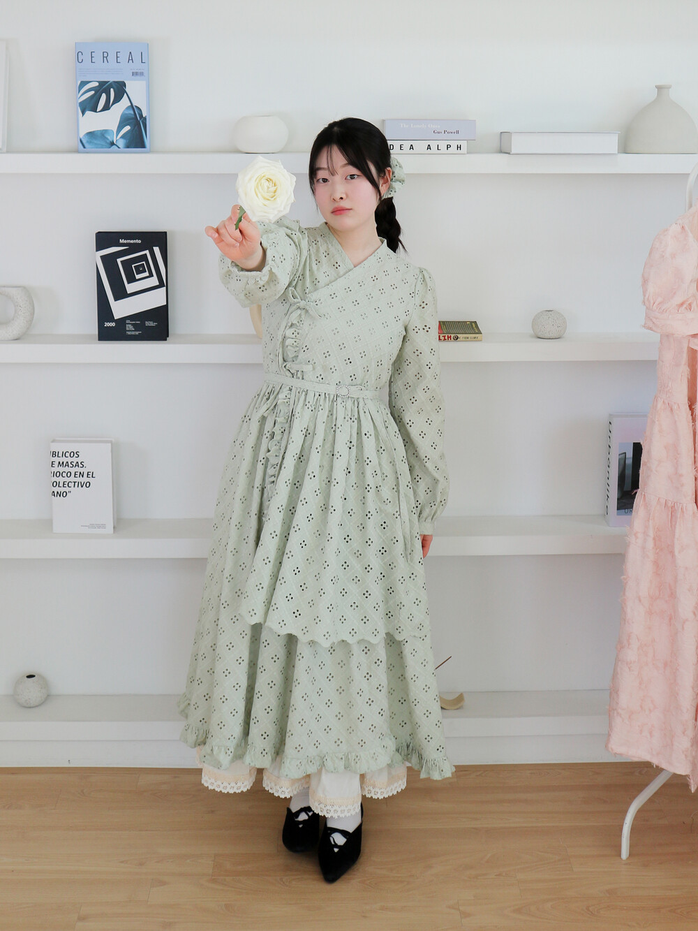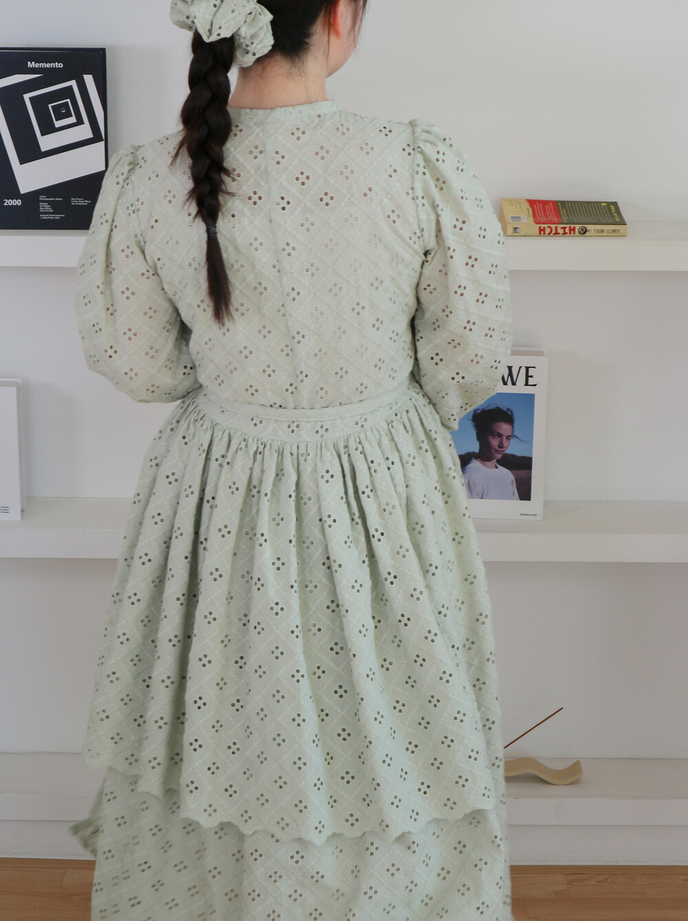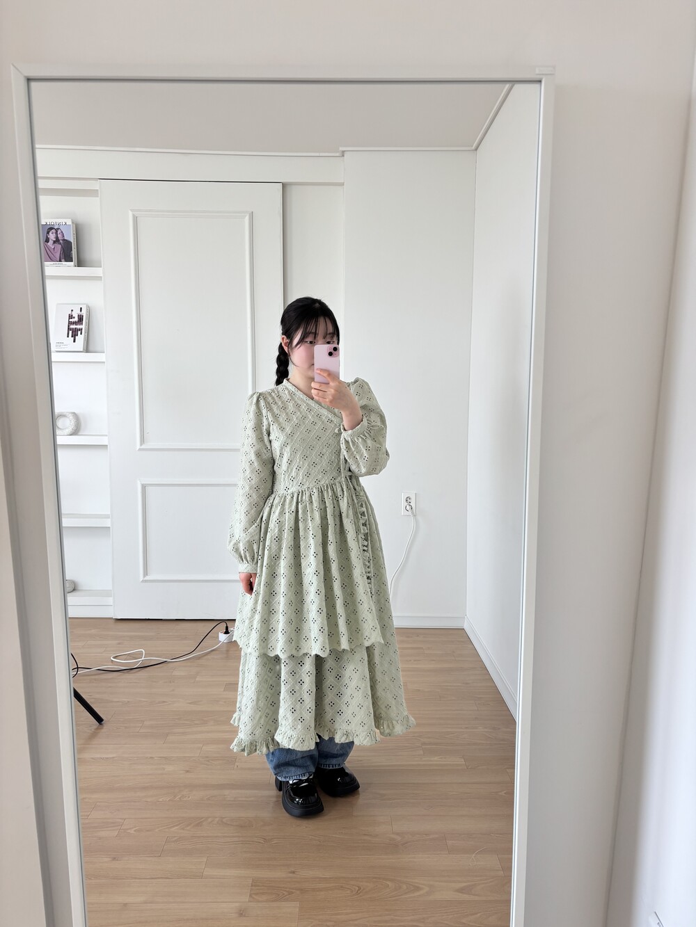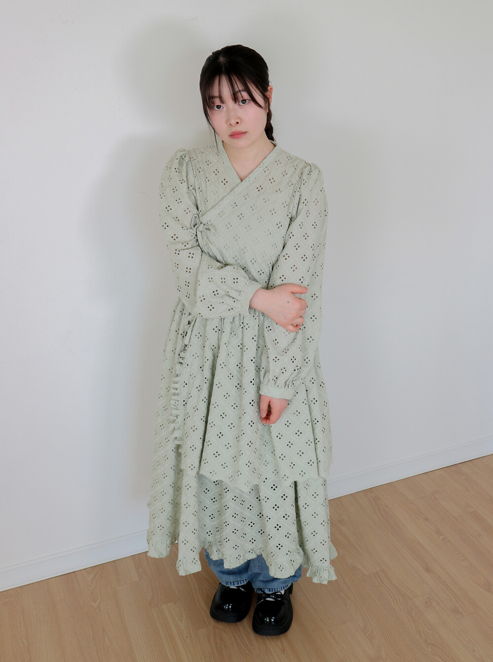 원단에 펀칭이 있어 비침이 있고, 긴 기장으로 제작되어 사랑스러운 느낌을 줍니다.