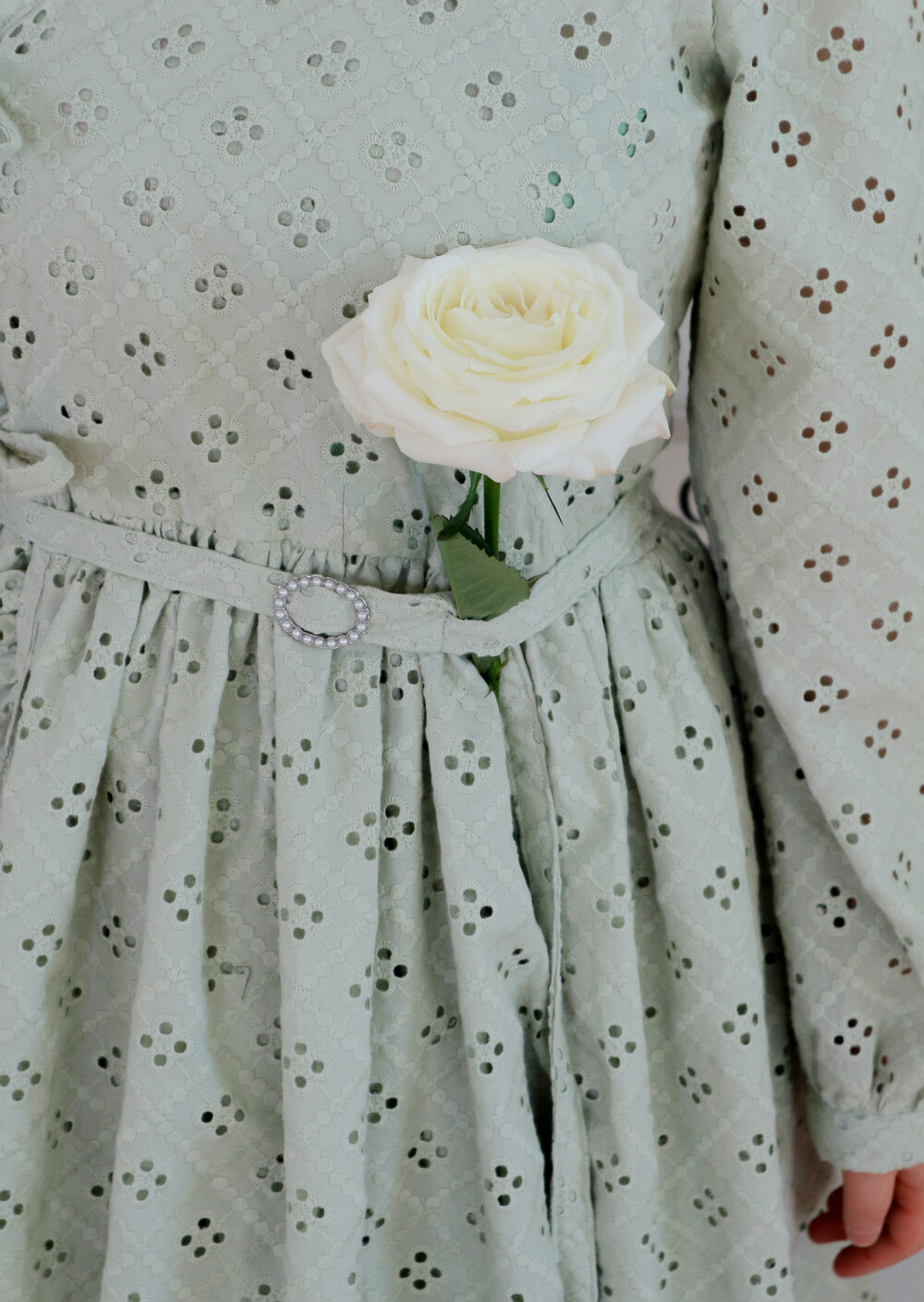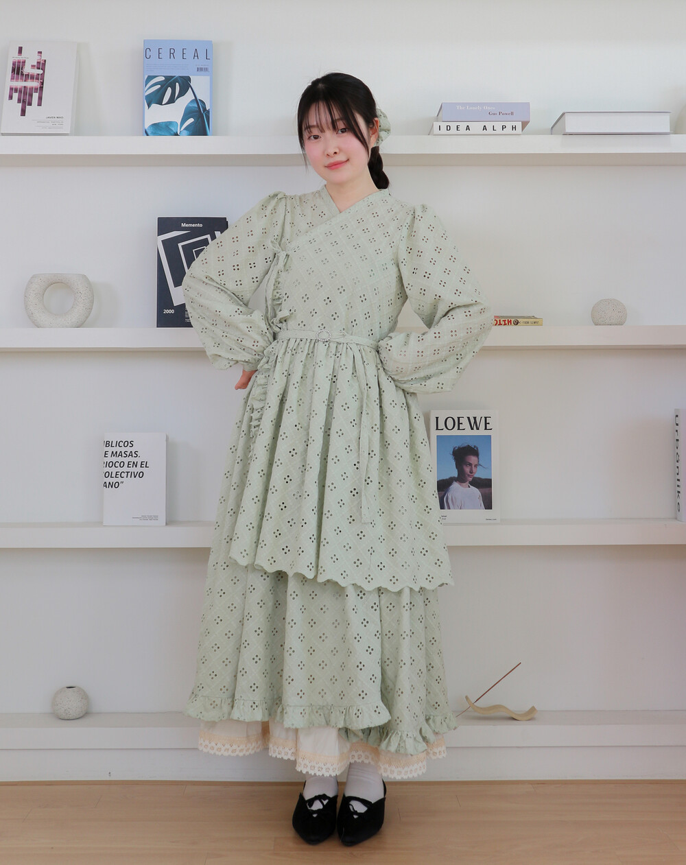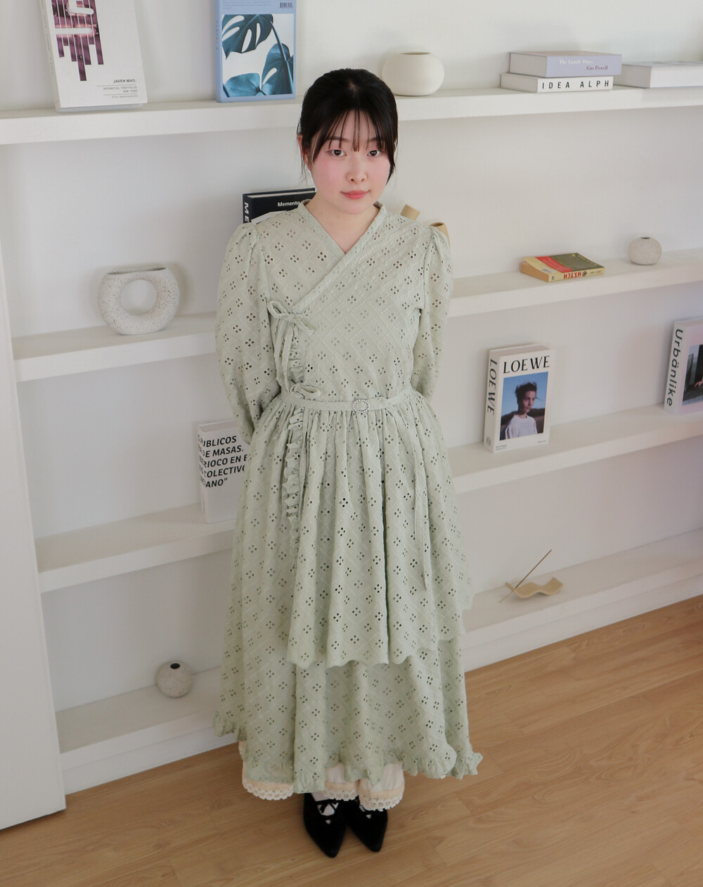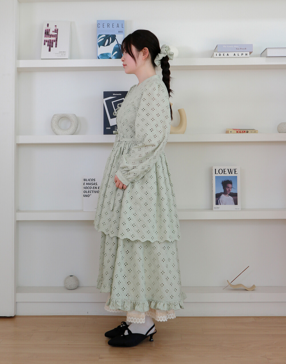 원단에 펀칭이 있어 비침이 있고, 긴 기장으로 제작되어 사랑스러운 느낌을 줍니다.
