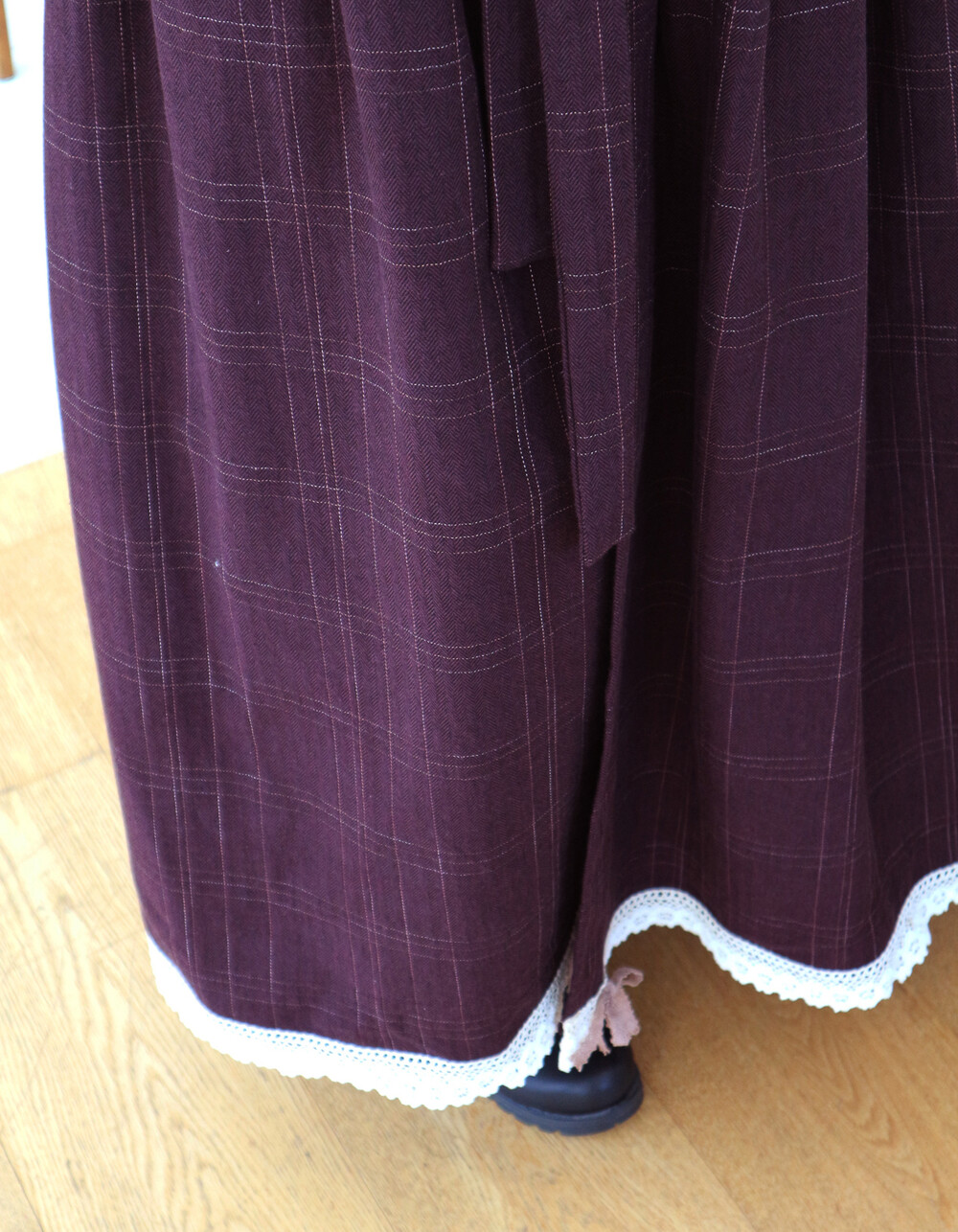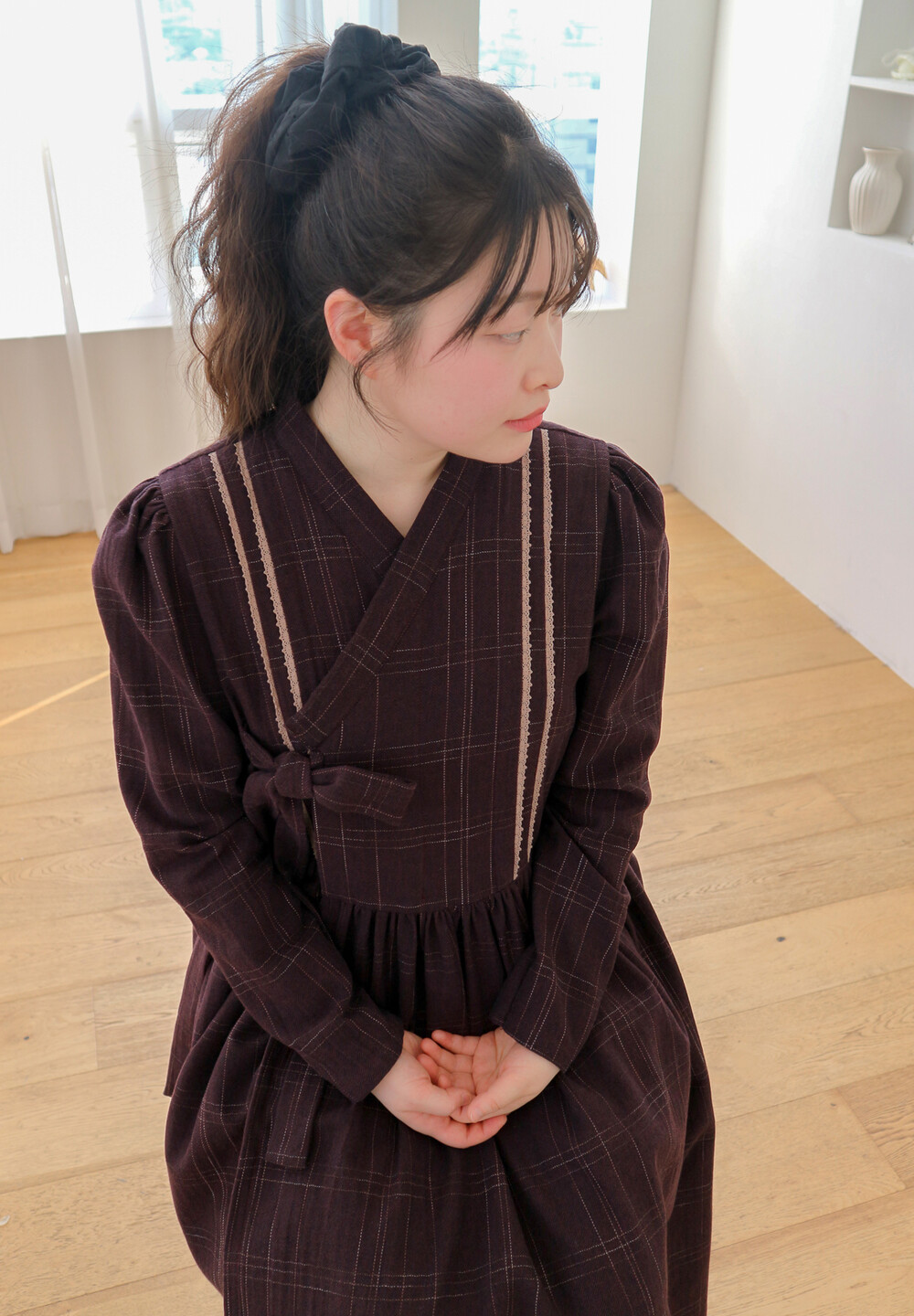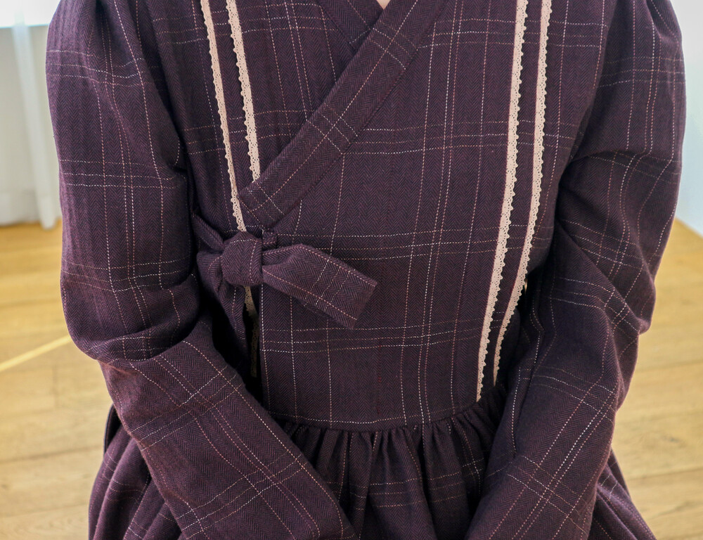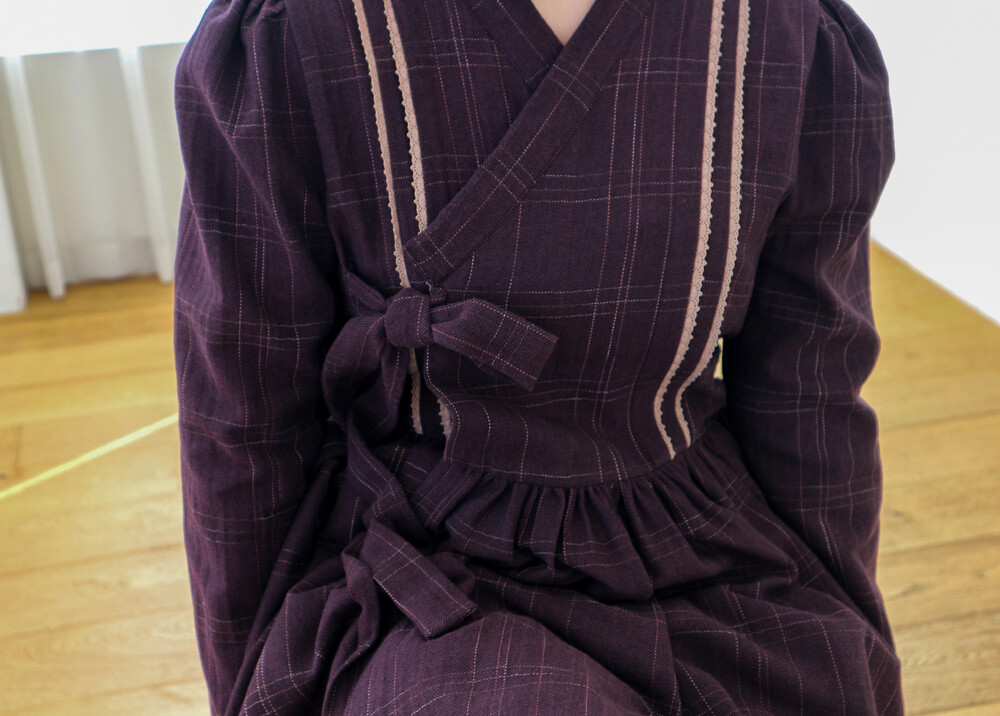 놓여져있는 체크 원단으로 제작된 철릭 원피스입니다. 상의 부분에 핀턱을 잡고