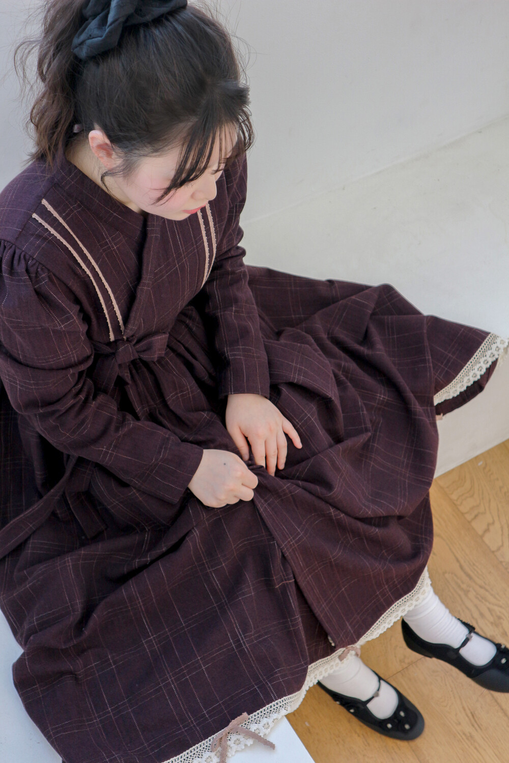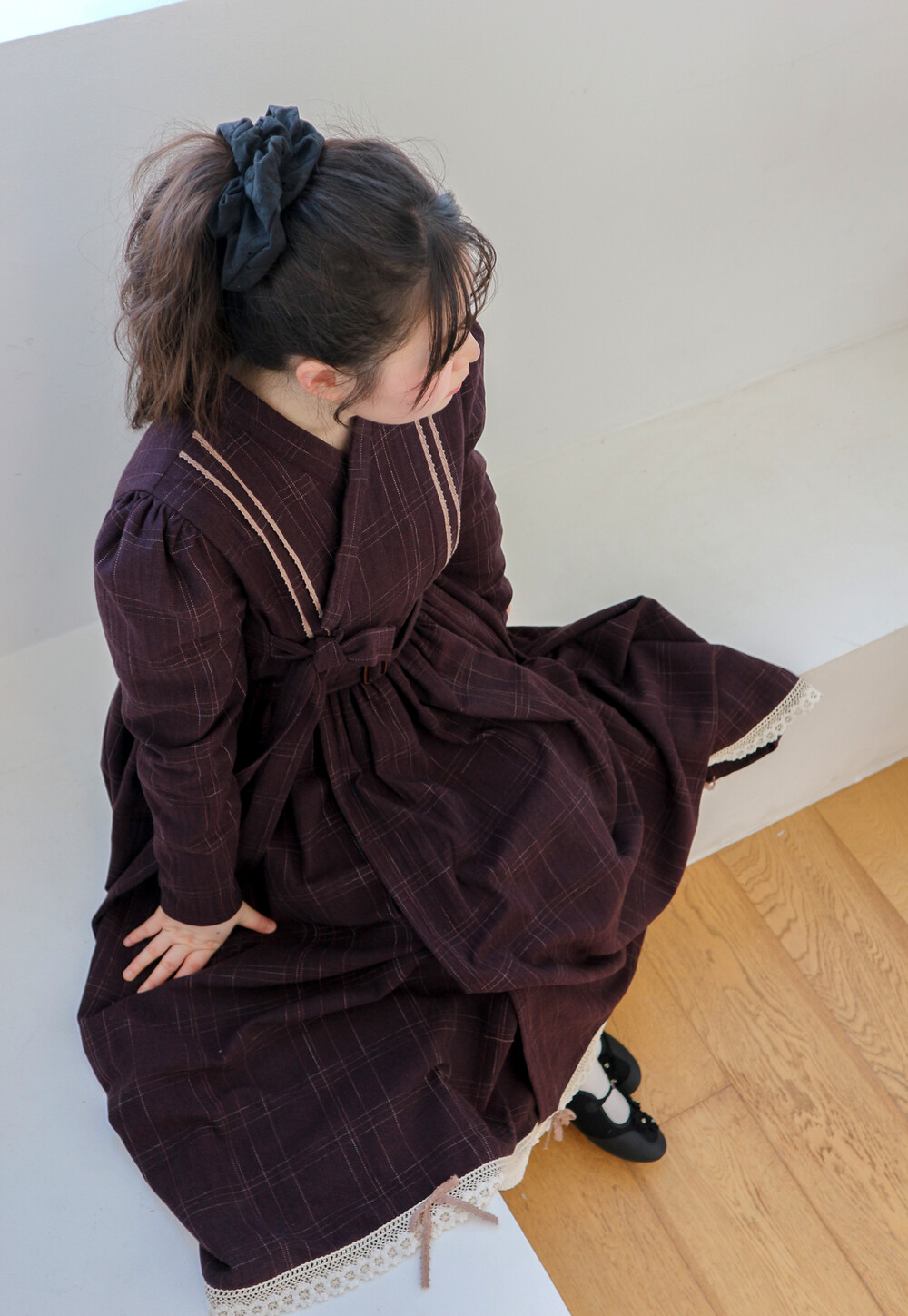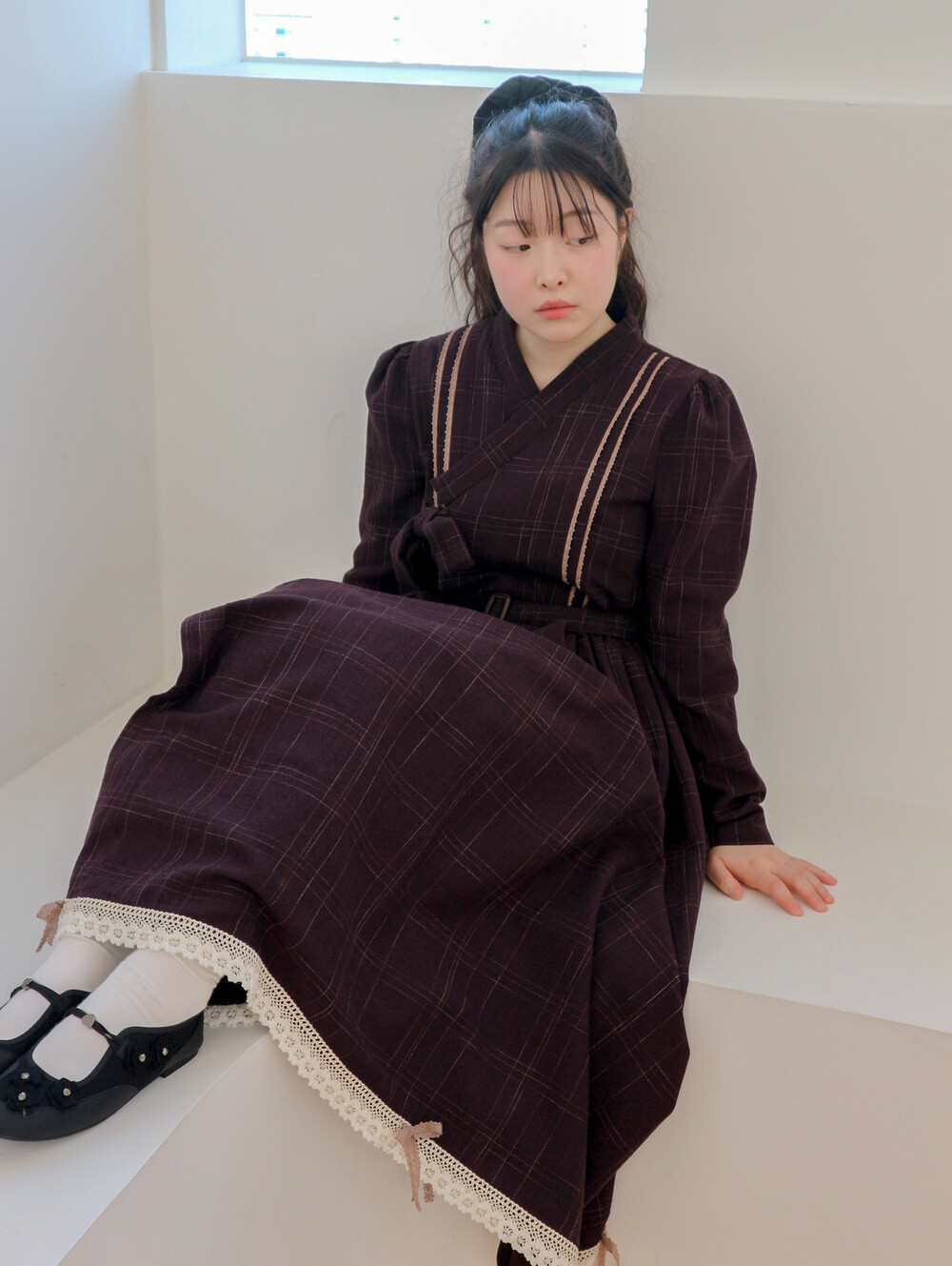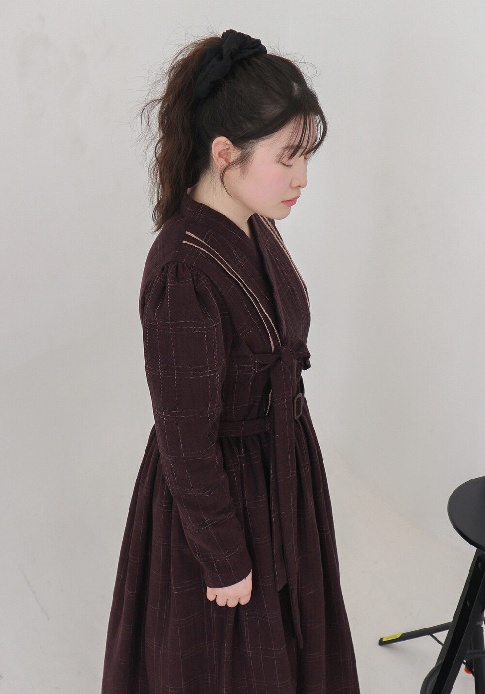 놓여져있는 체크 원단으로 제작된 철릭 원피스입니다. 상의 부분에 핀턱을 잡고