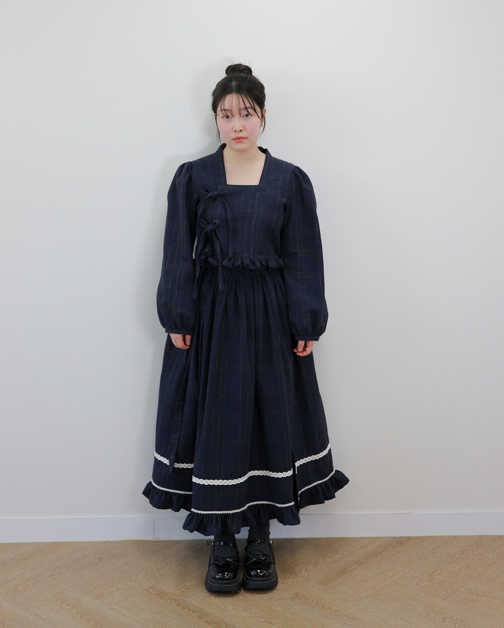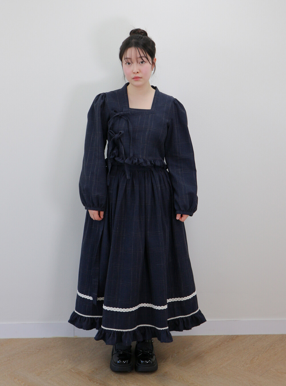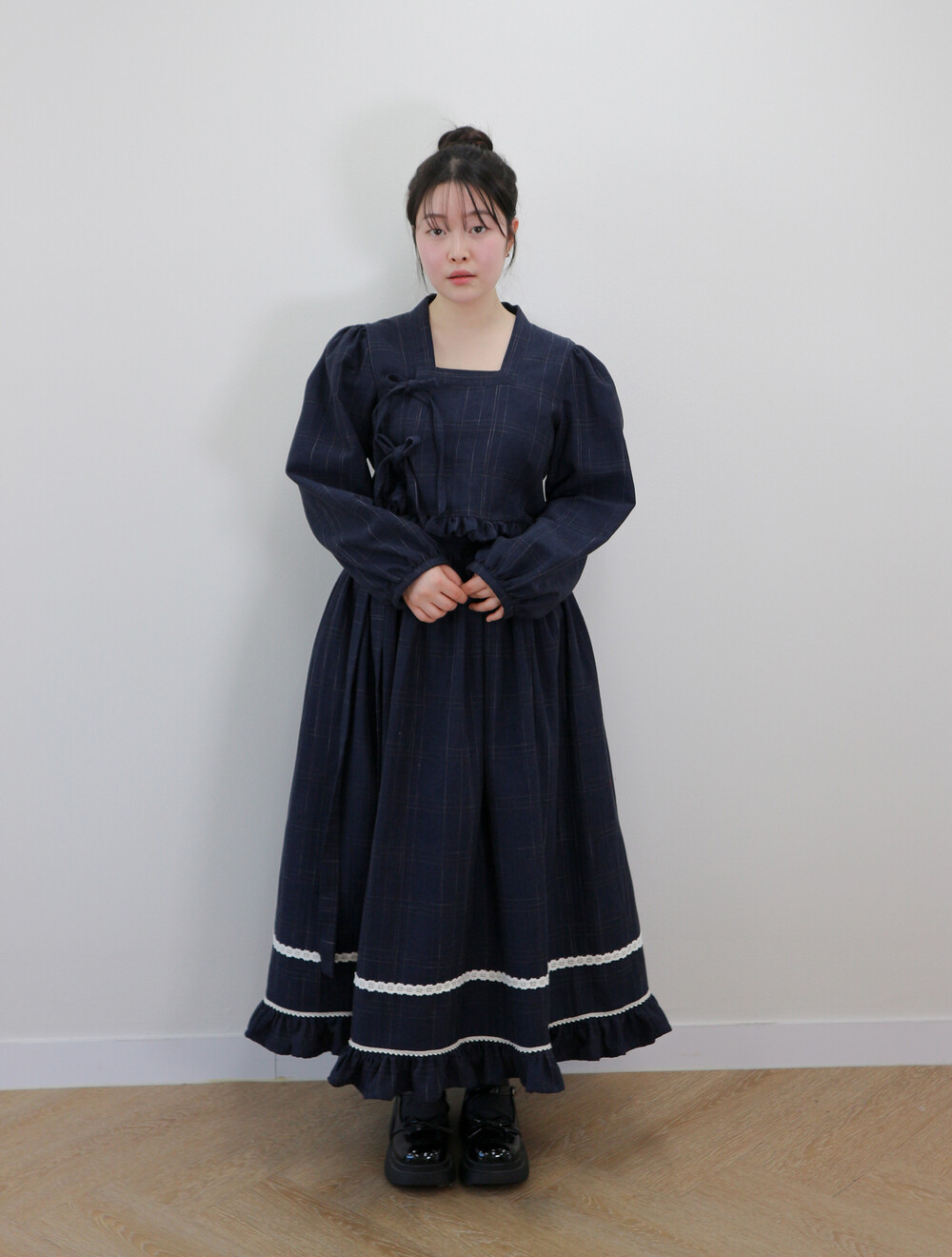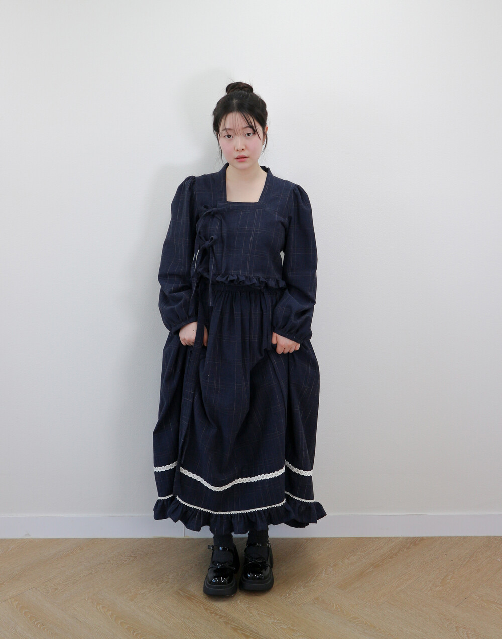 스티치가 놓여져있는 체크 원단으로 제작된 프릴 저고리와 허리치마입니다.
