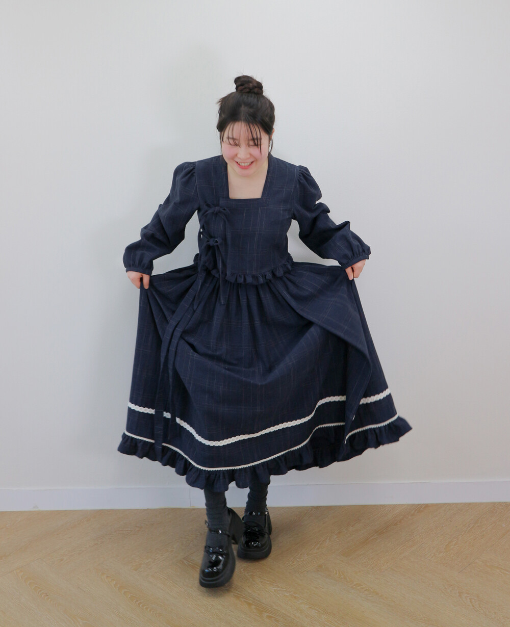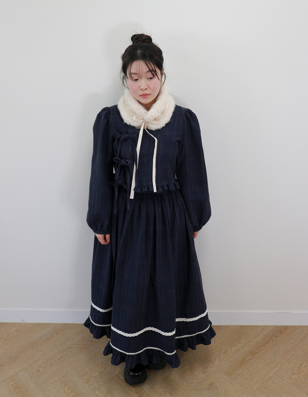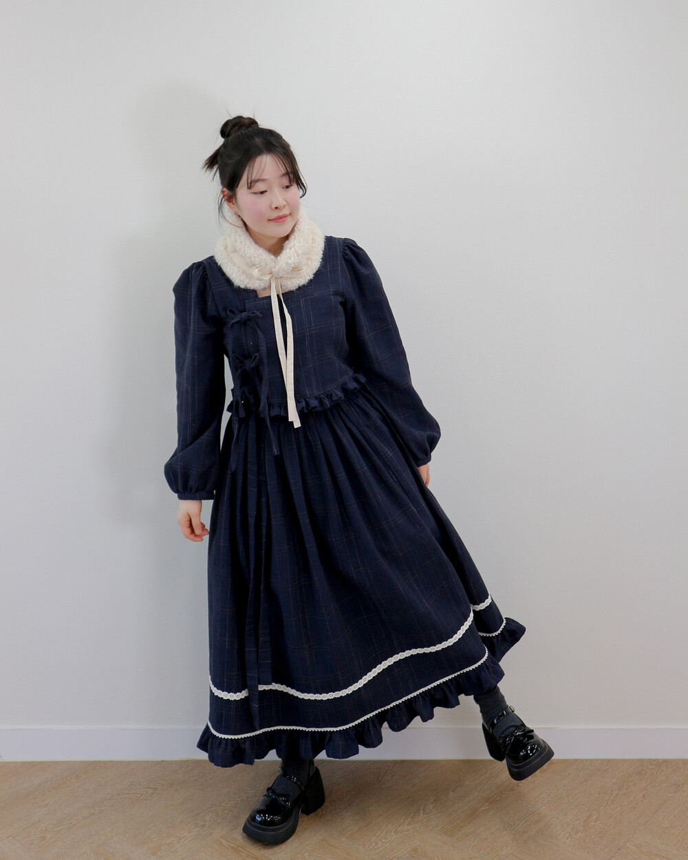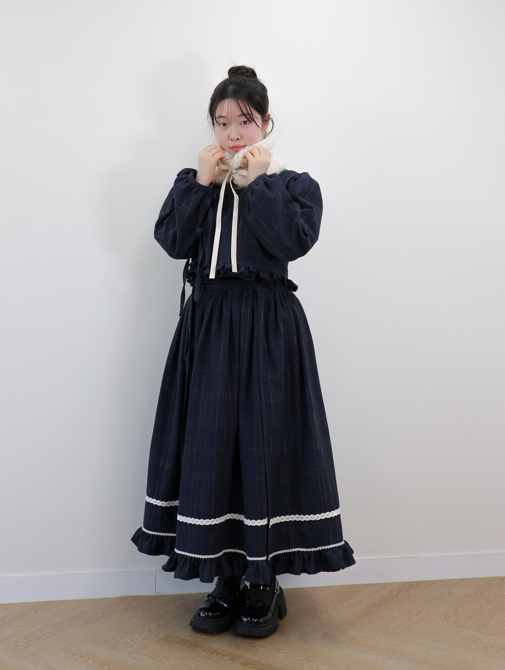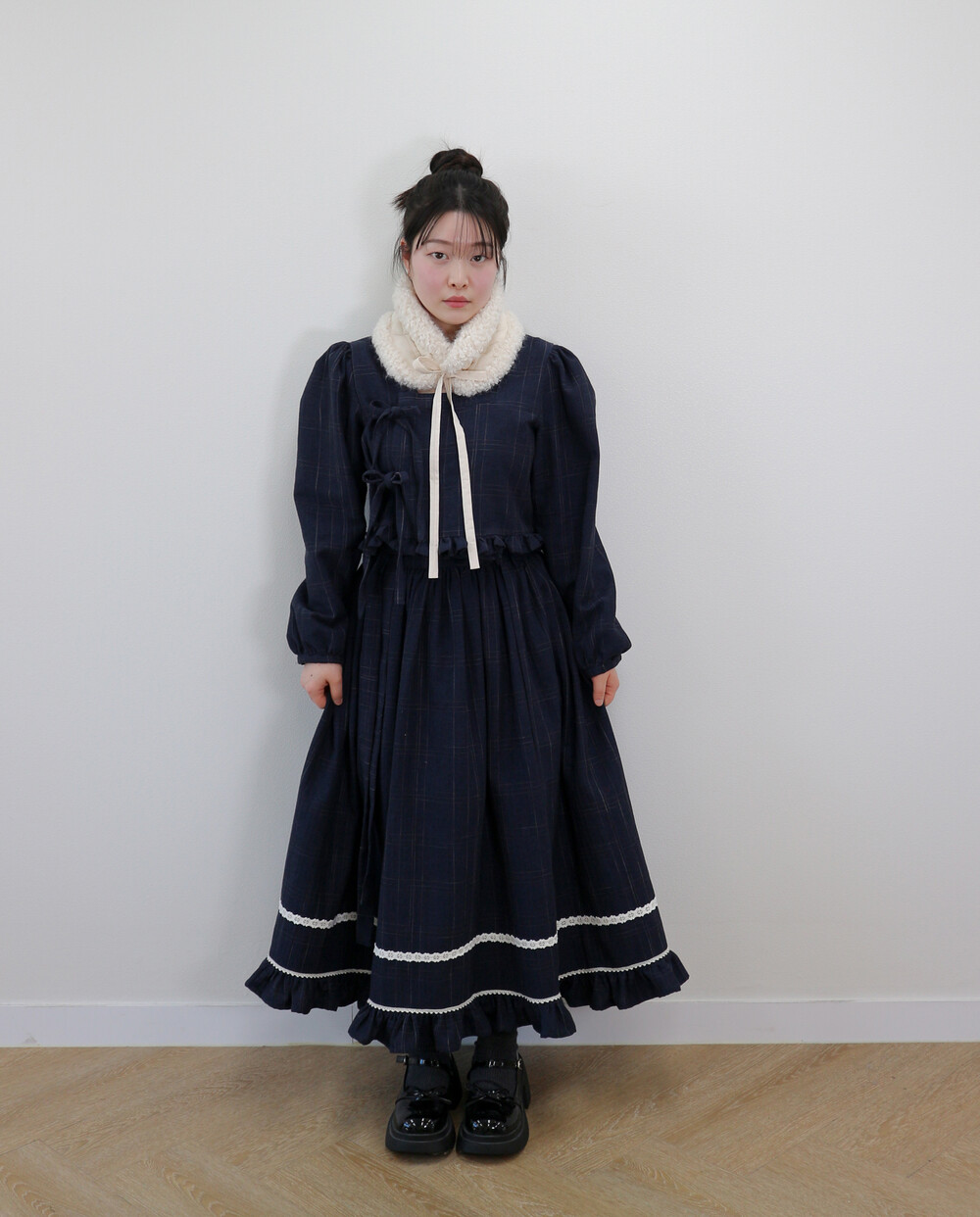 스티치가 놓여져있는 체크 원단으로 제작된 프릴 저고리와 허리치마입니다.