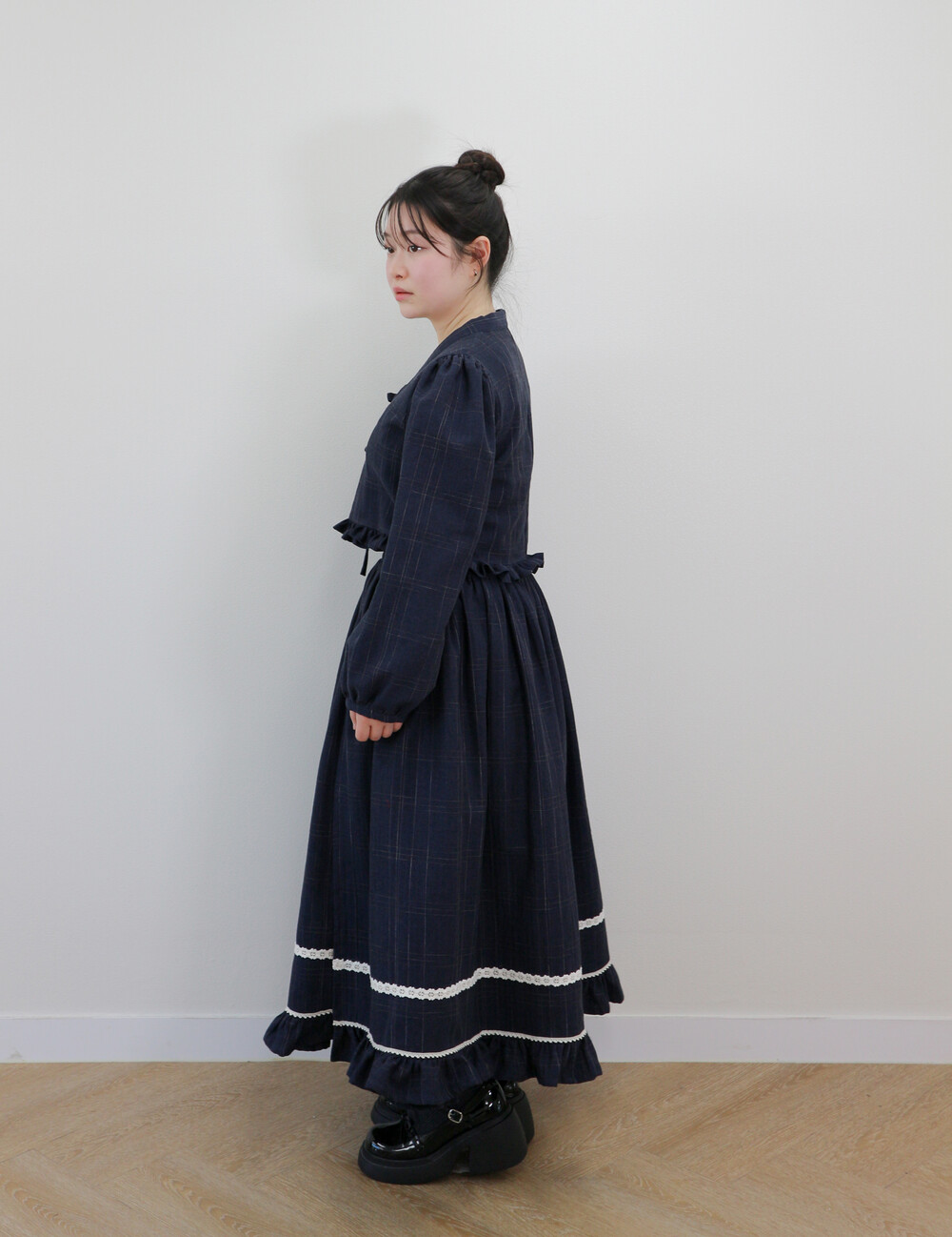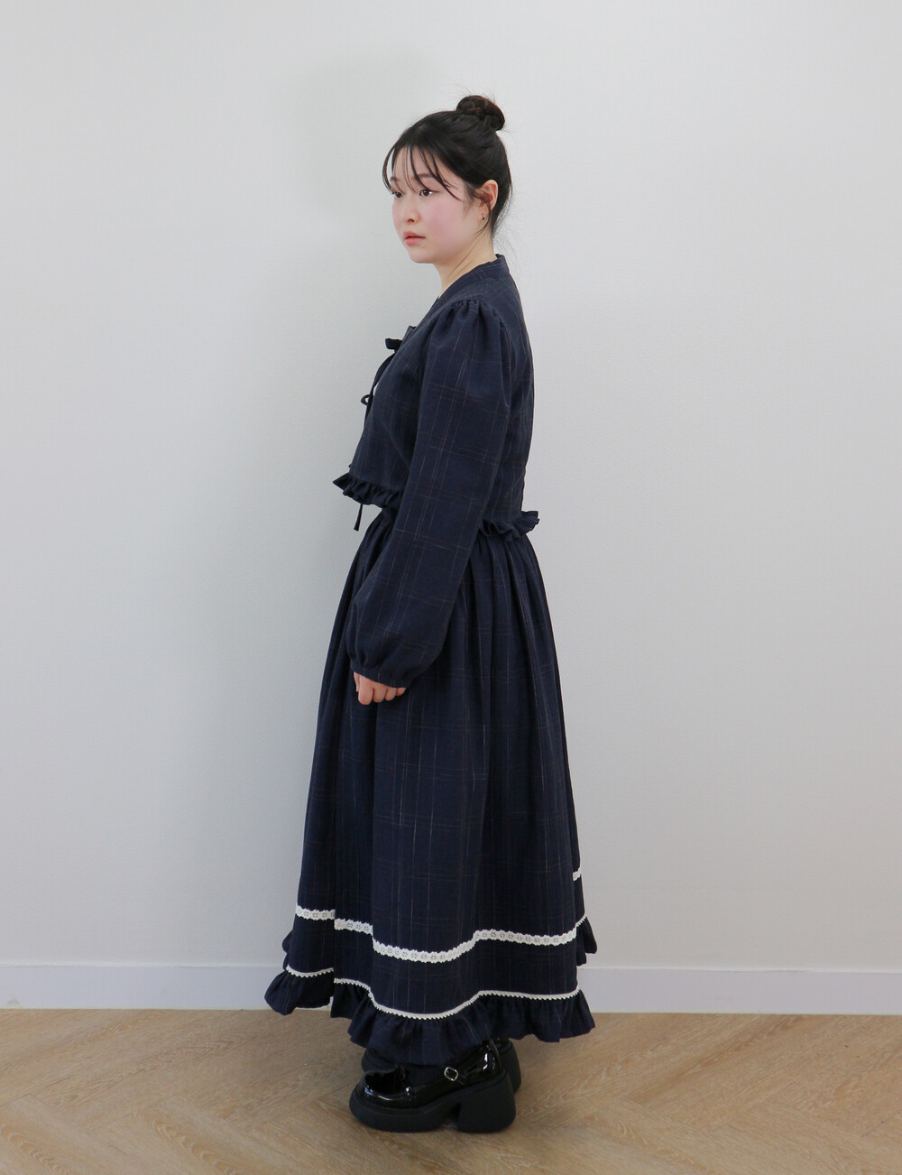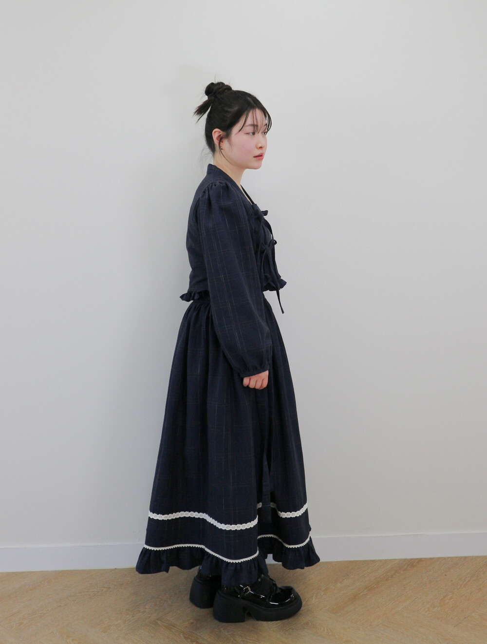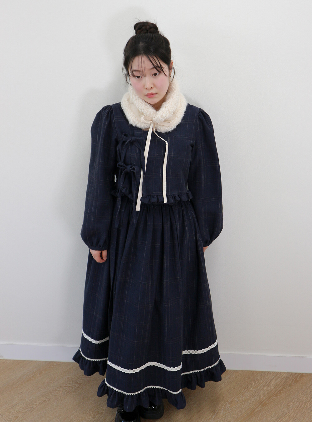 스티치가 놓여져있는 체크 원단으로 제작된 프릴 저고리와 허리치마입니다.