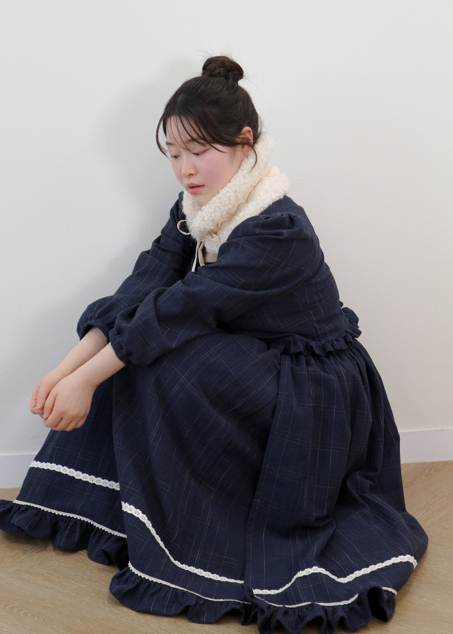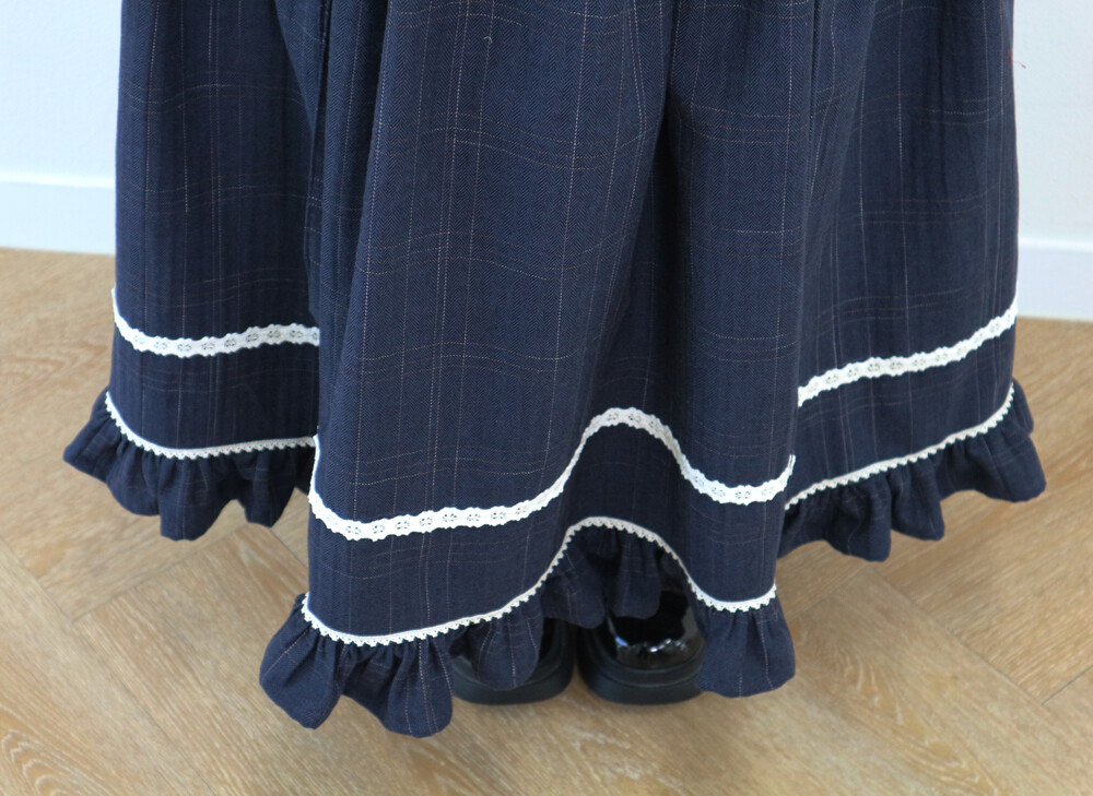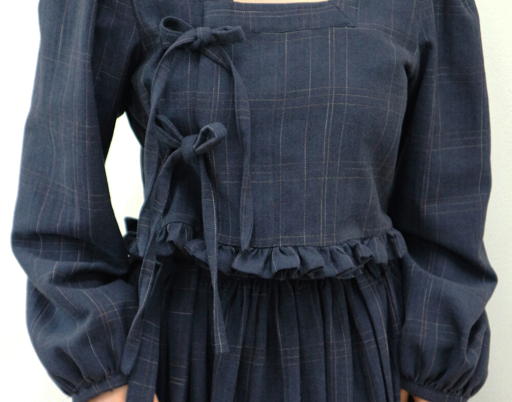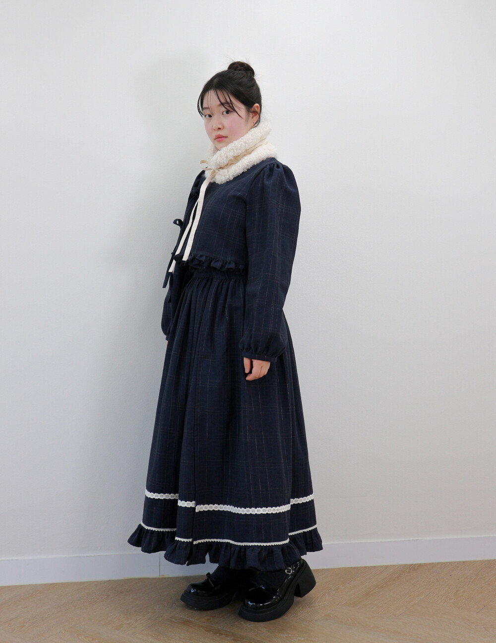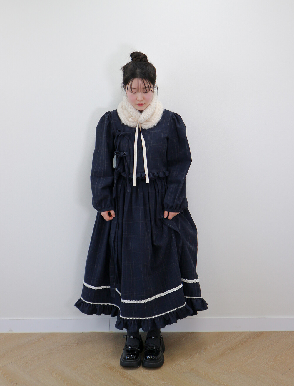 스티치가 놓여져있는 체크 원단으로 제작된 프릴 저고리와 허리치마입니다.