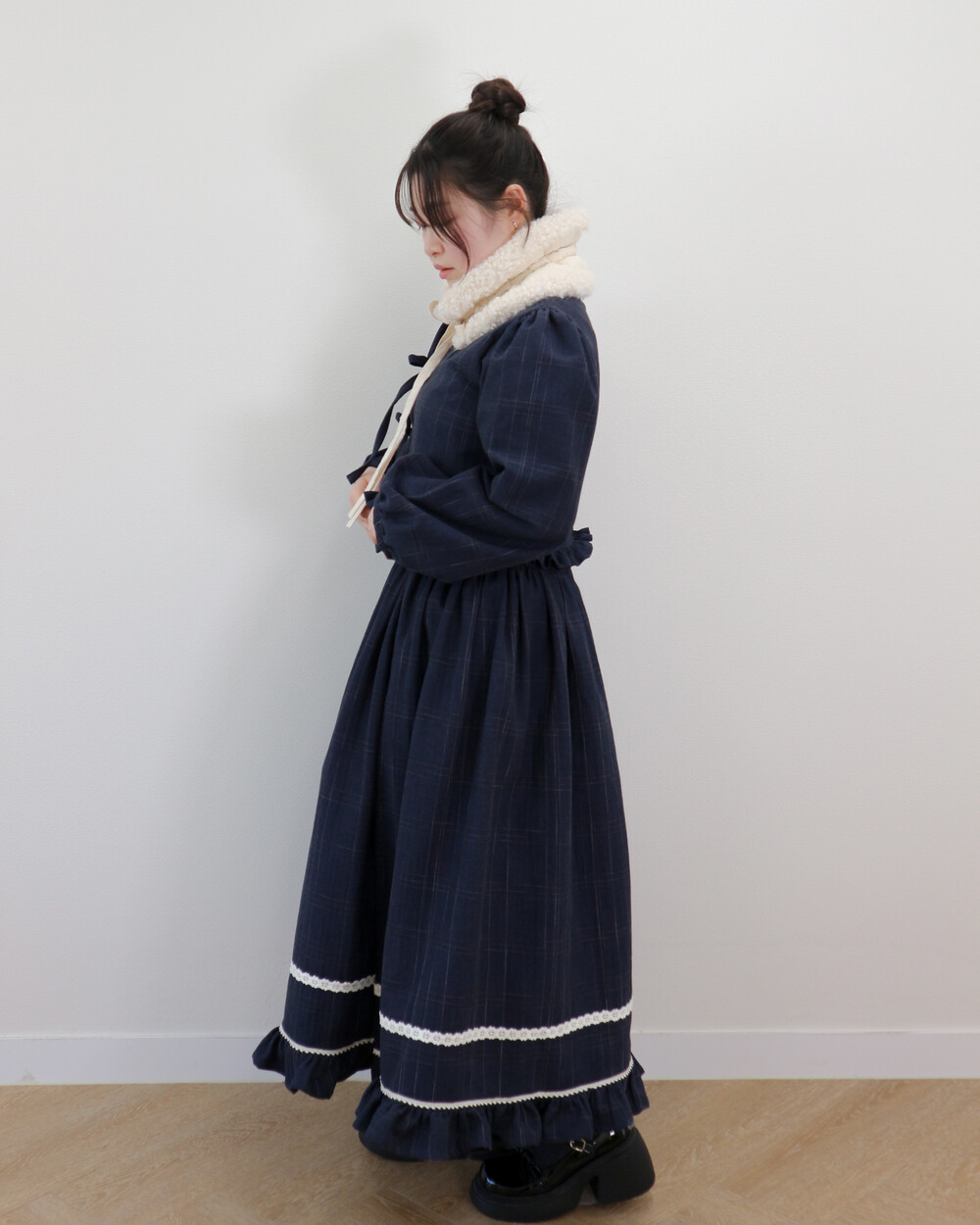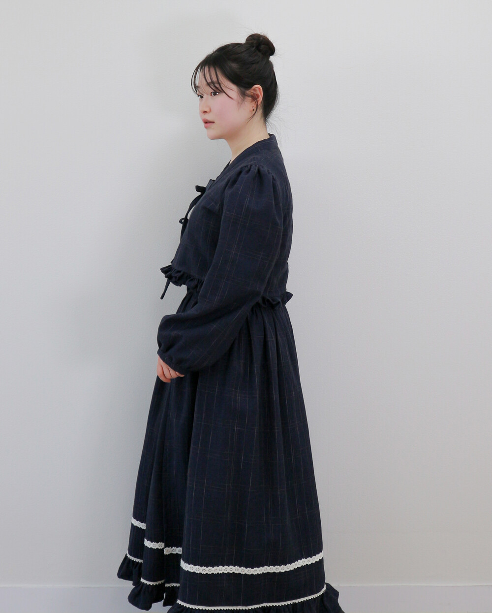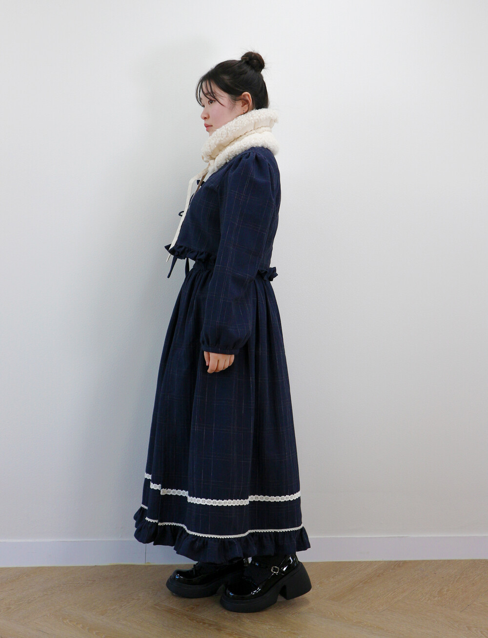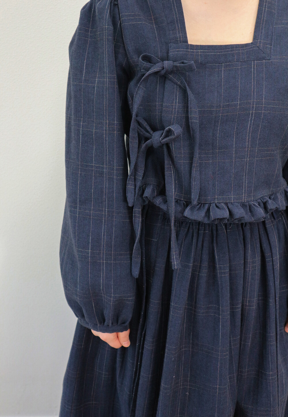 스티치가 놓여져있는 체크 원단으로 제작된 프릴 저고리와 허리치마입니다.