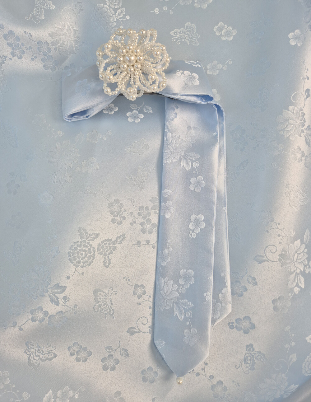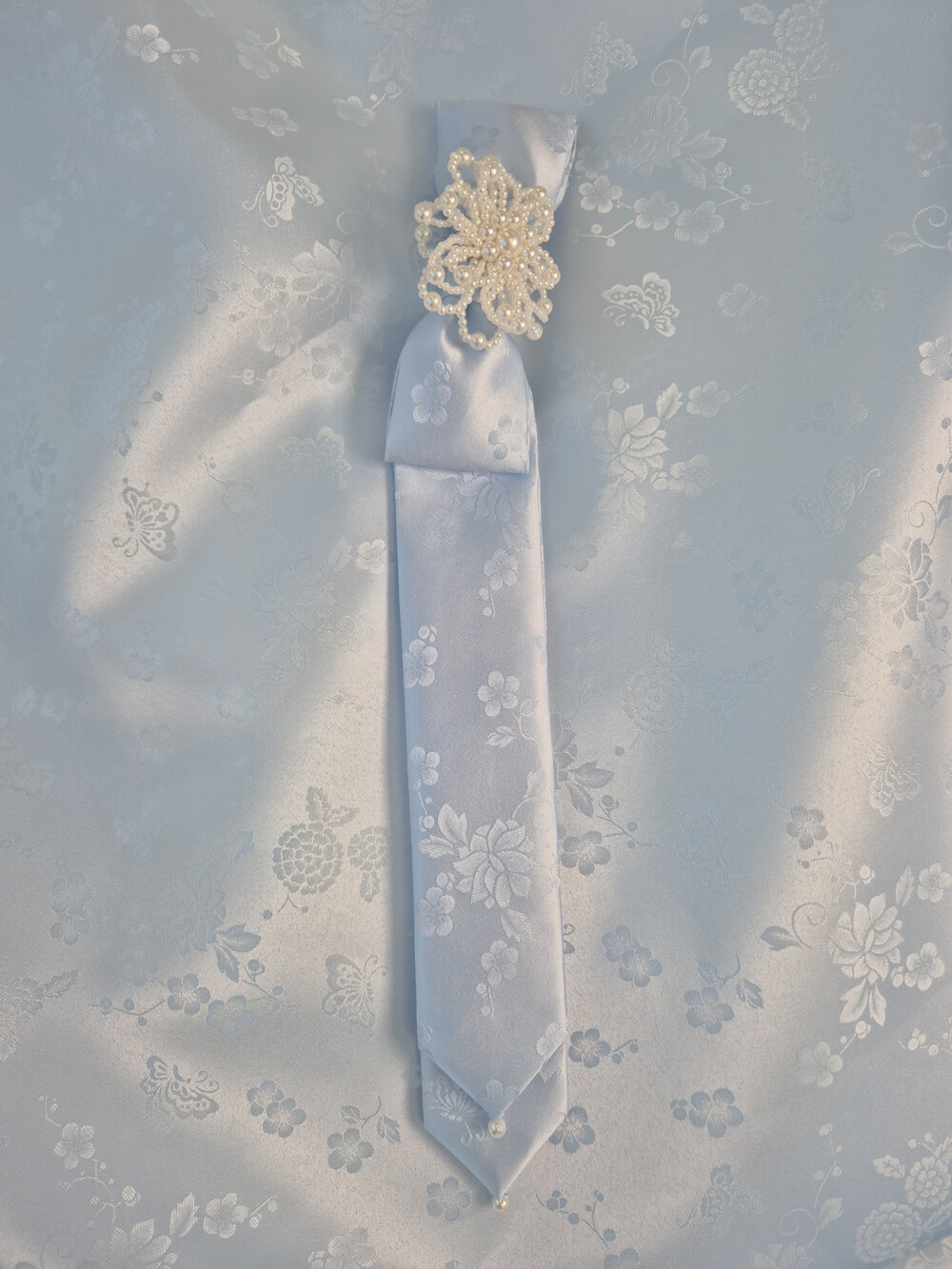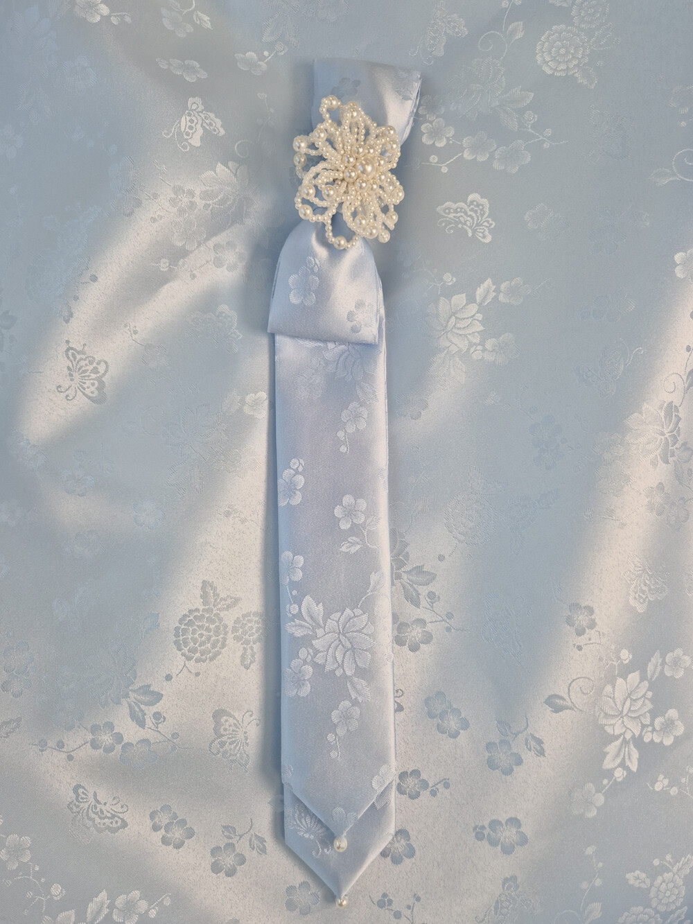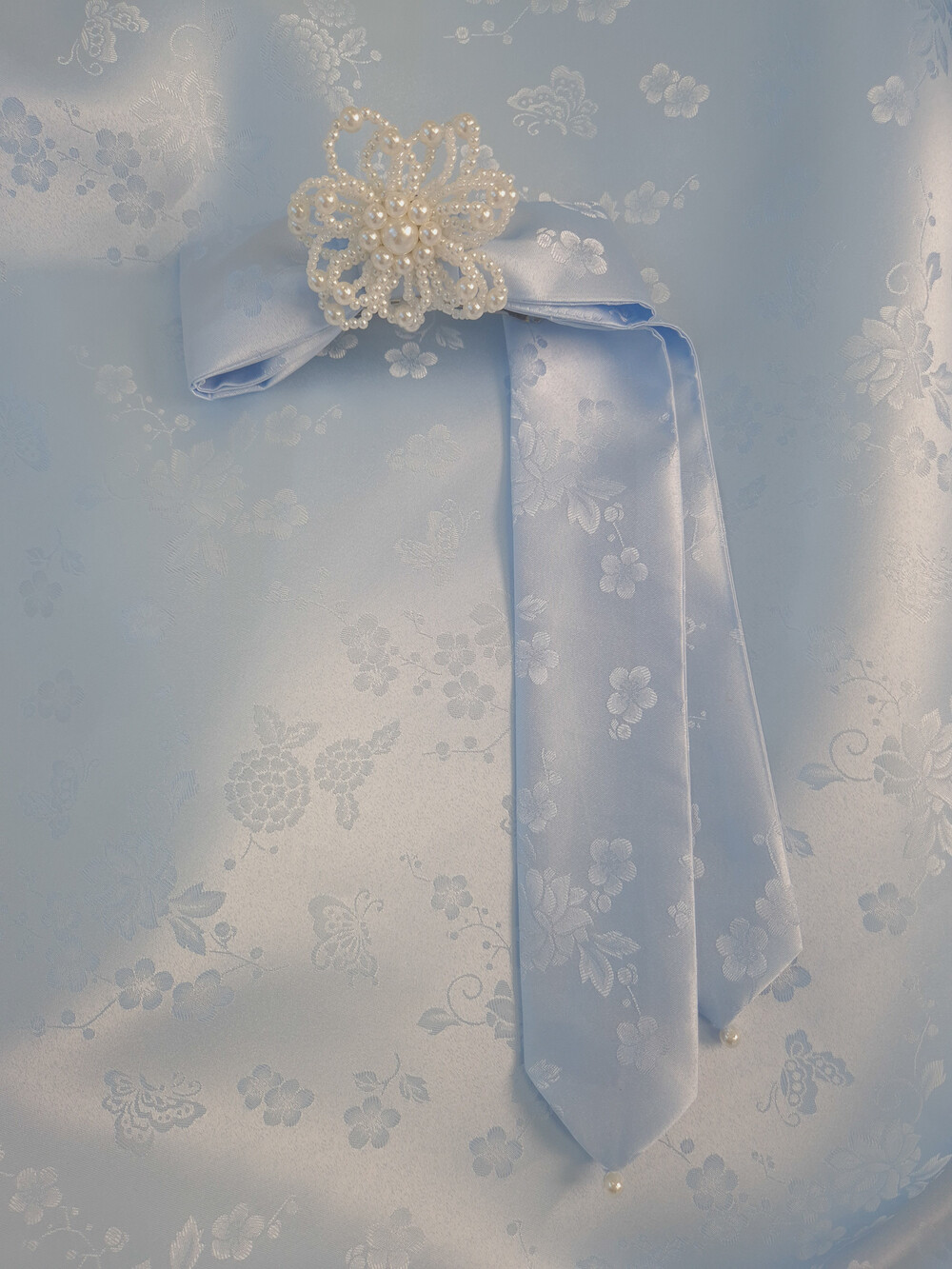 몽환적인 나비와 꽃 패턴과 진주로 사랑스러움을 더하였습니다.