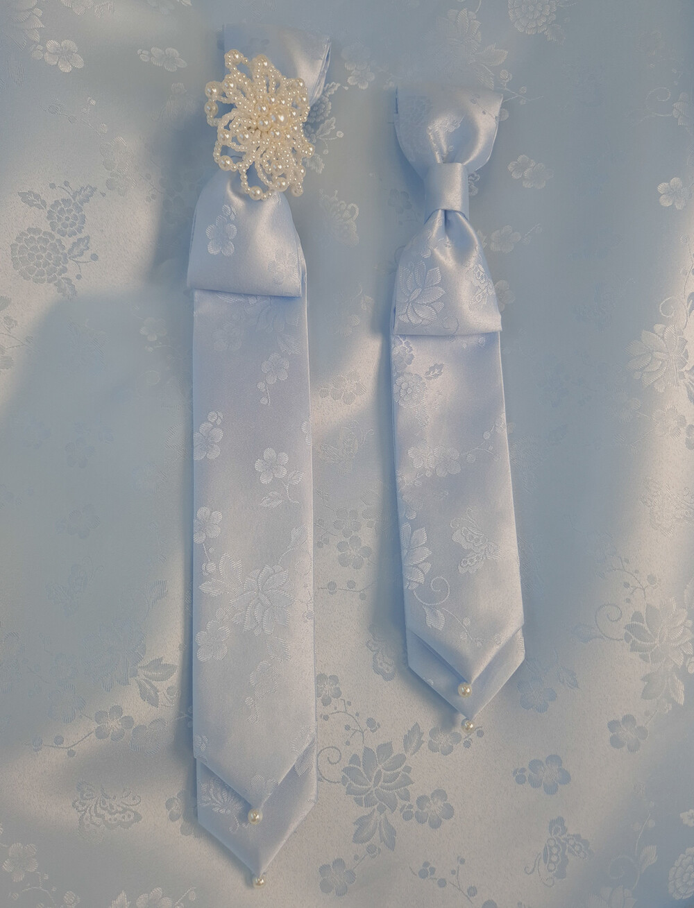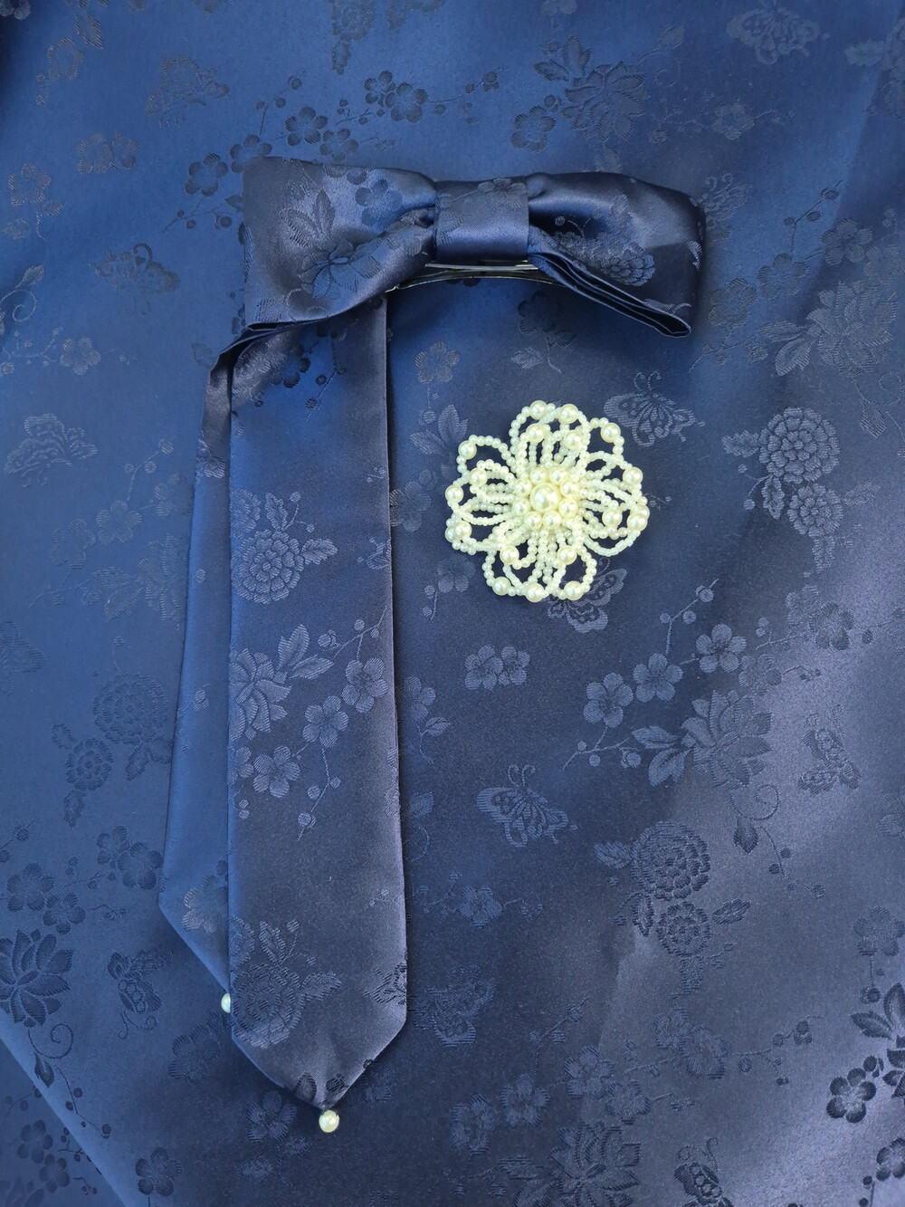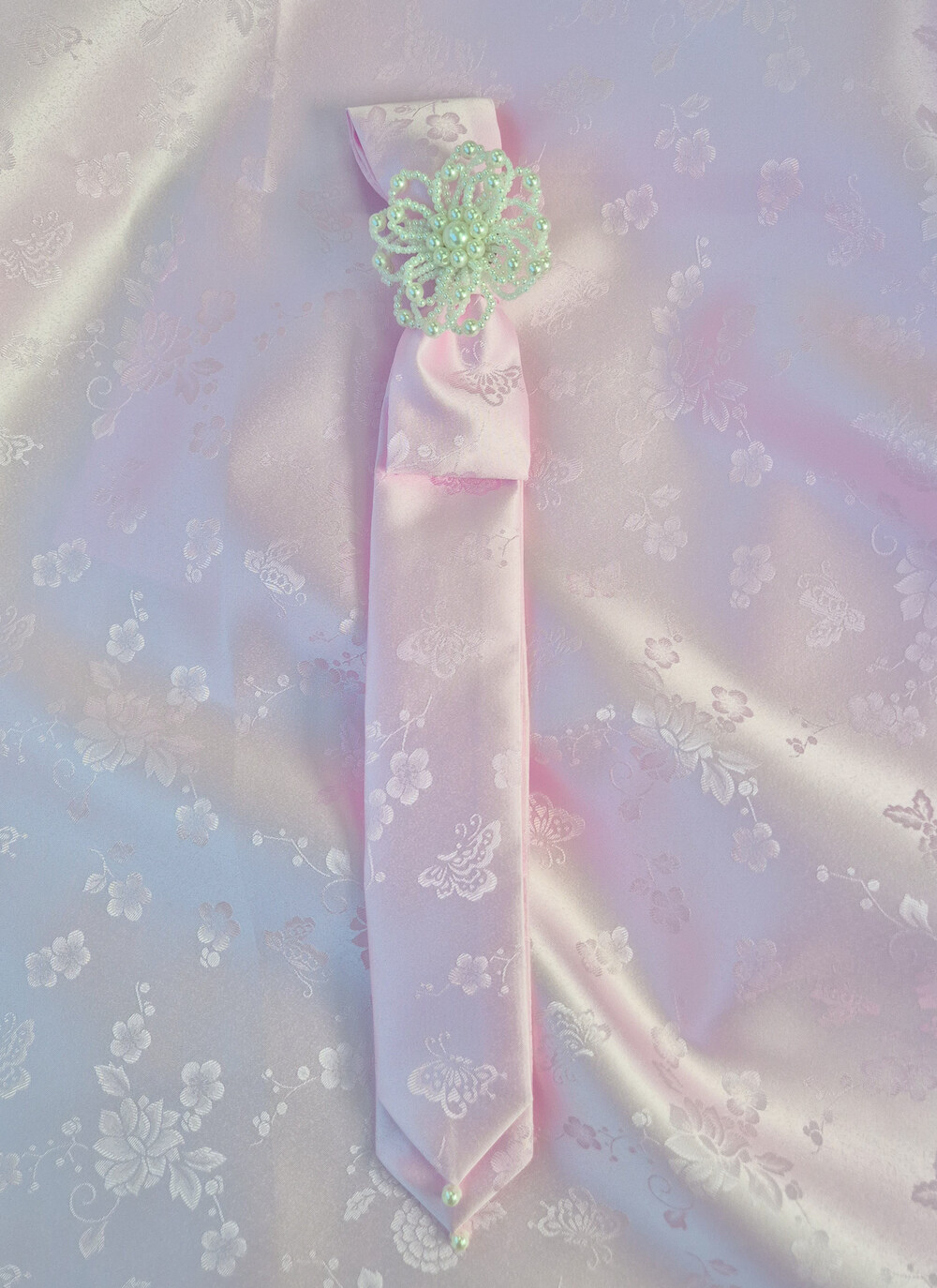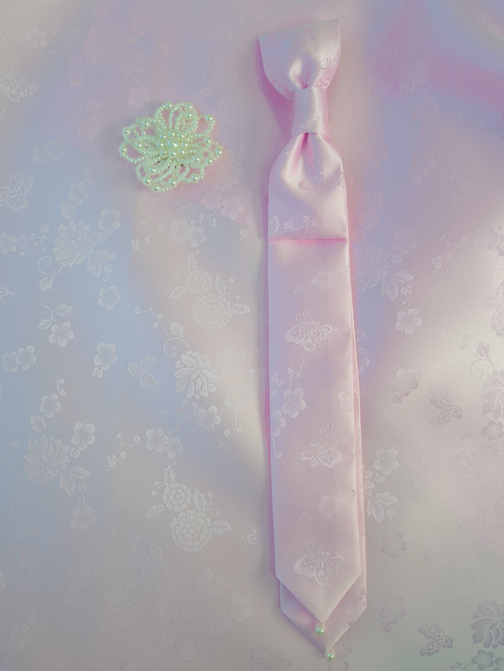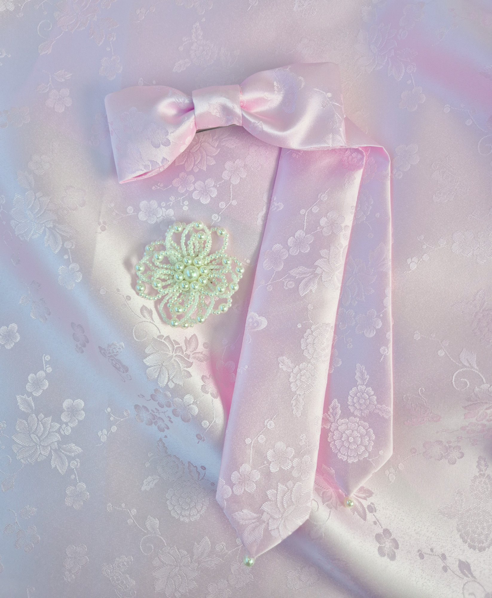 몽환적인 나비와 꽃 패턴과 진주로 사랑스러움을 더하였습니다.