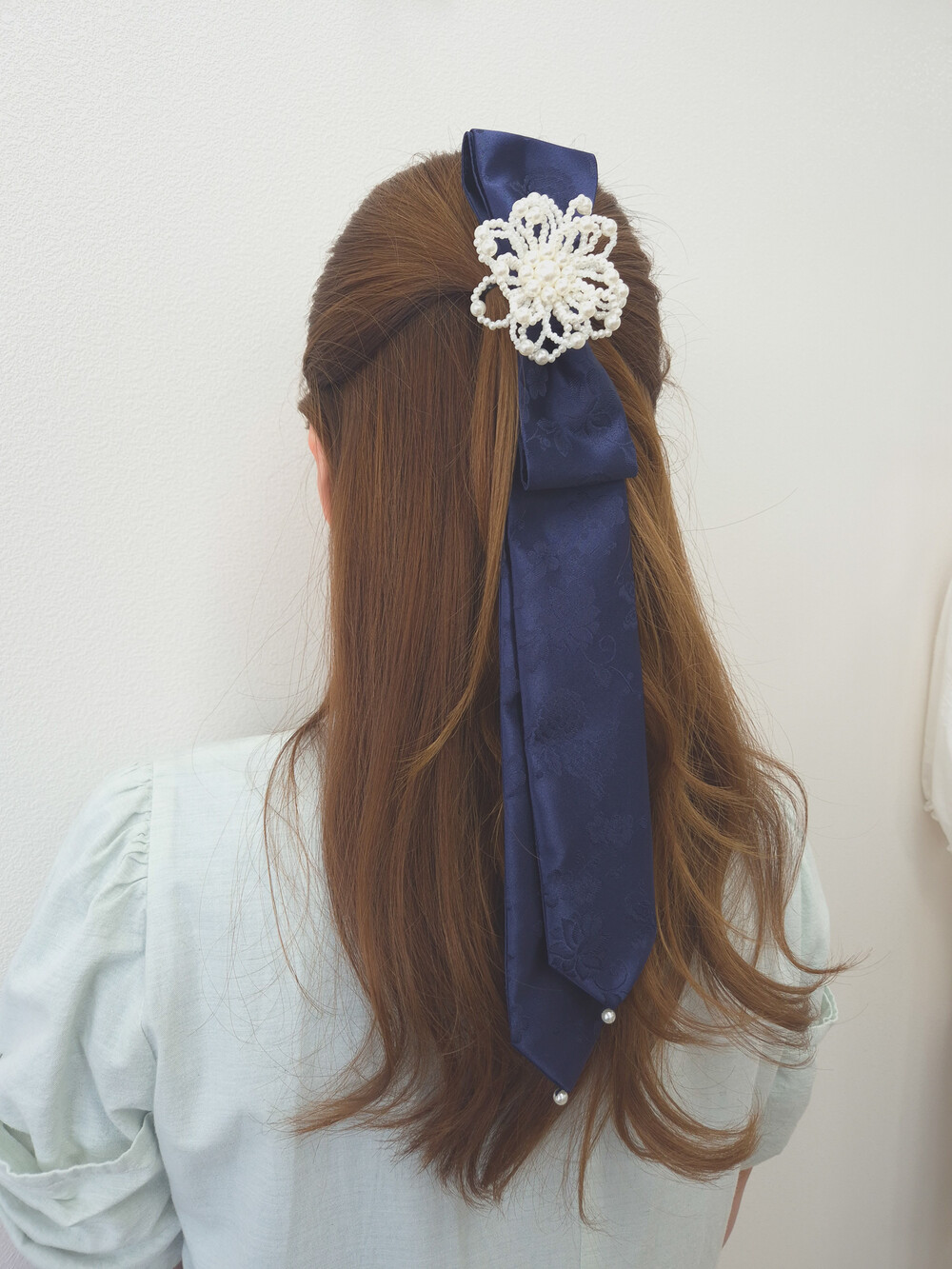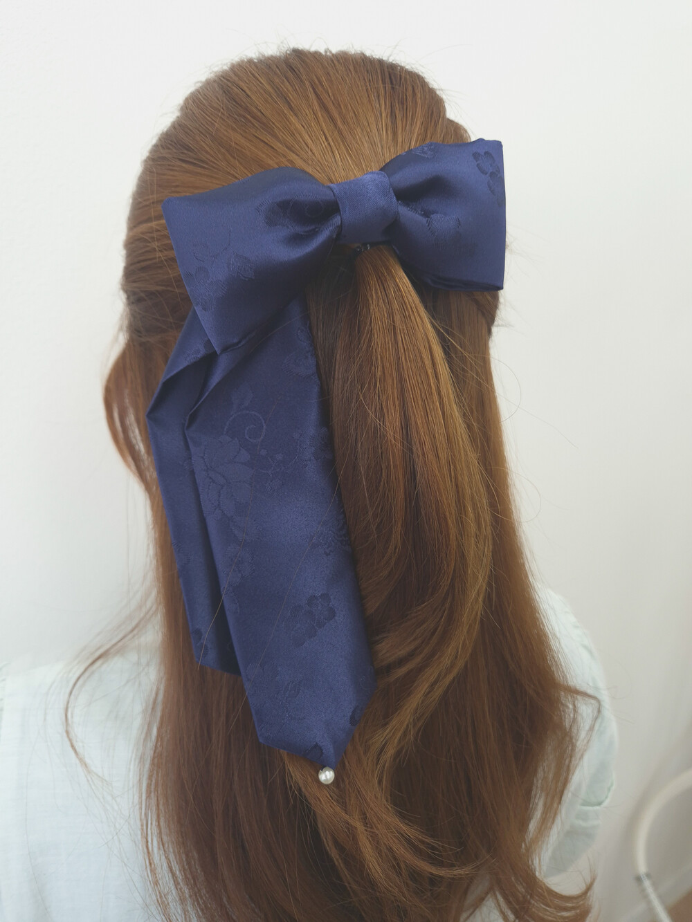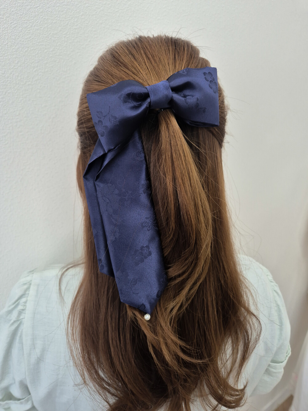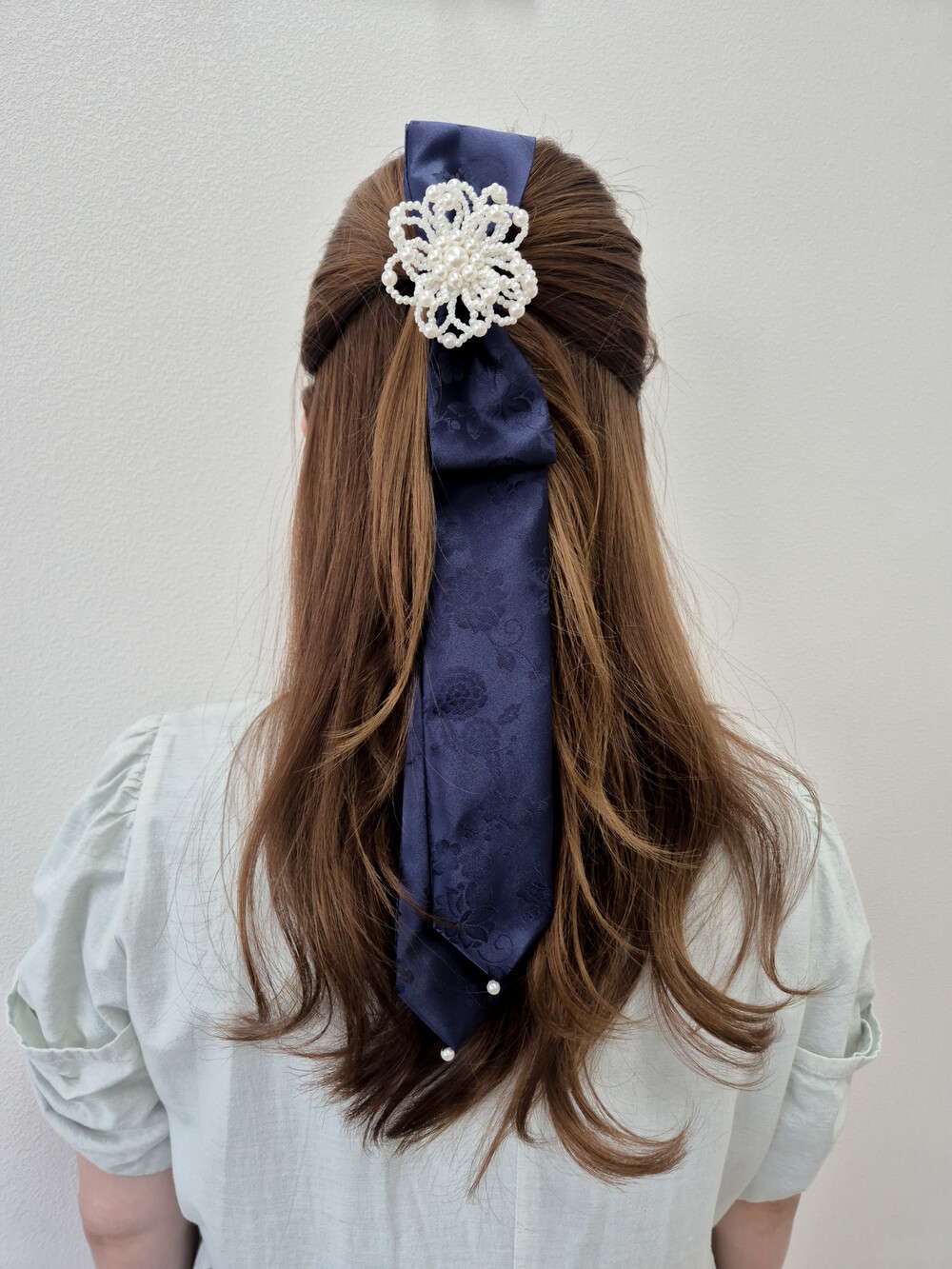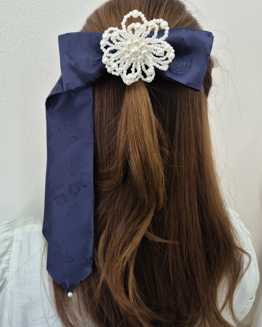 제빗부리 댕기를 길게만들고, 리본 모양을 만들어 진주로 장식하였습니다.