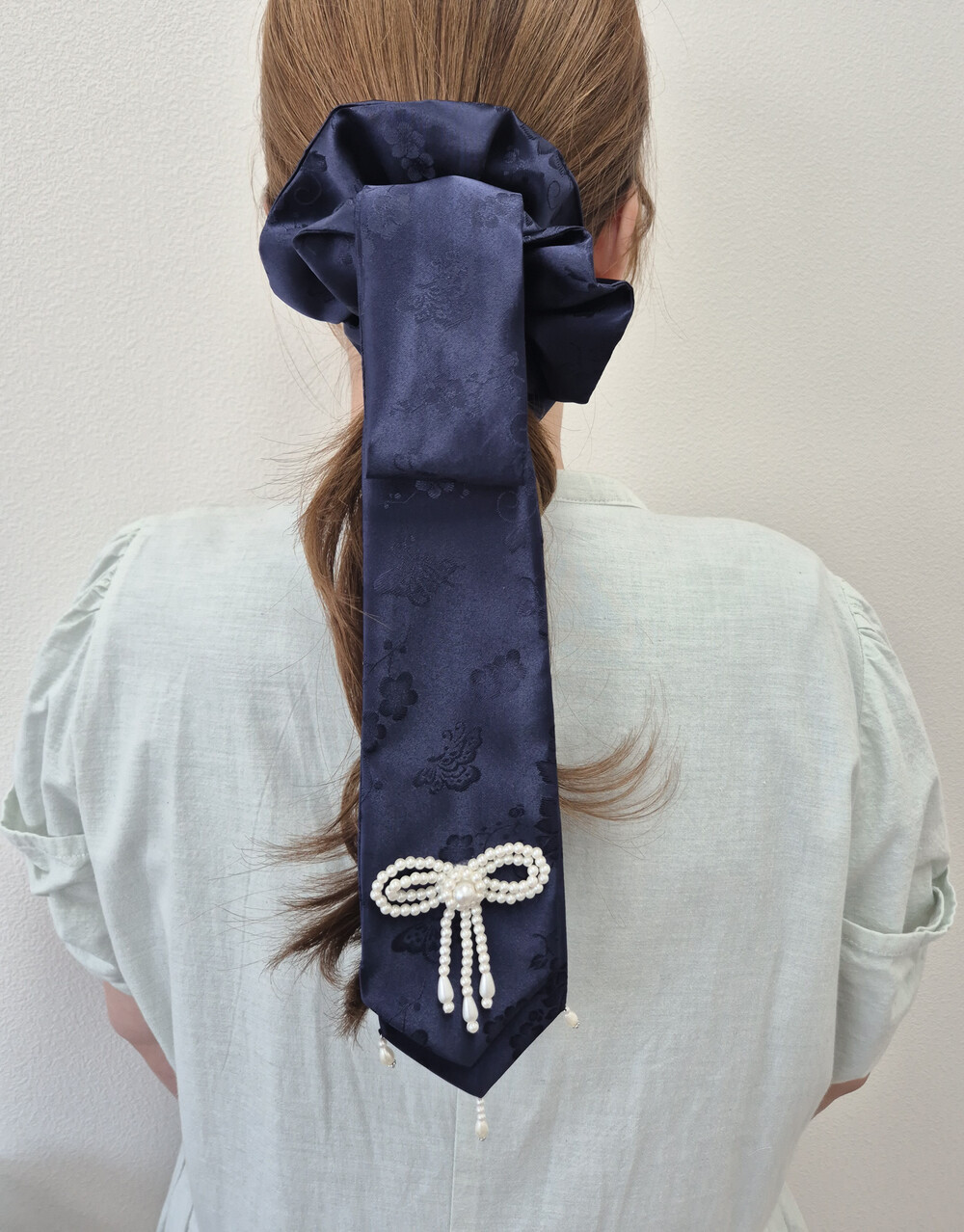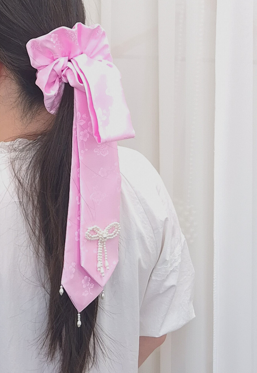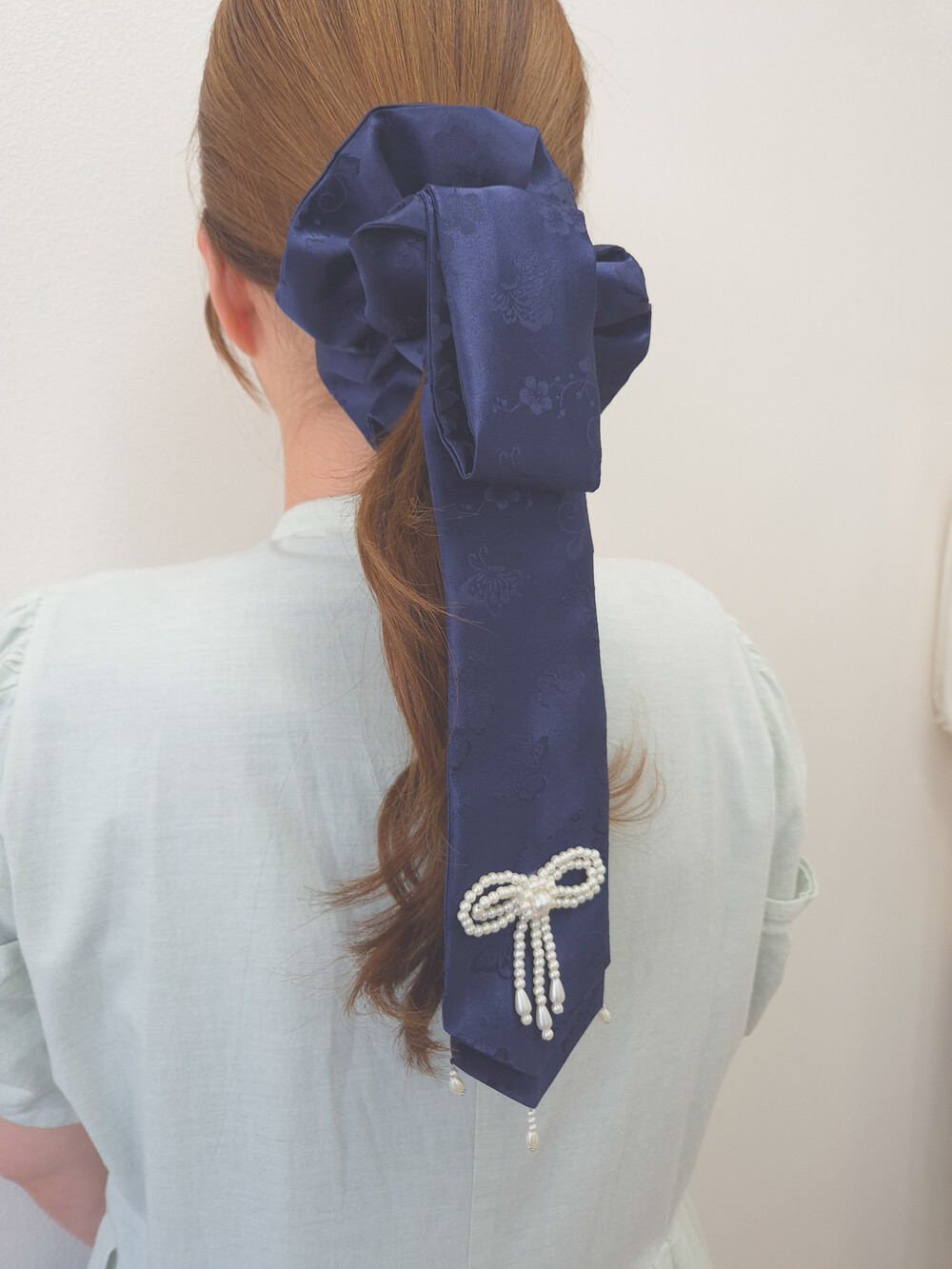고급스러운 광택감이 있는 한복 양단 원단으로 제작 된 긴 사이즈 댕기와 헤어슈슈 입니다.