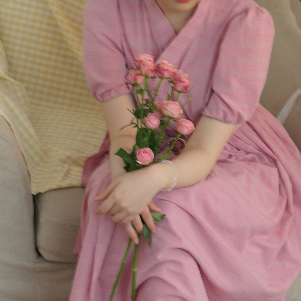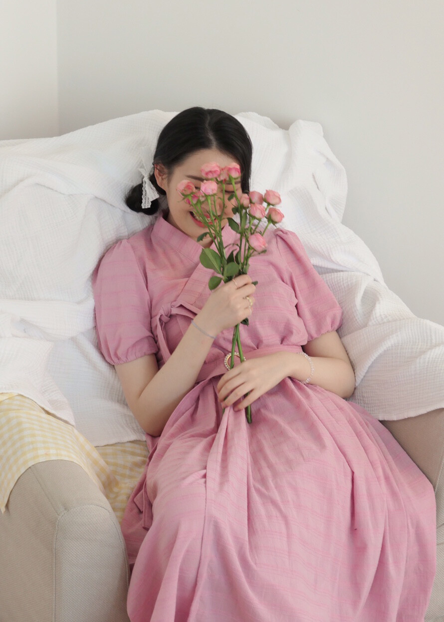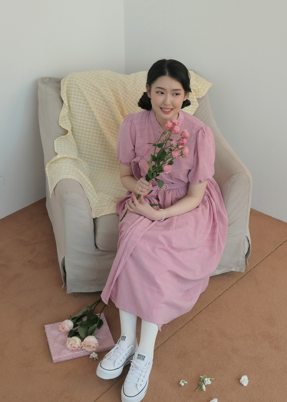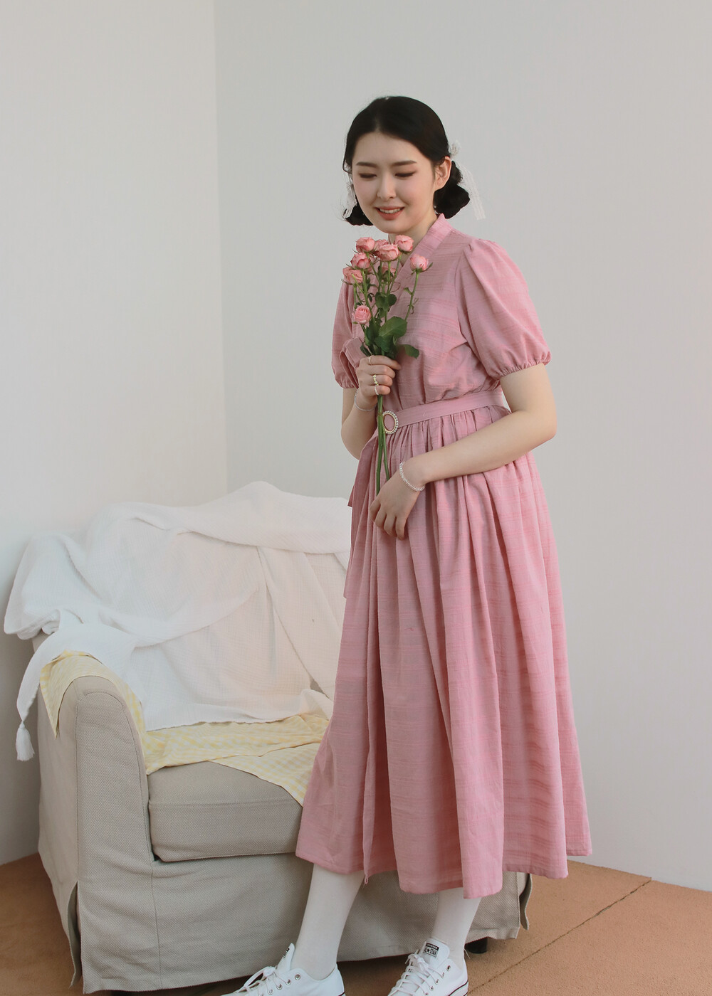 어깨 퍼프장식과 진주벨트로 깔끔하면서도 여름에