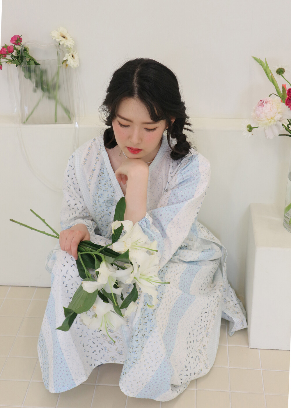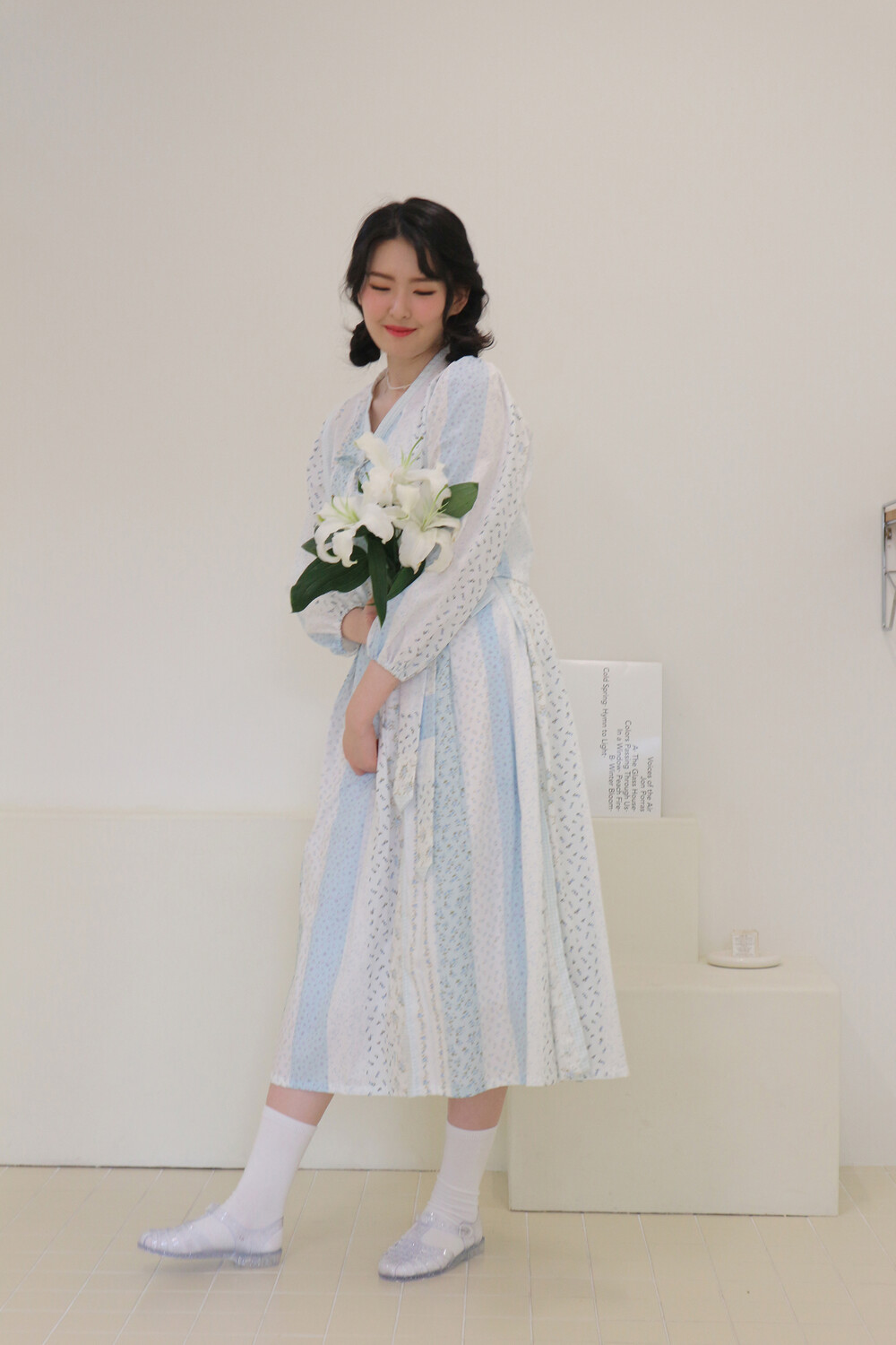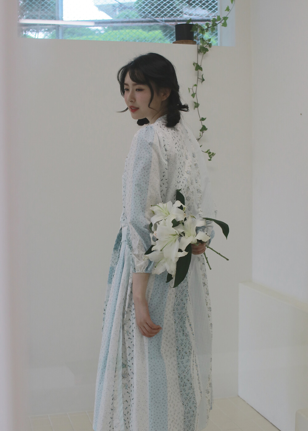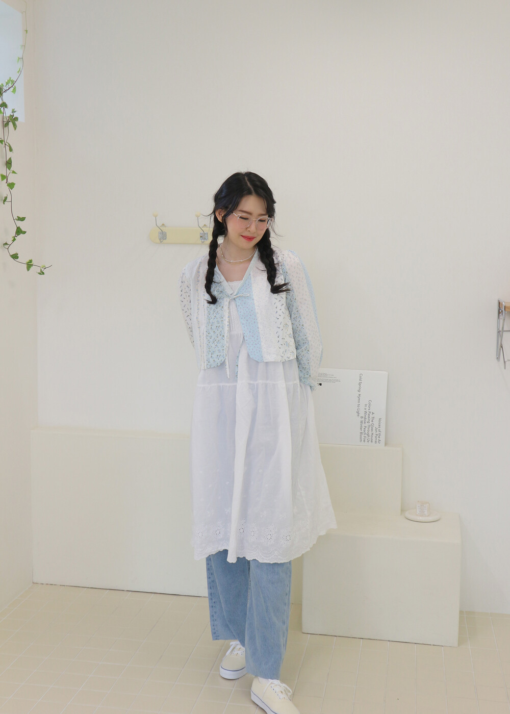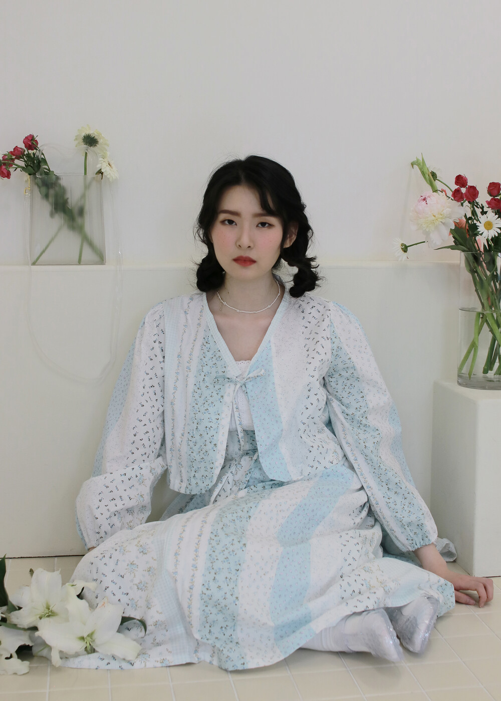 활용한 면 원단 투피스입니다.청량한 색감의 원단과
