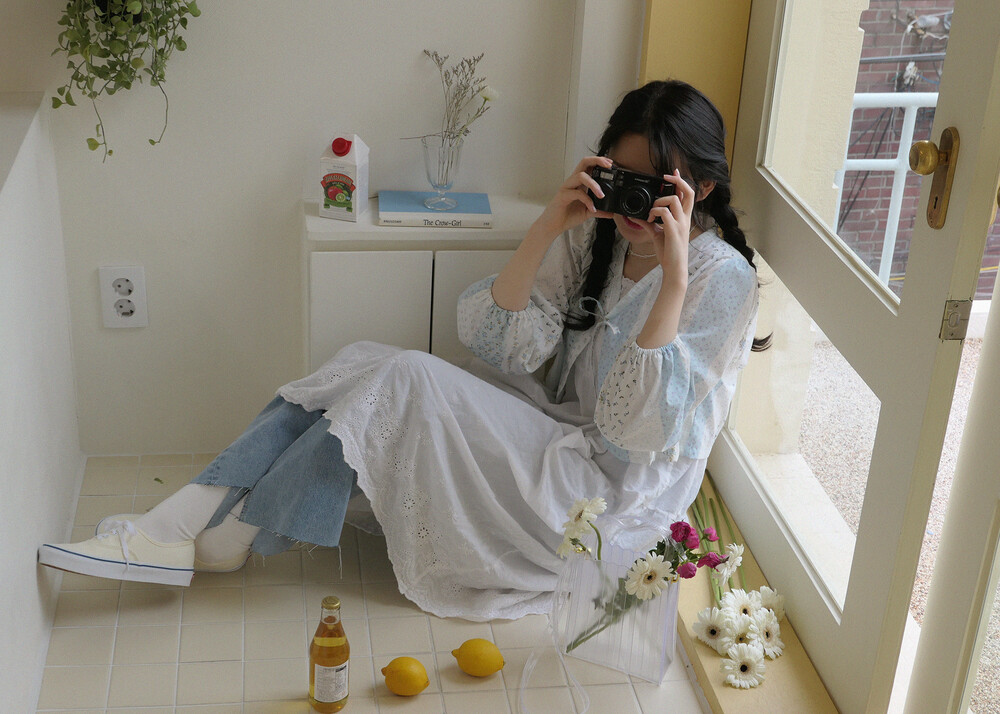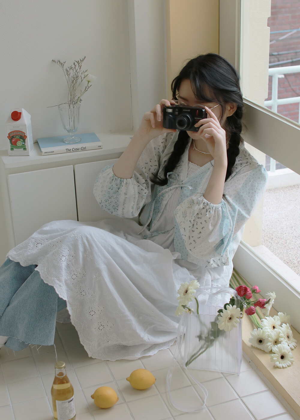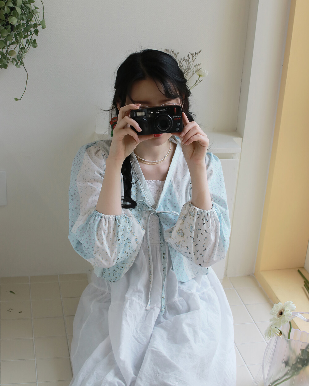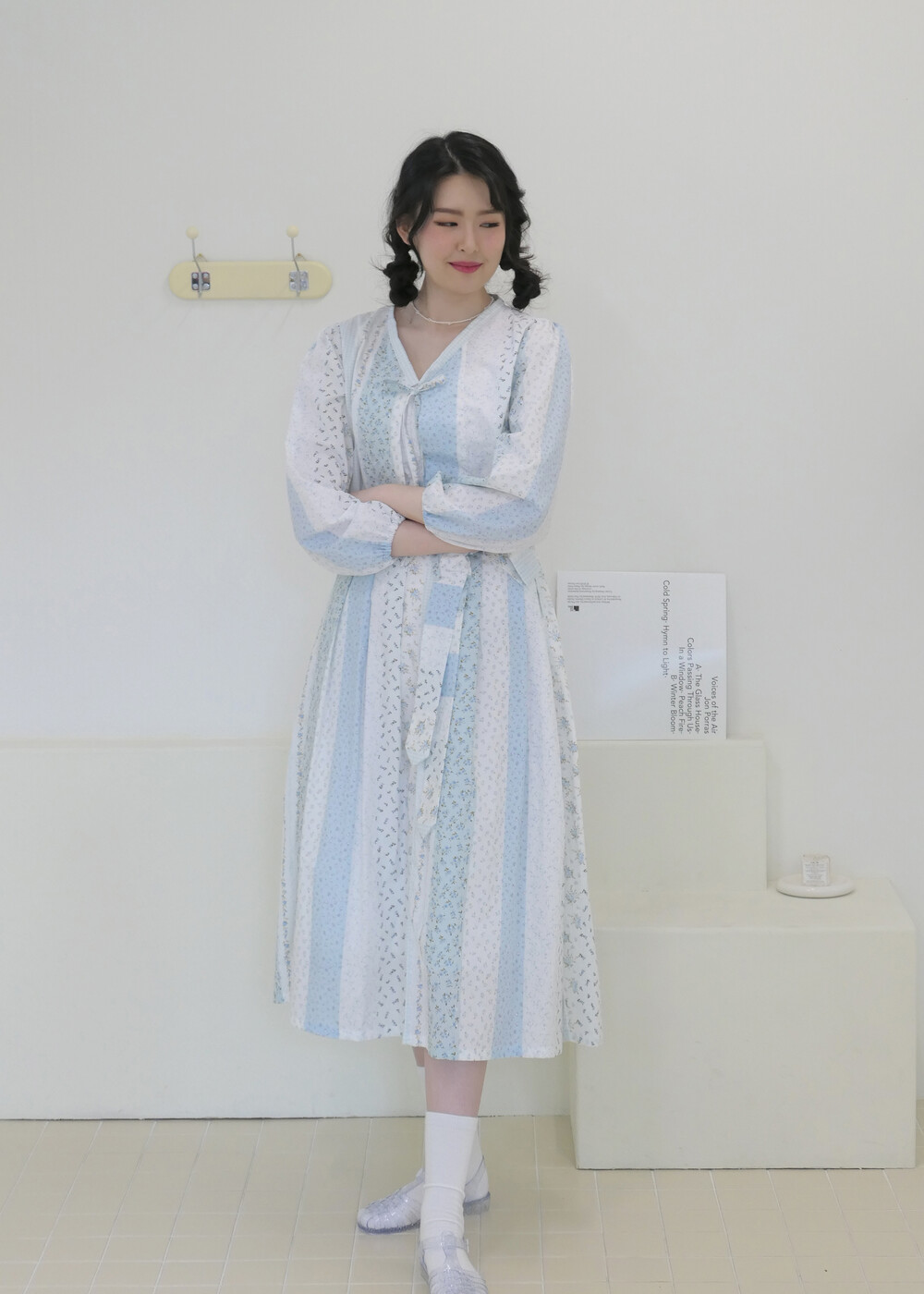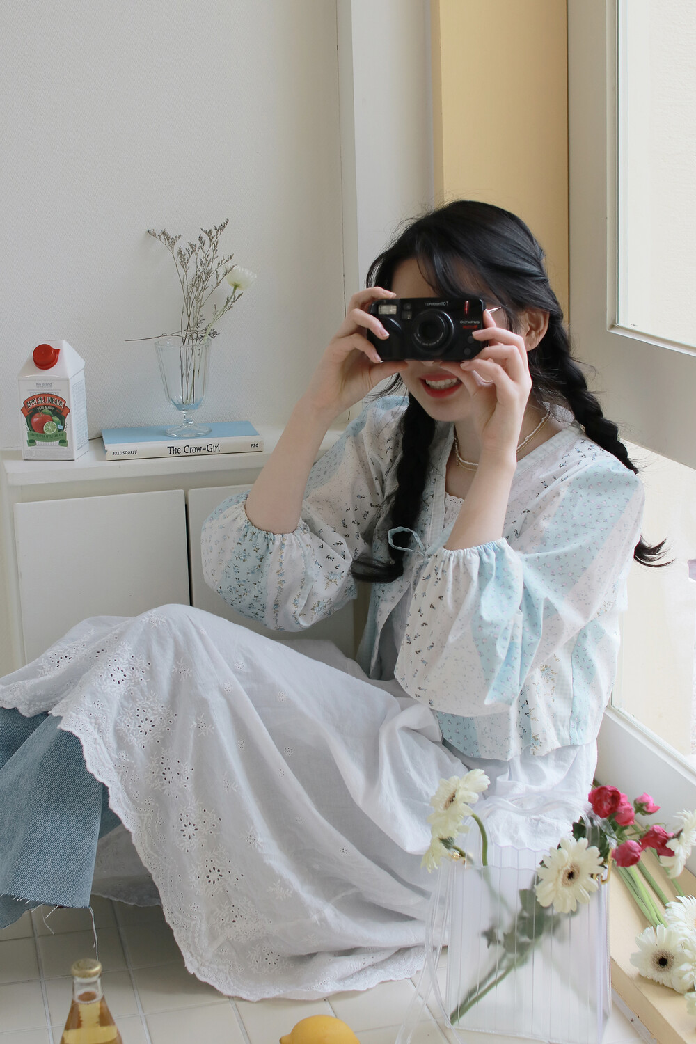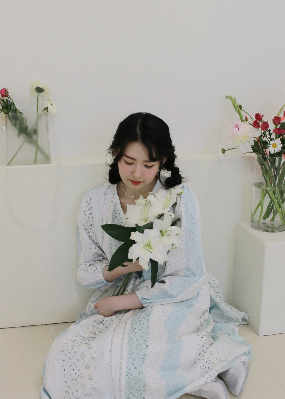 활용한 면 원단 투피스입니다.청량한 색감의 원단과