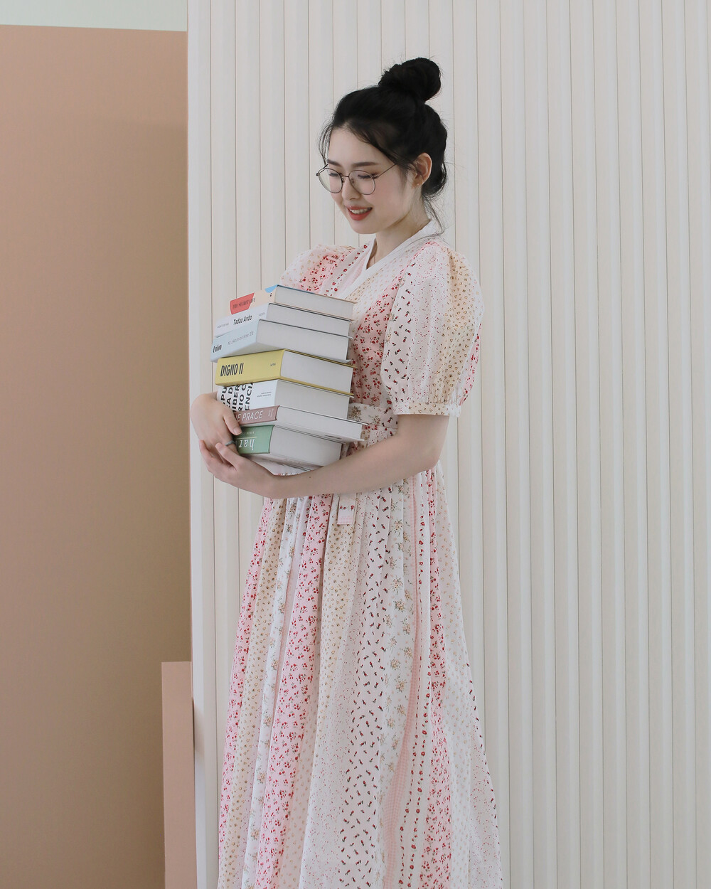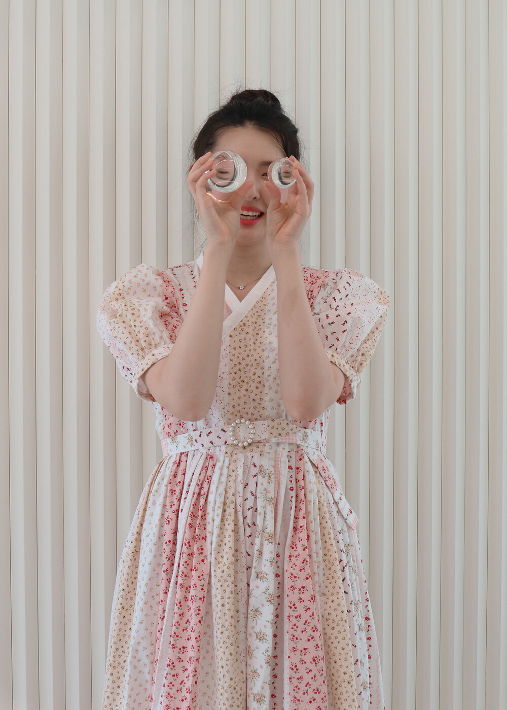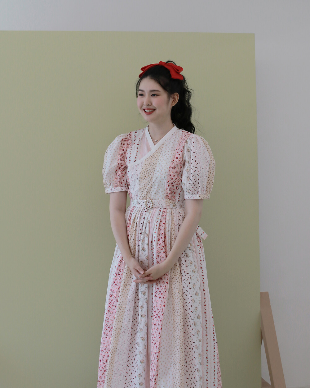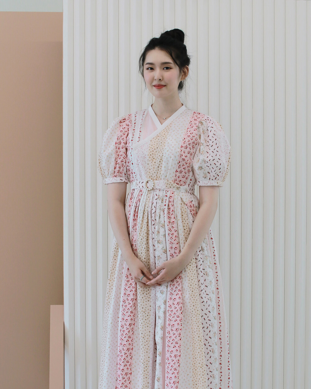제작된 퍼프 철릭원피스입니다. 맑은 핑크색의 원단과