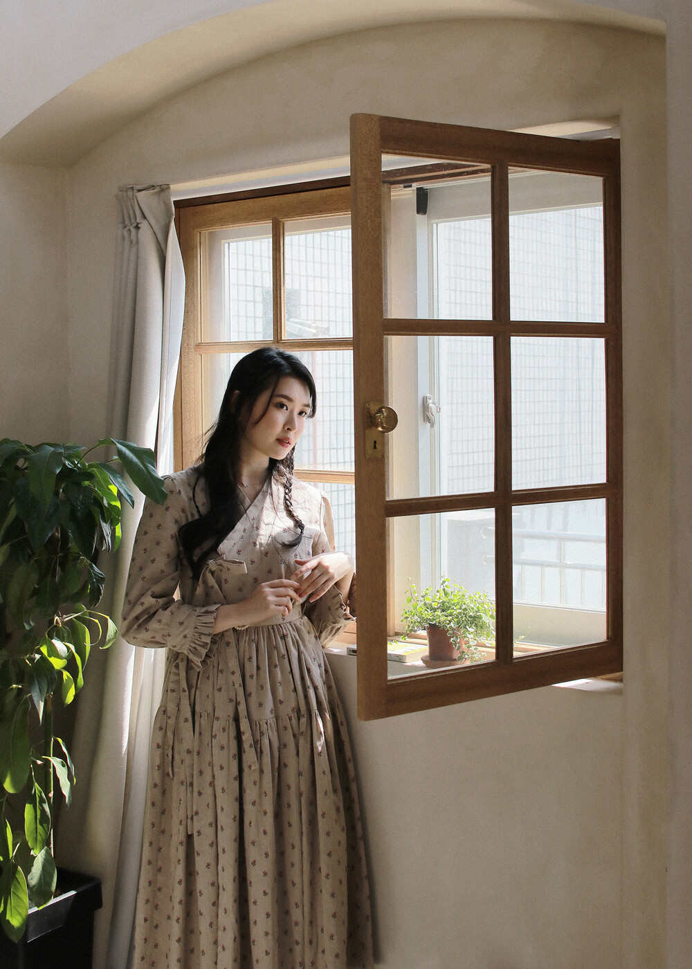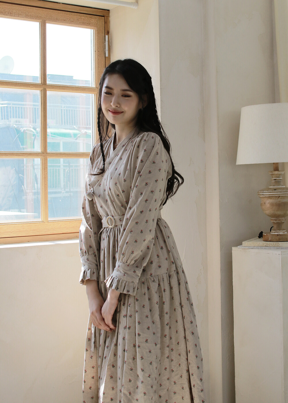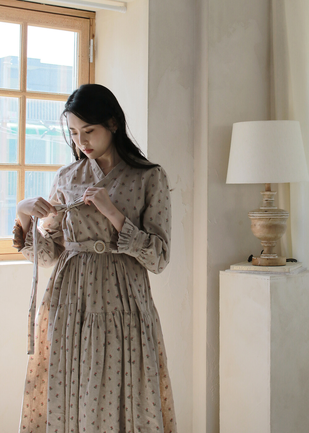 활용하여 제작한 철릭 원피스입니다. 소매의 커프스와 셔링에