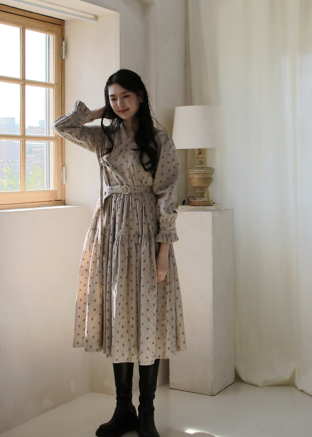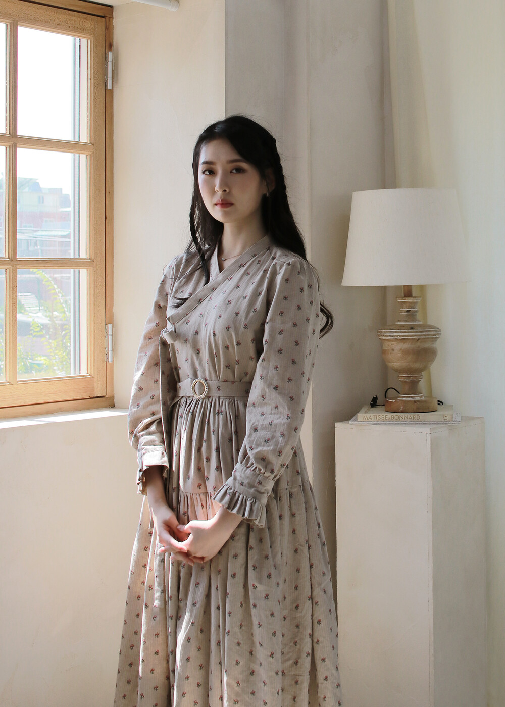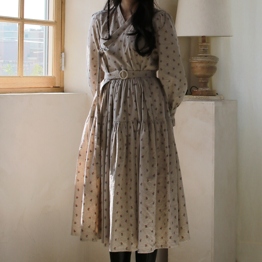 활용하여 제작한 철릭 원피스입니다. 소매의 커프스와 셔링에