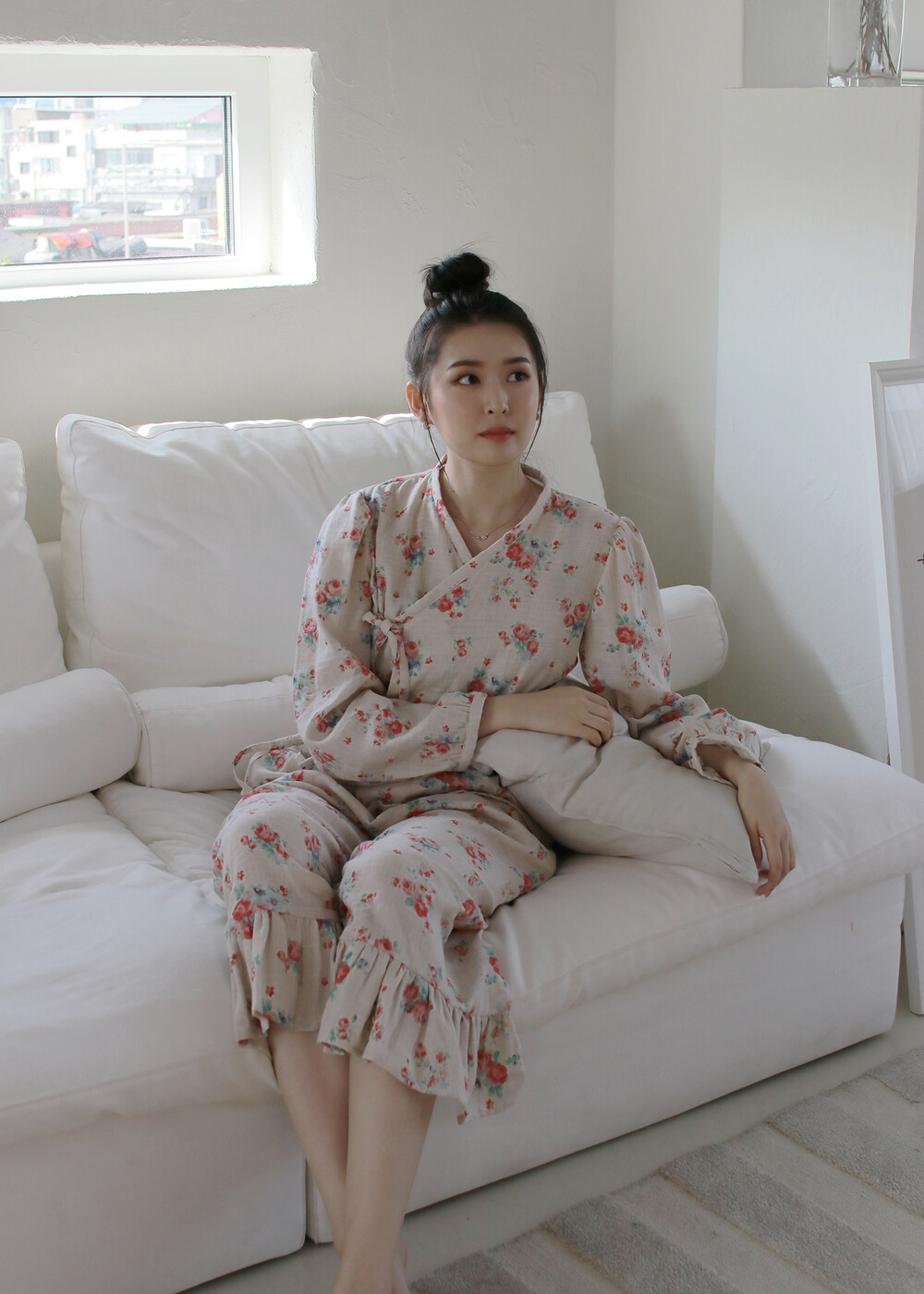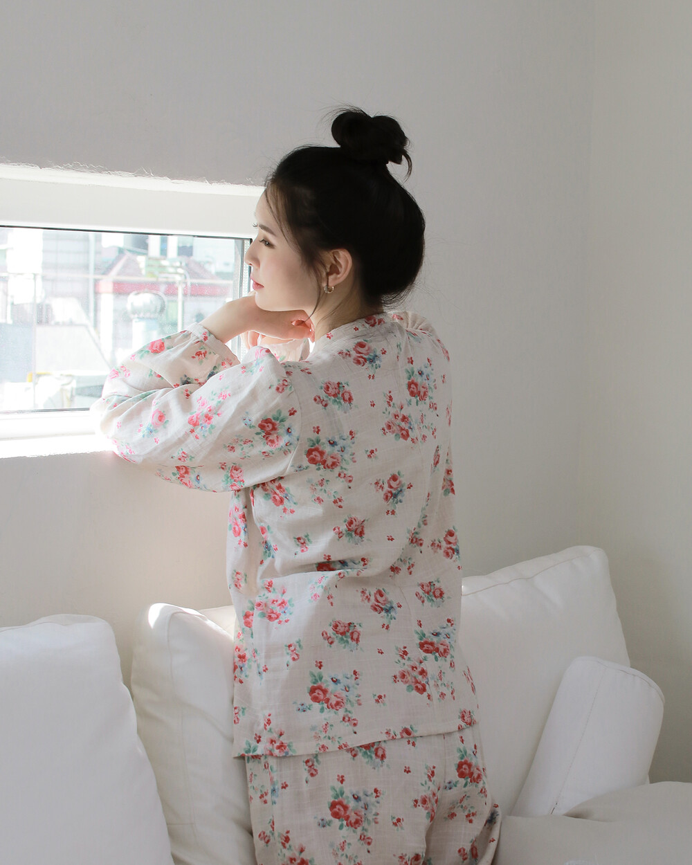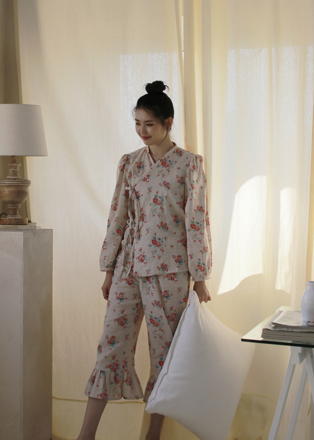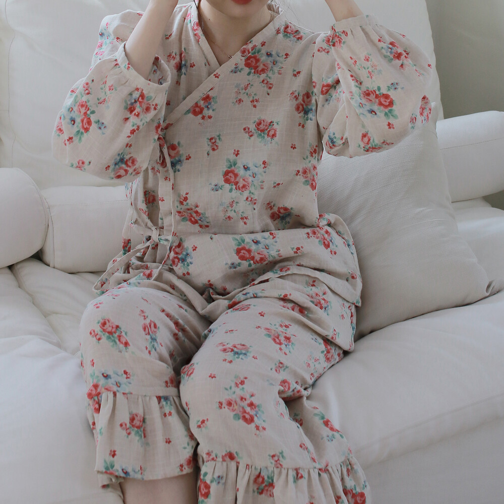 빈티지한 플라워 이중직 원단으로 제작된잠옷 세트입니다.