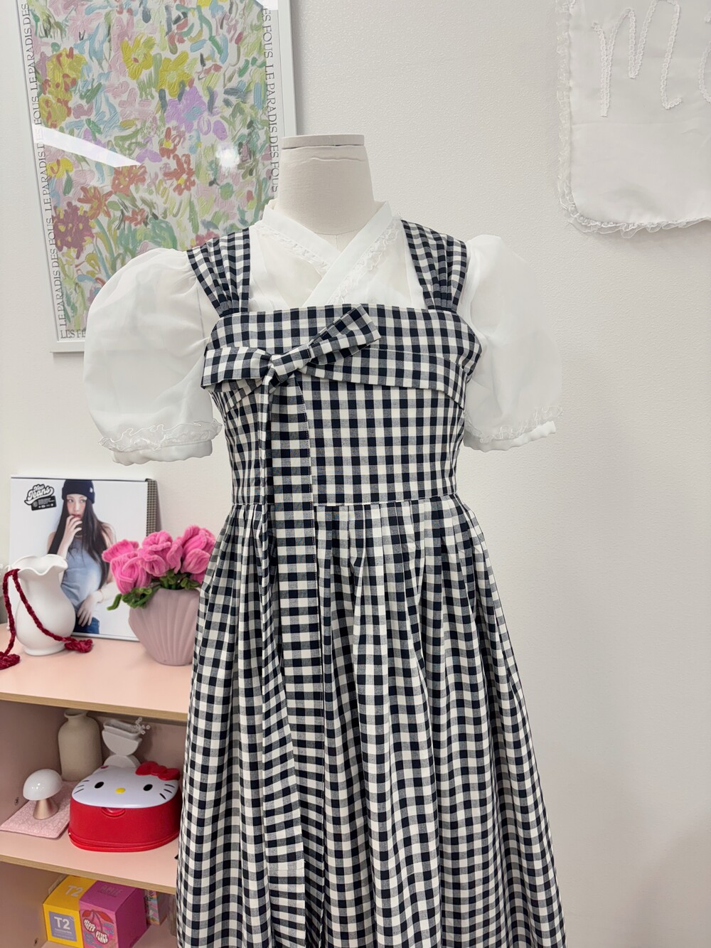 귀여운 고방체크 원단으로 제작된 말기 원피스와, 한복 노방 원단으로 제작된 핀턱 디테일의 화이트 저고리 세트입니다.