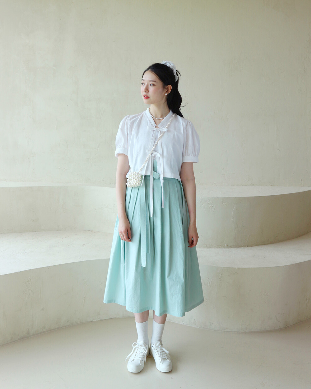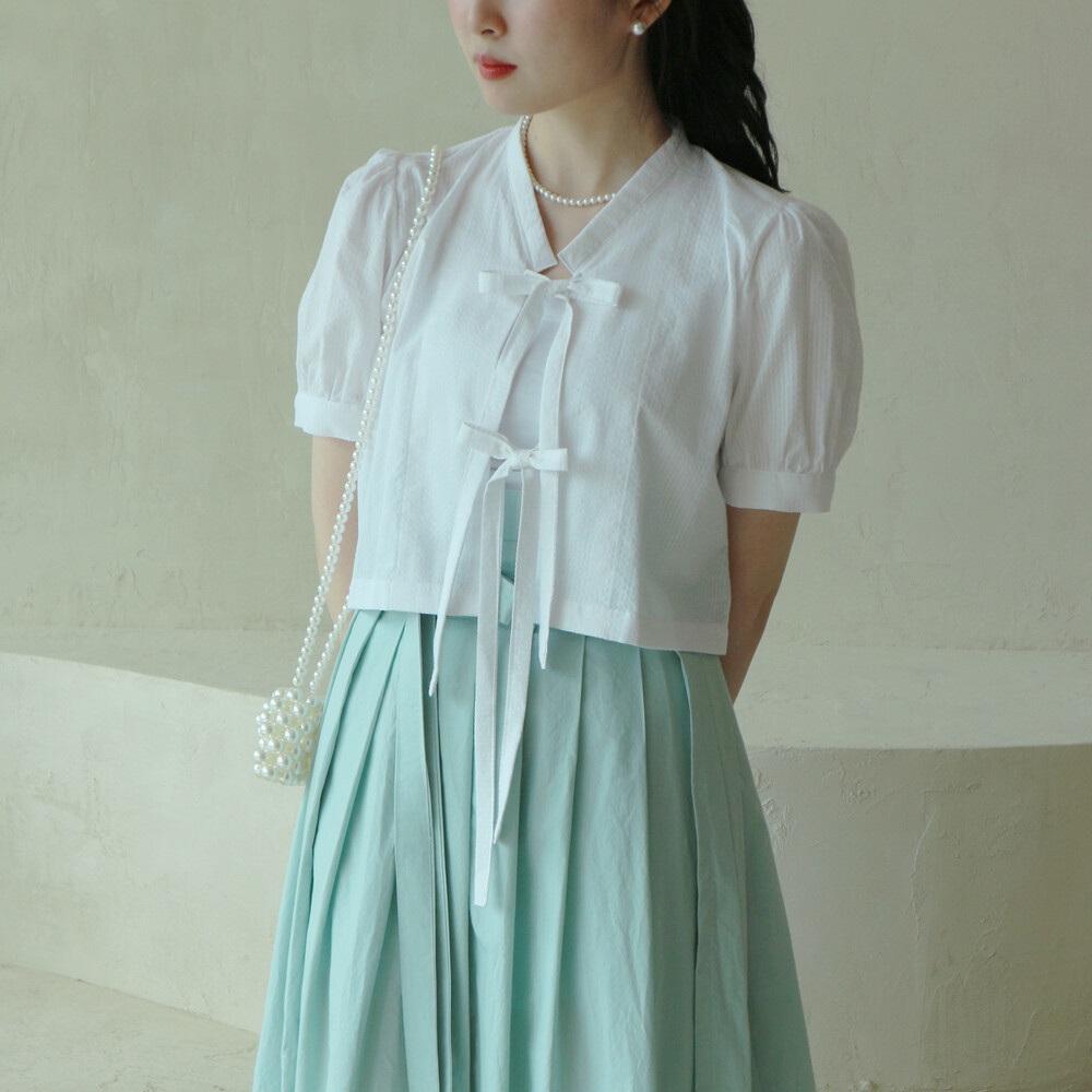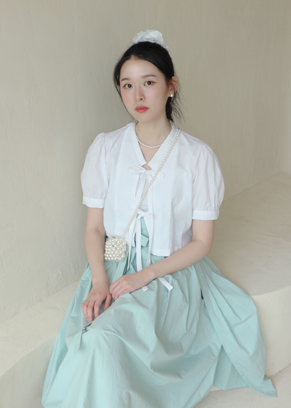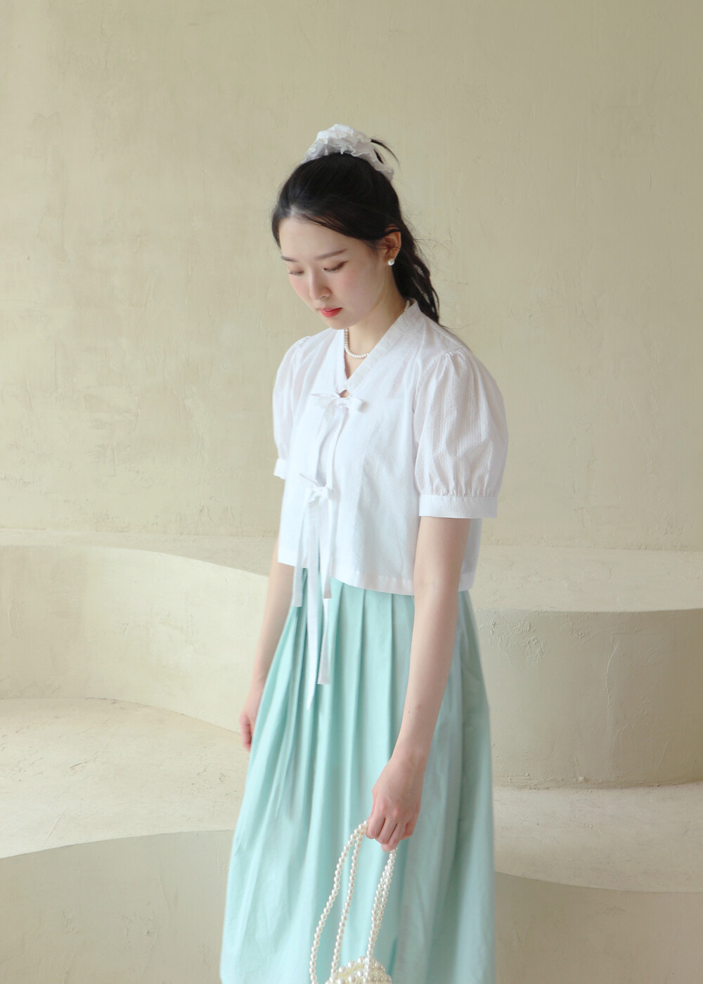 맞깃 저고리입니다. 퍼프소매에 커프스가 있으며 크롭기장으로
