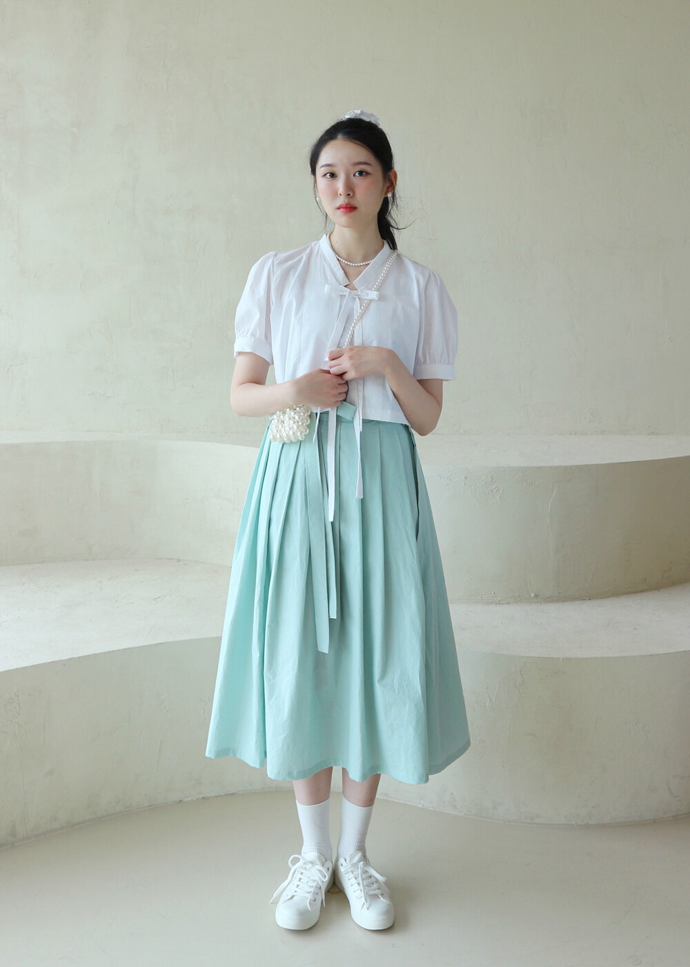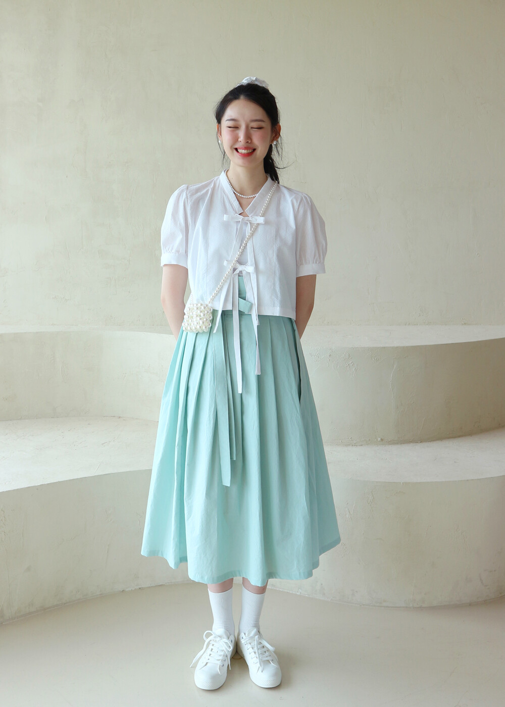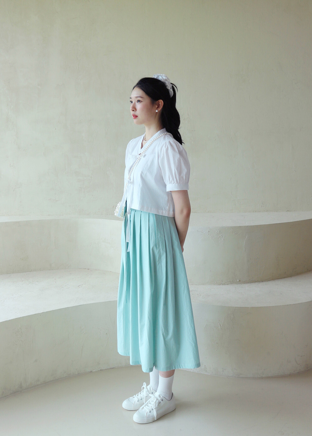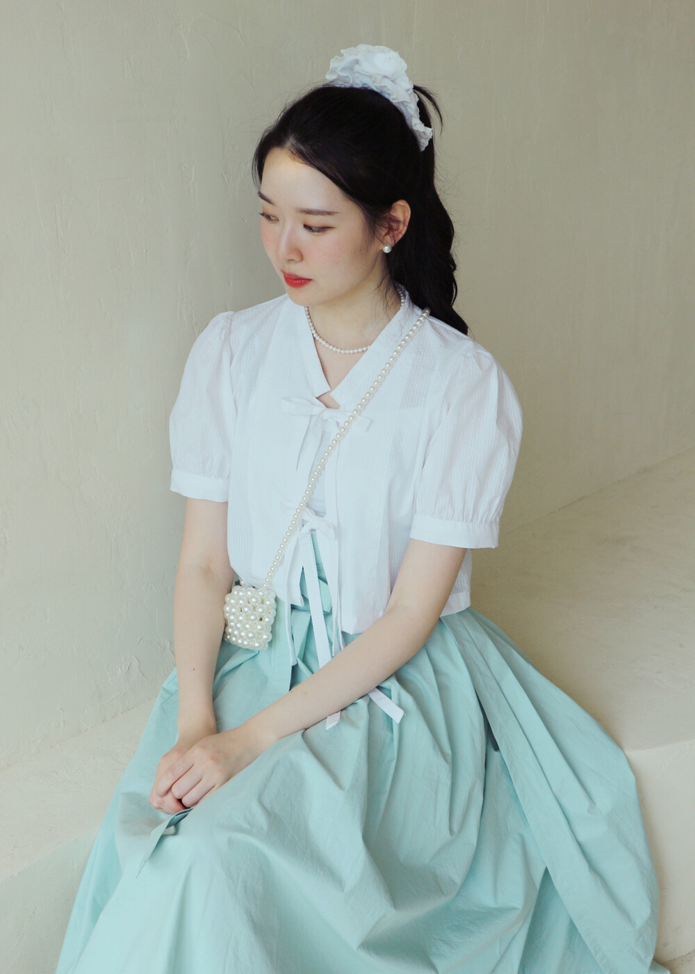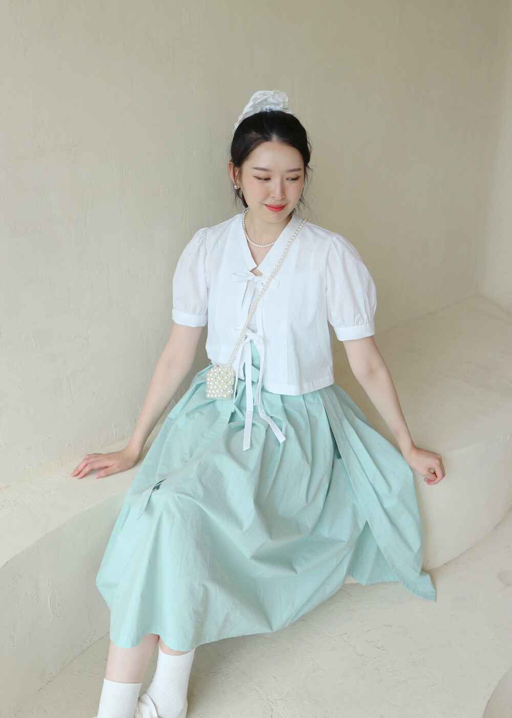 맞깃 저고리입니다. 퍼프소매에 커프스가 있으며 크롭기장으로