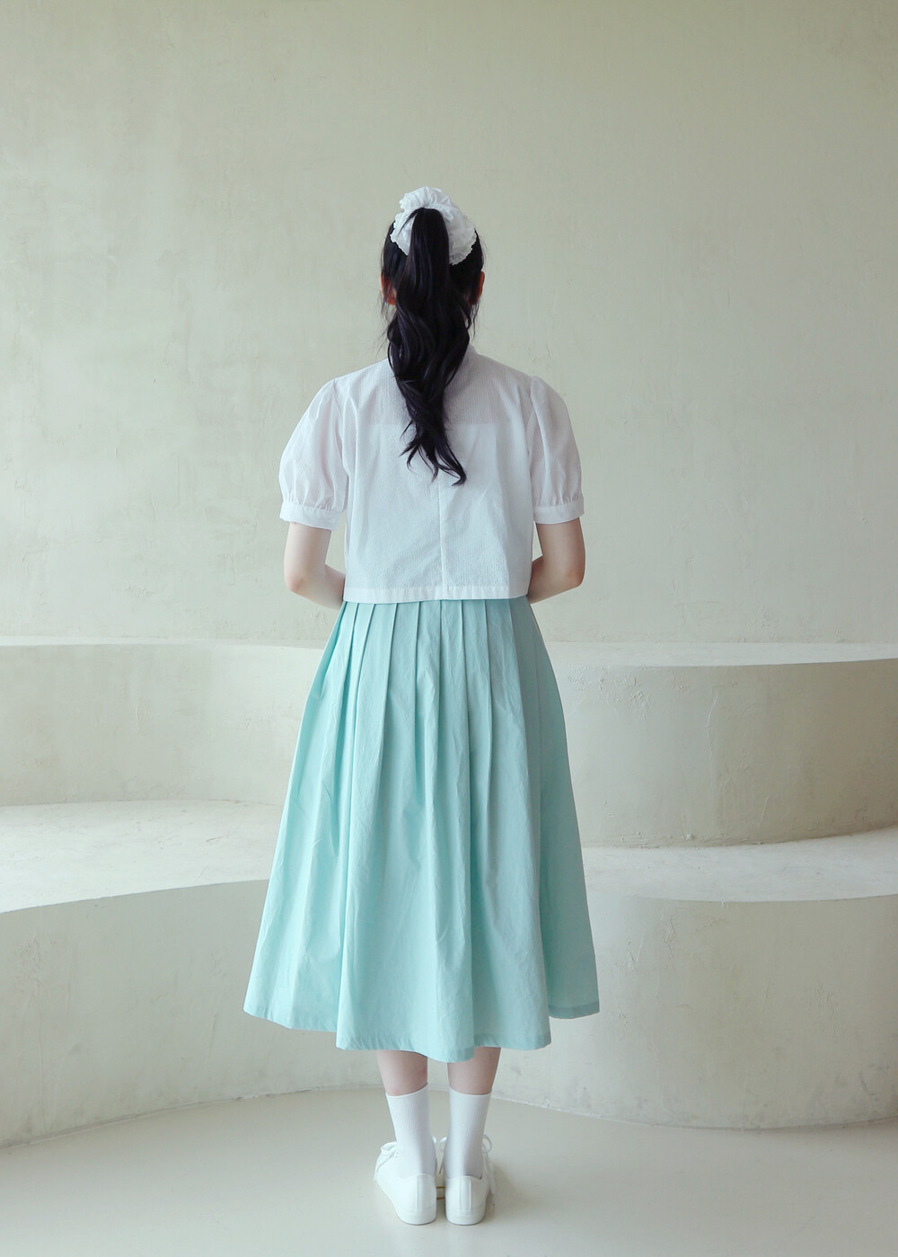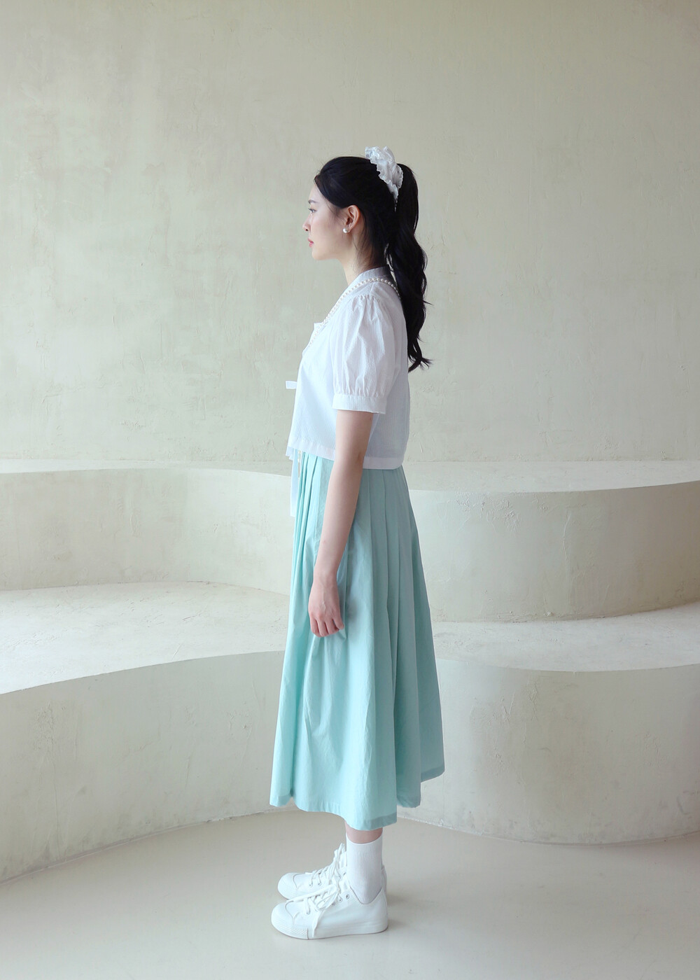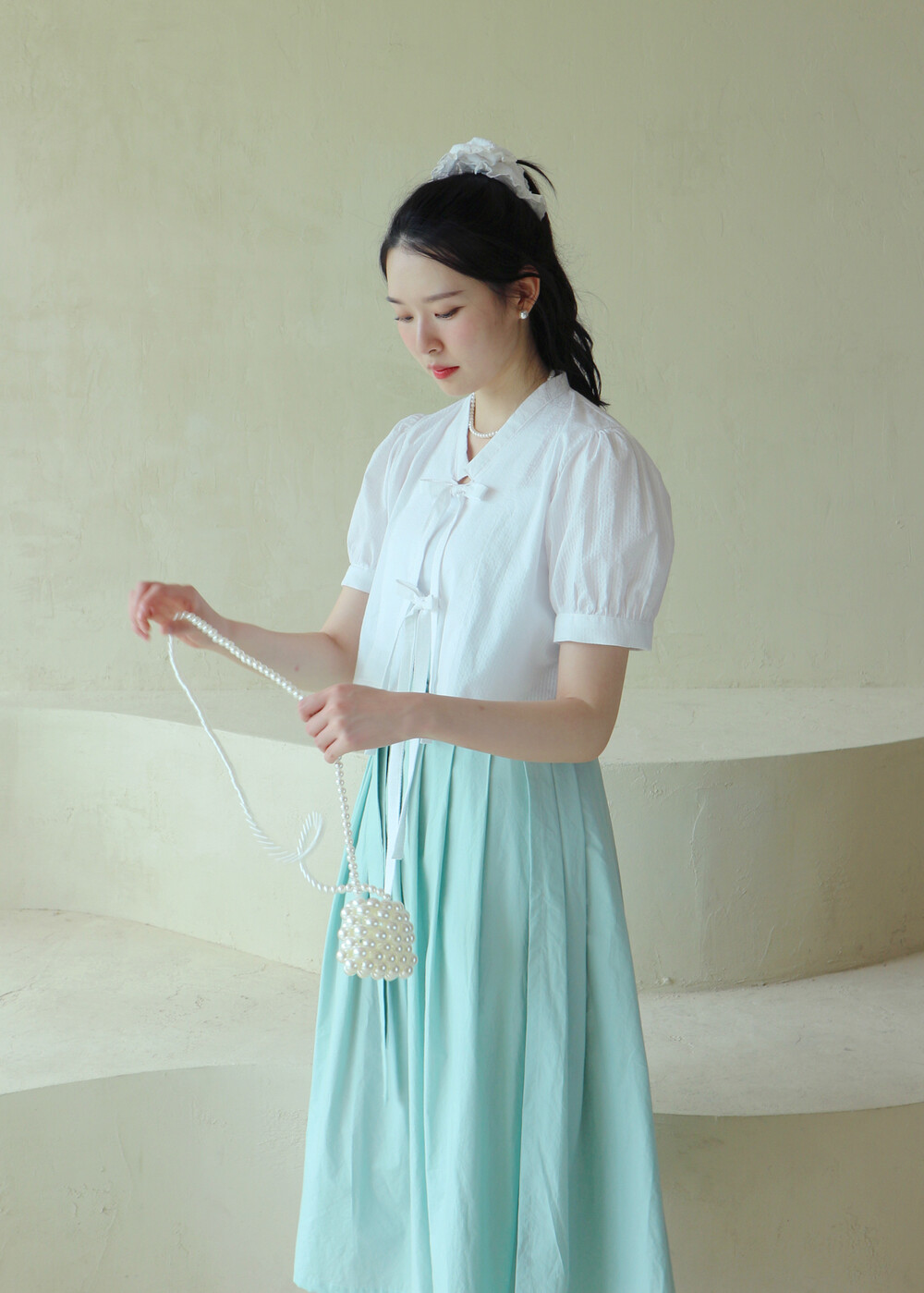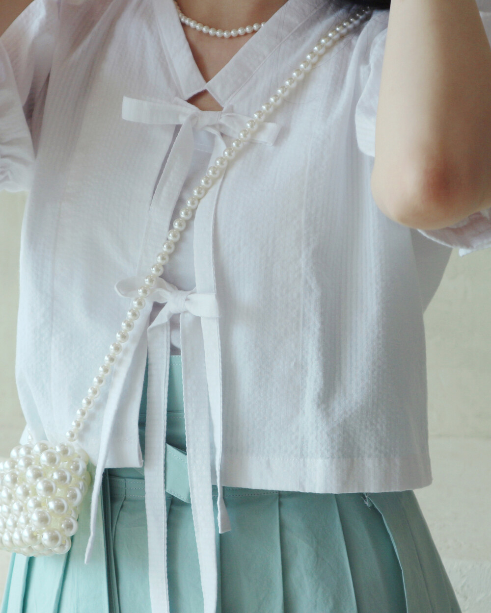 맞깃 저고리입니다. 퍼프소매에 커프스가 있으며 크롭기장으로