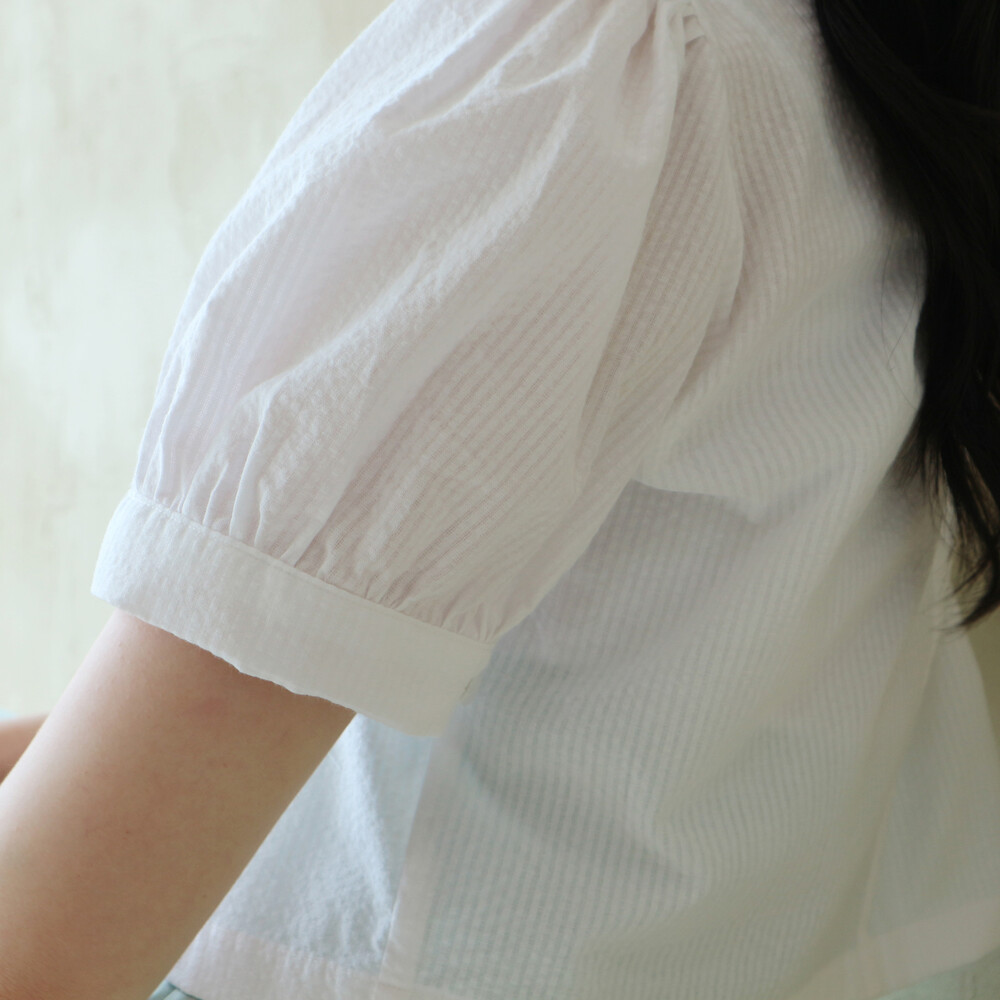 은은한 스트라이프 결이 있는 화이트 원단으로 제작 된