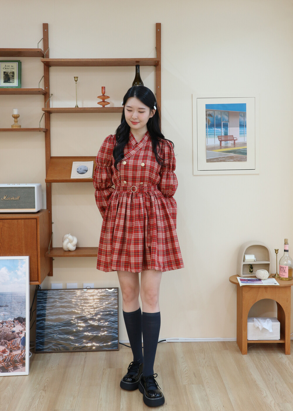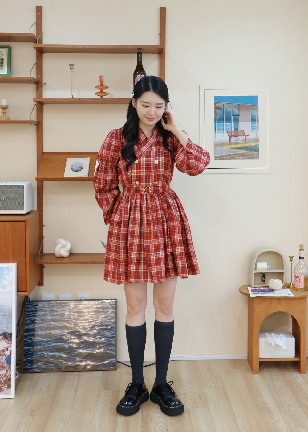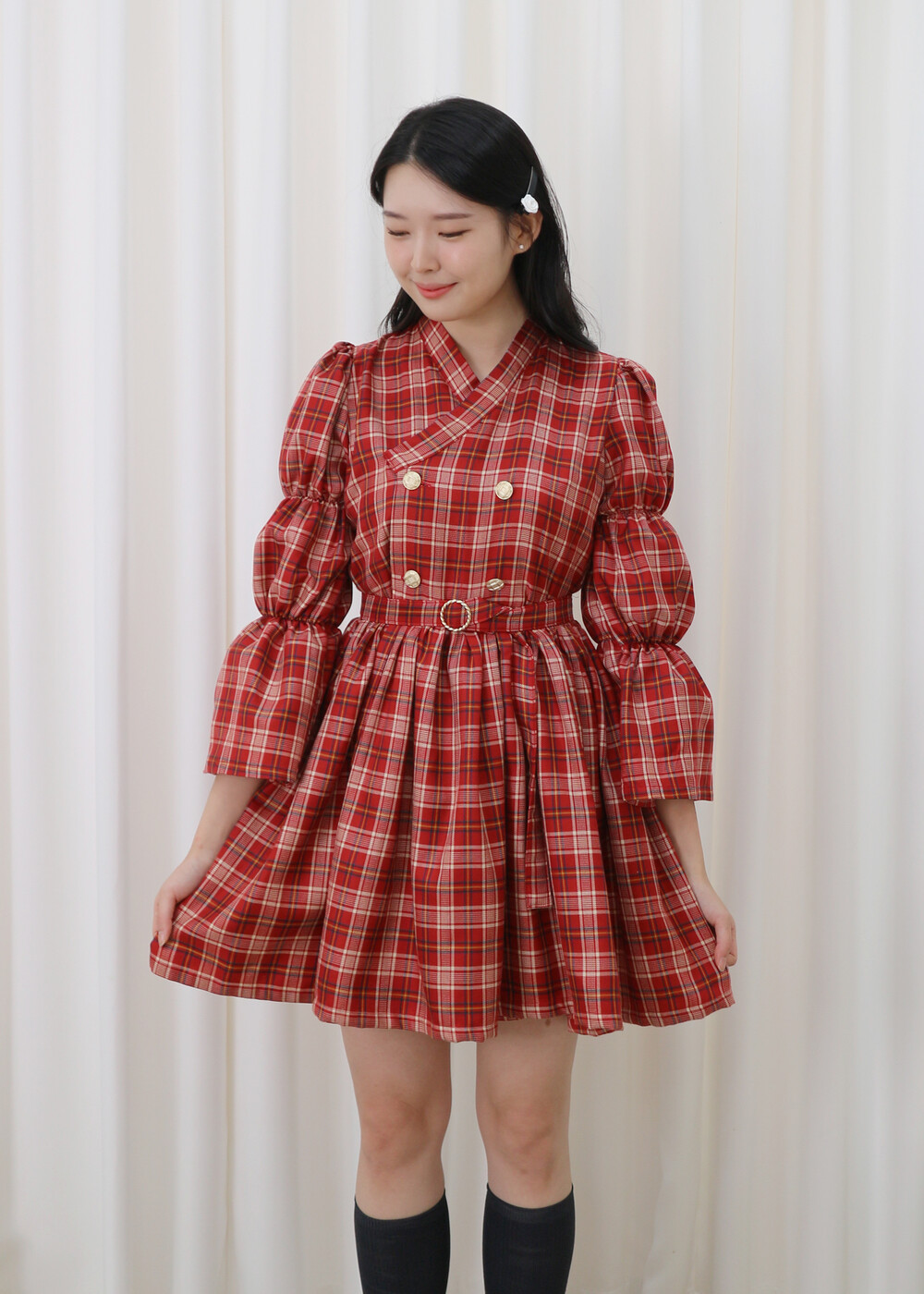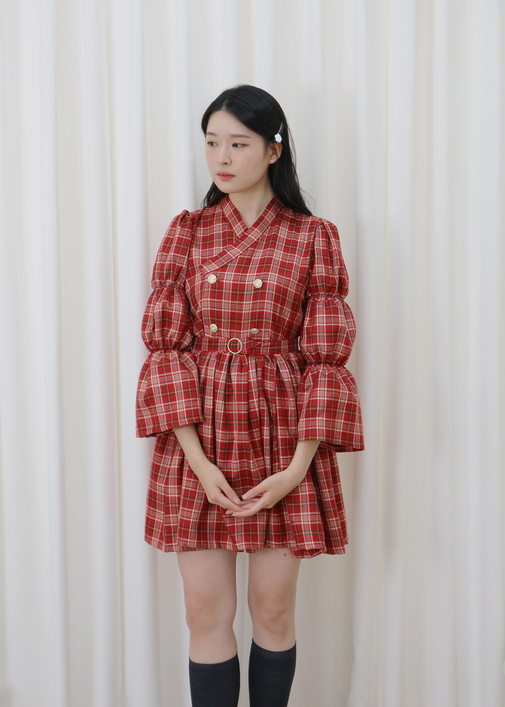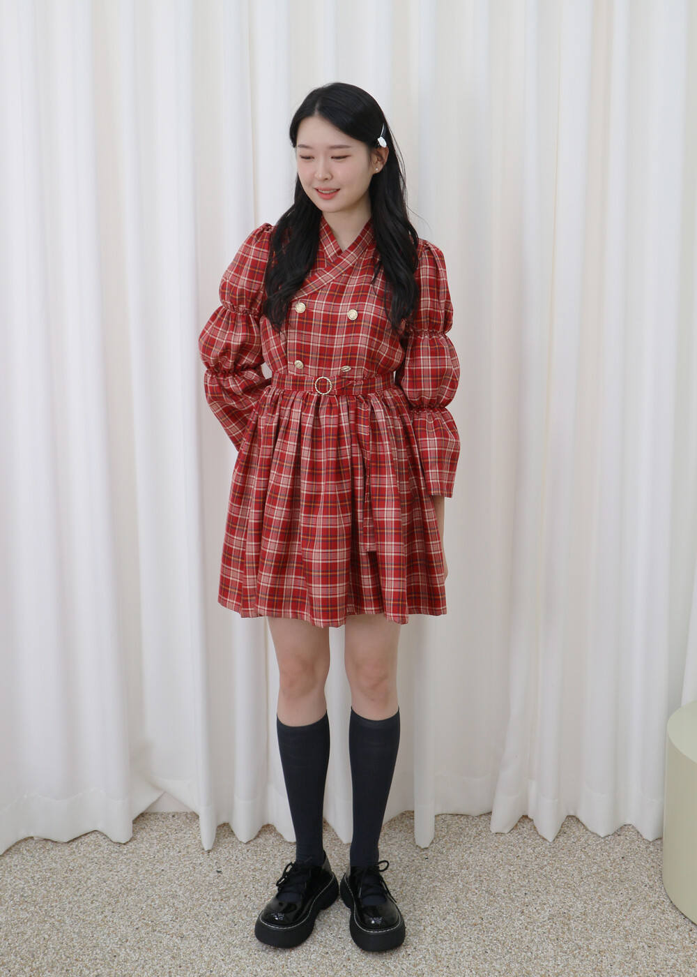 맑은 레드 체크 원단에 금장 단추와 꼬임 벨트로