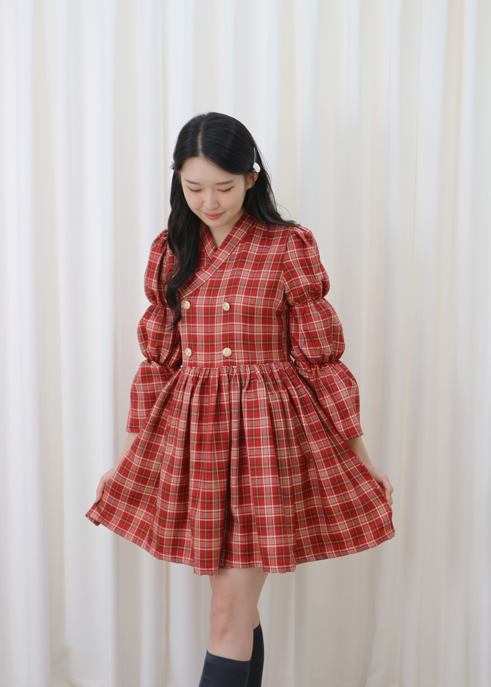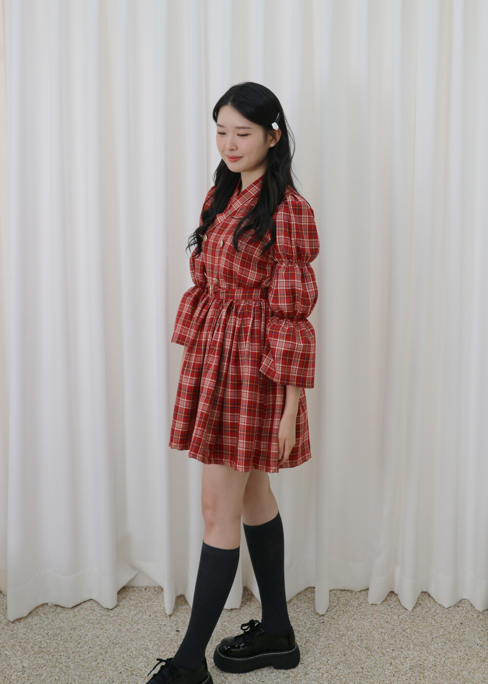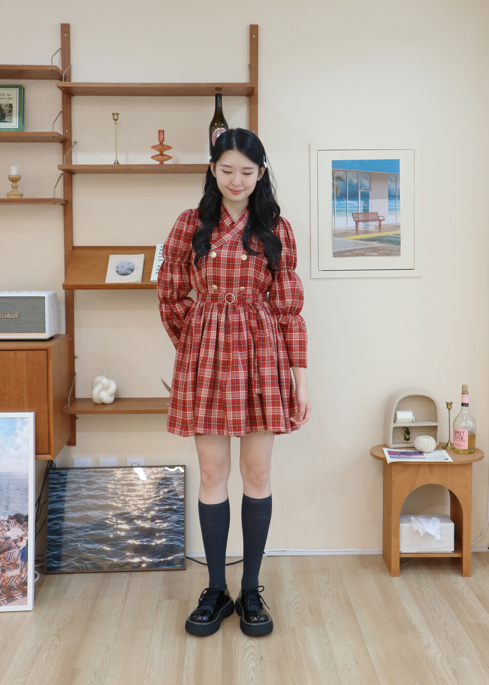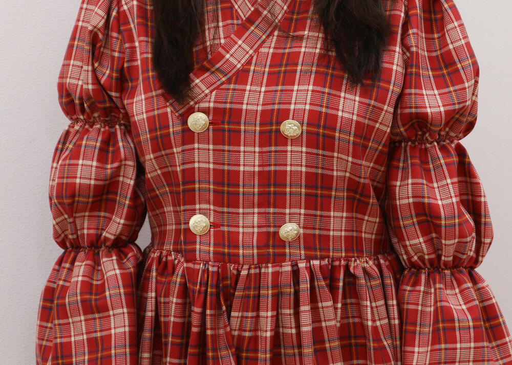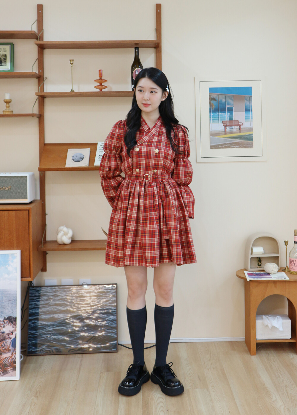 맑은 레드 체크 원단에 금장 단추와 꼬임 벨트로
