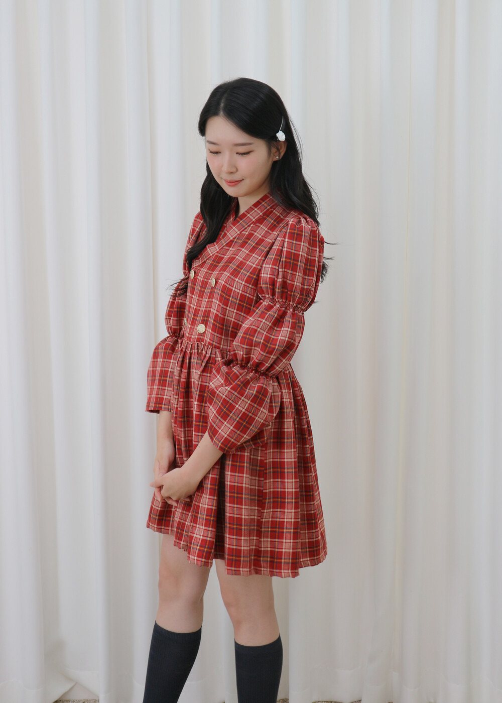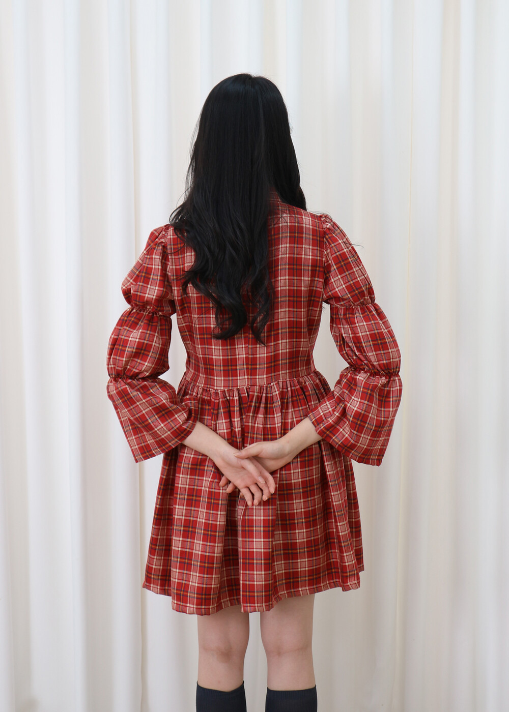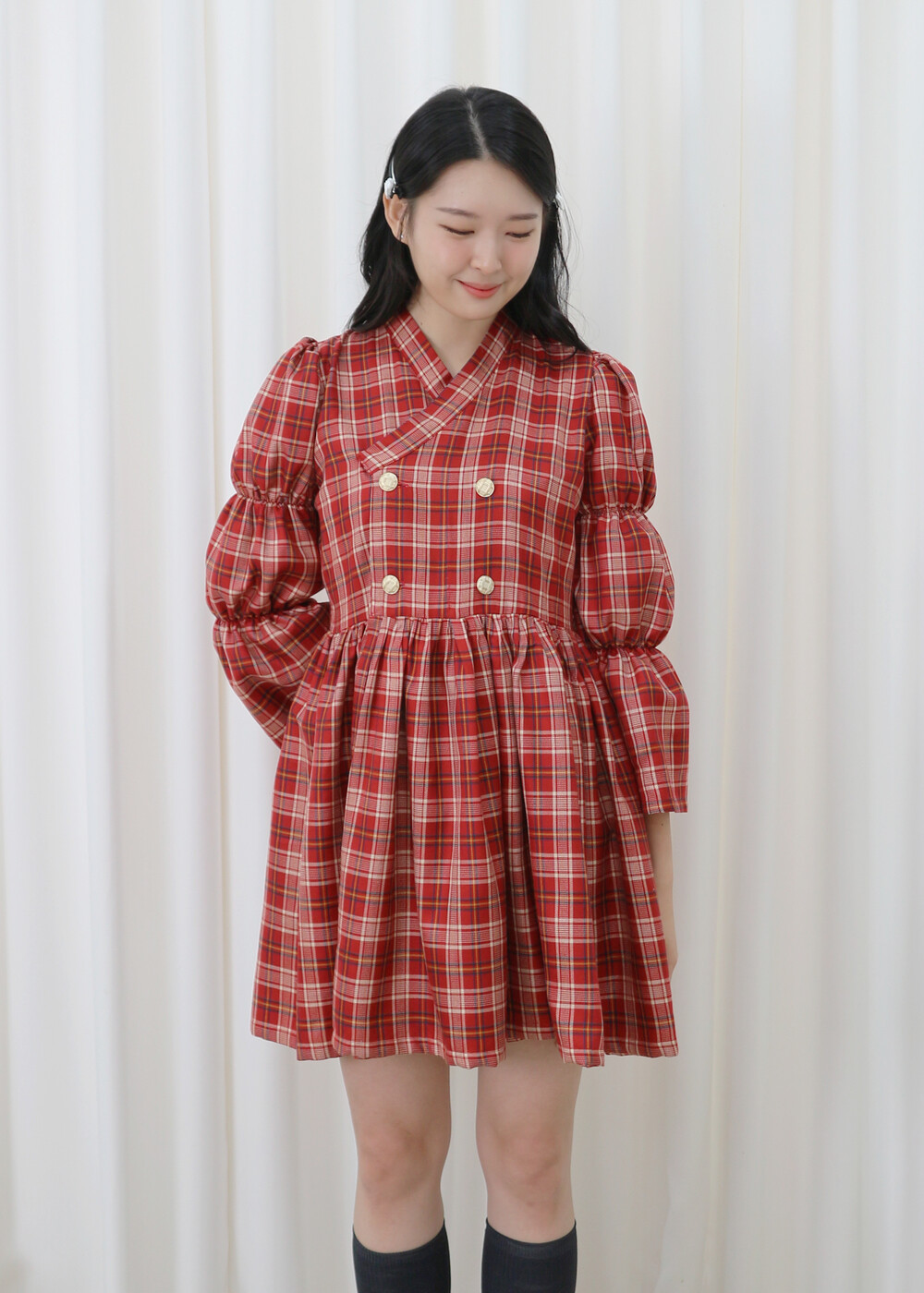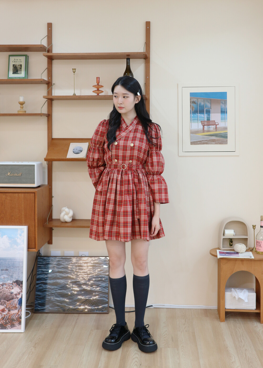 맑은 레드 체크 원단에 금장 단추와 꼬임 벨트로