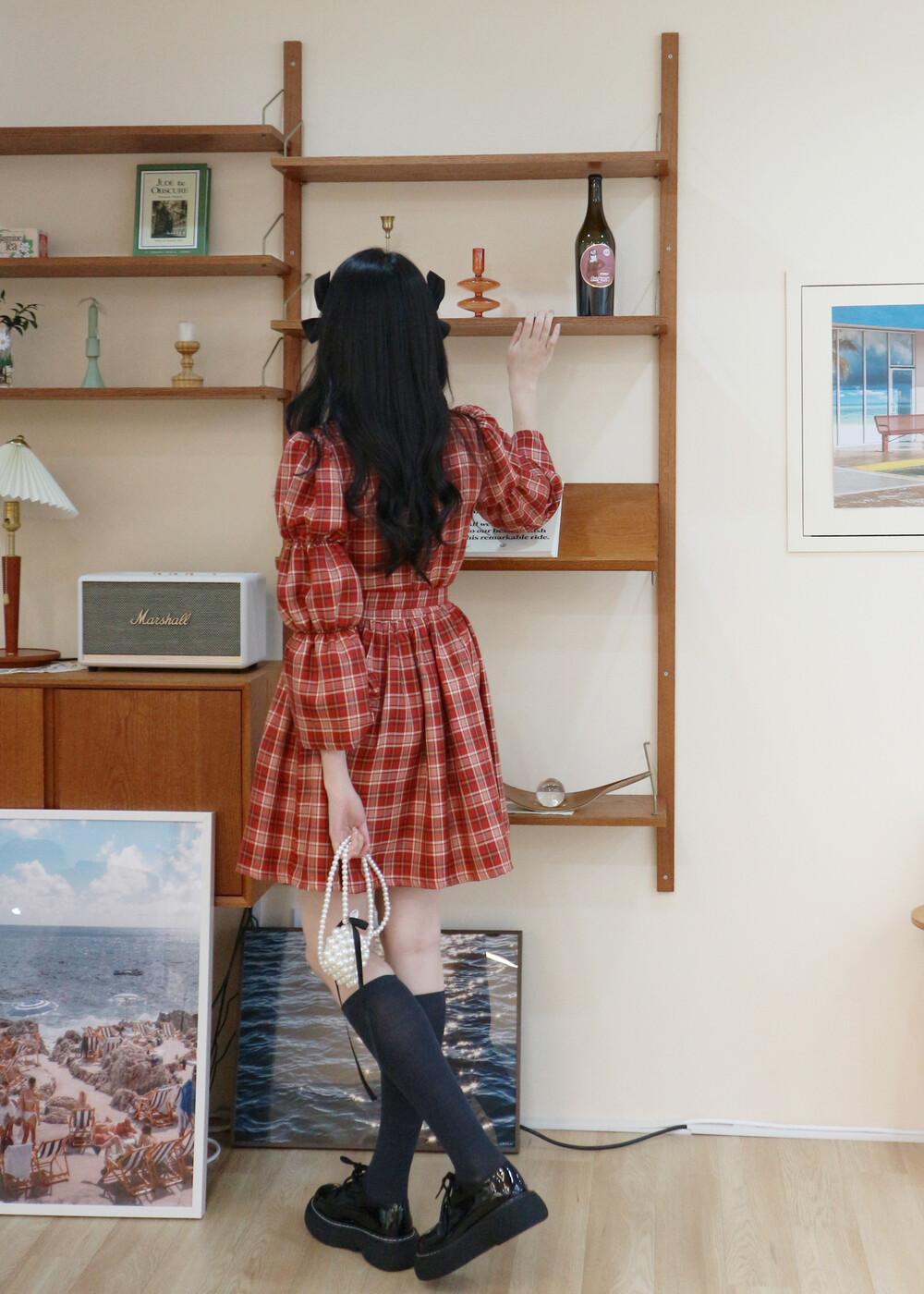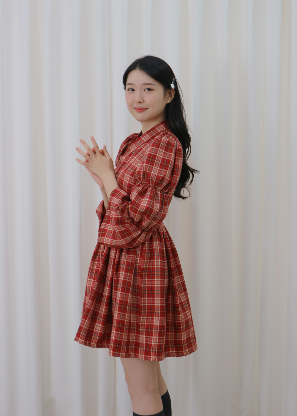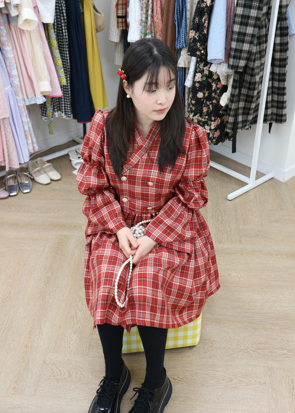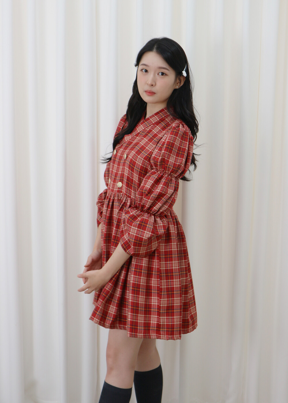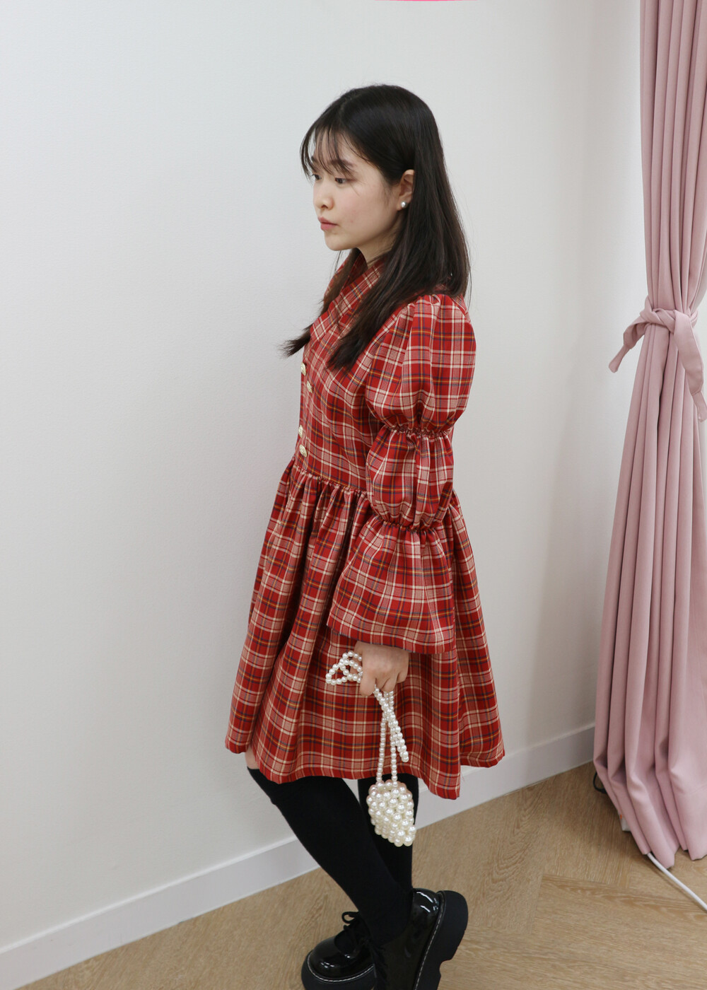 맑은 레드 체크 원단에 금장 단추와 꼬임 벨트로