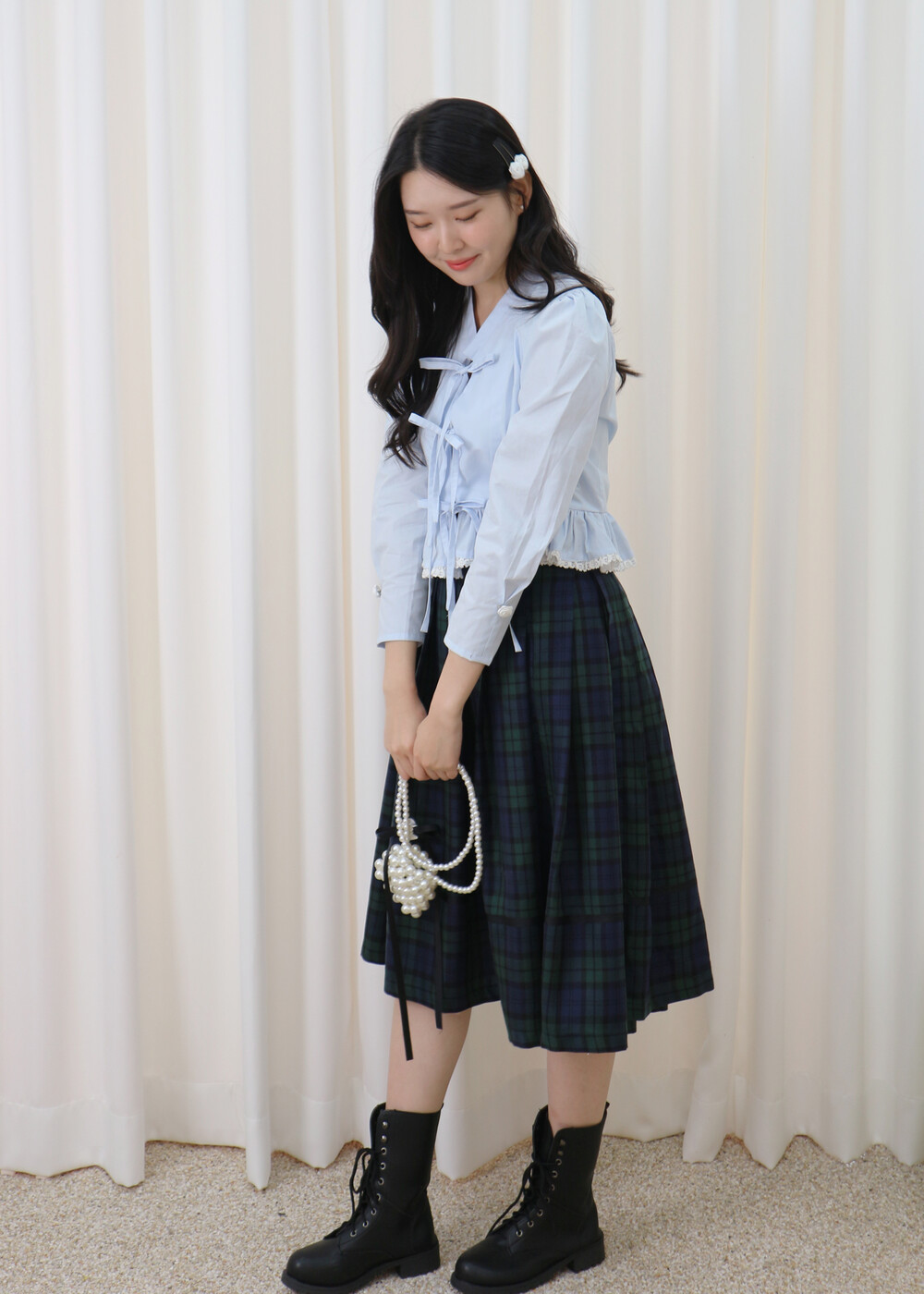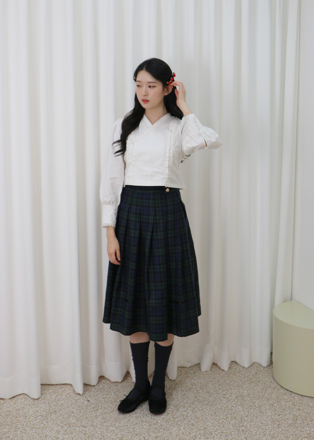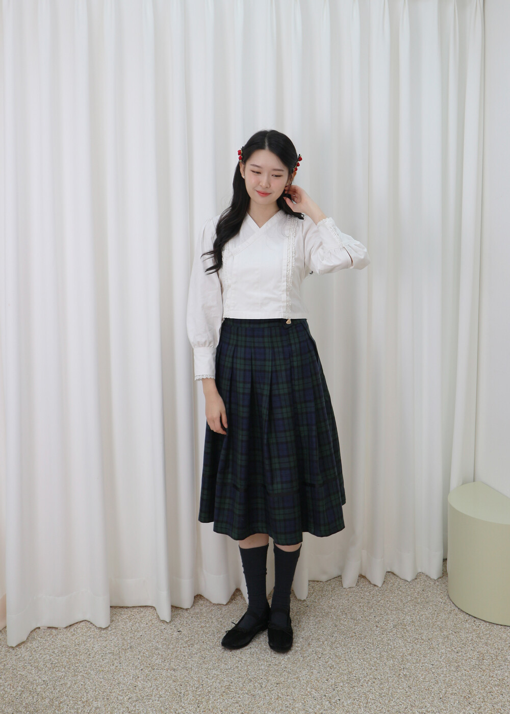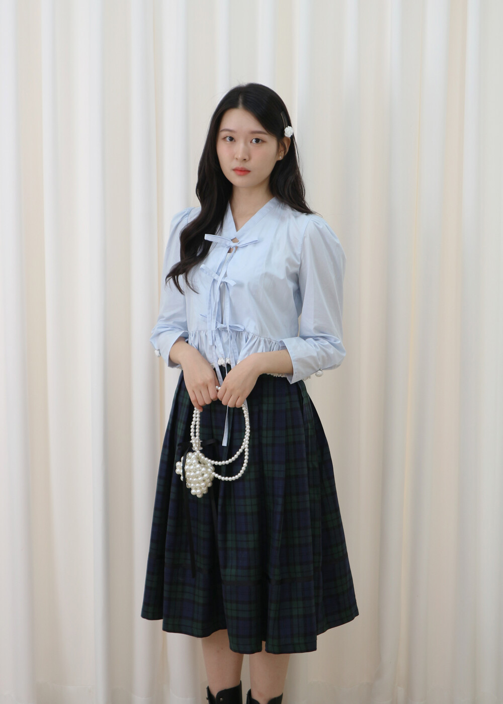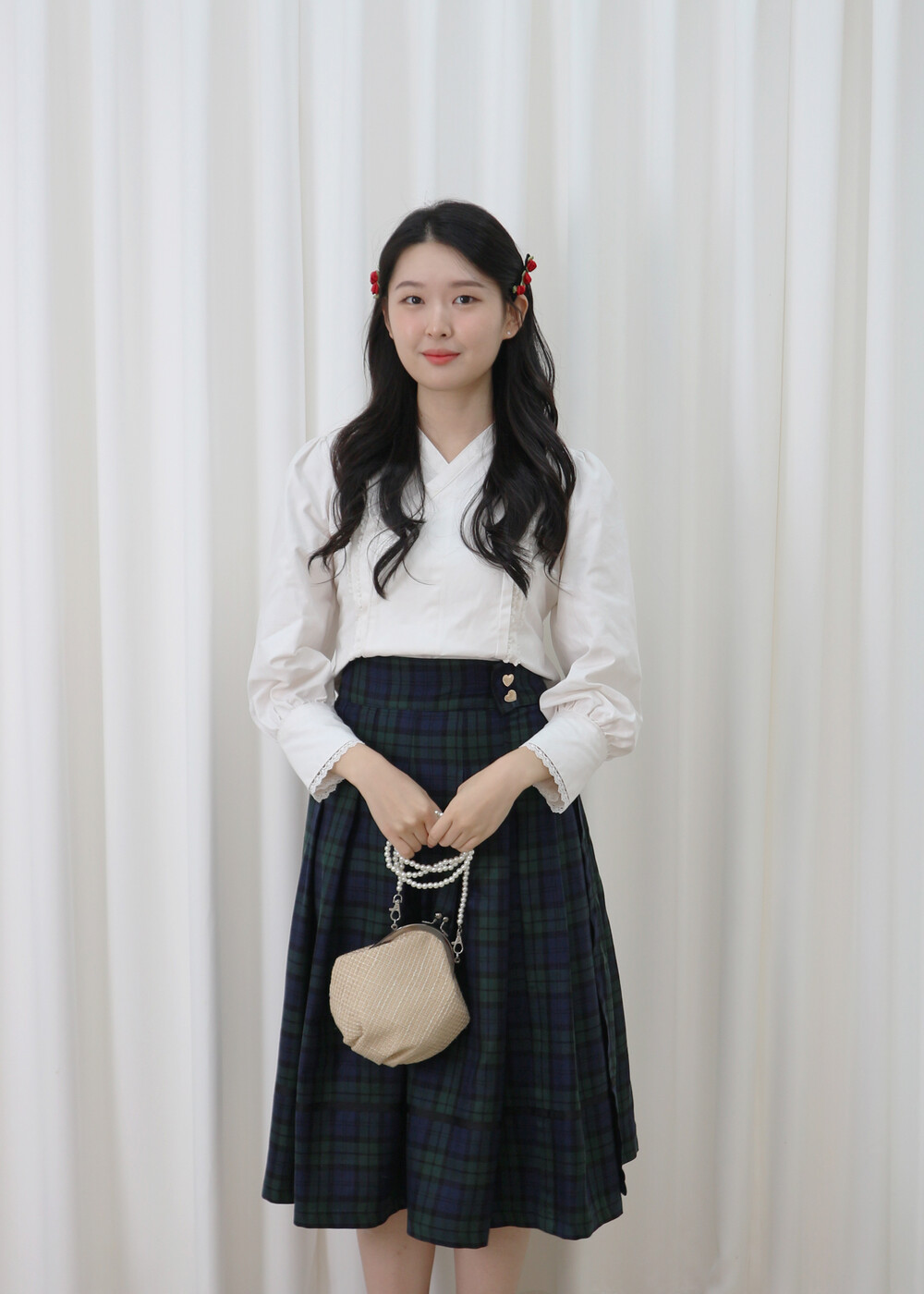 말기와 하트단추로 포인트를 주었으며, 테니스 치마 처럼