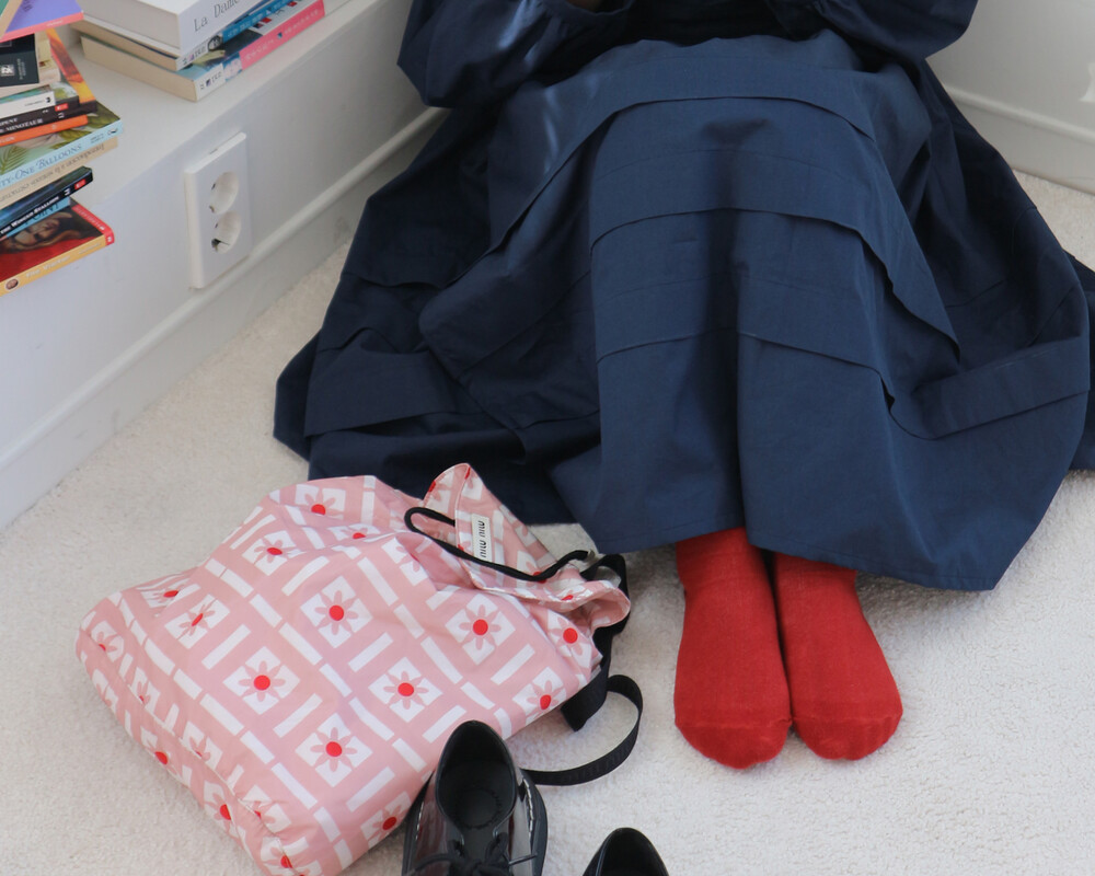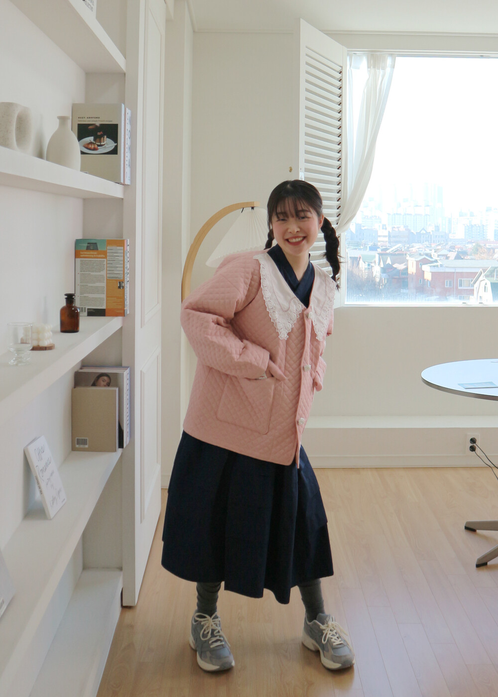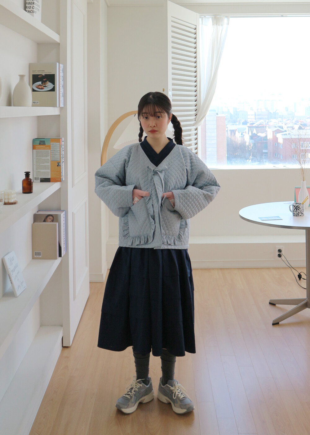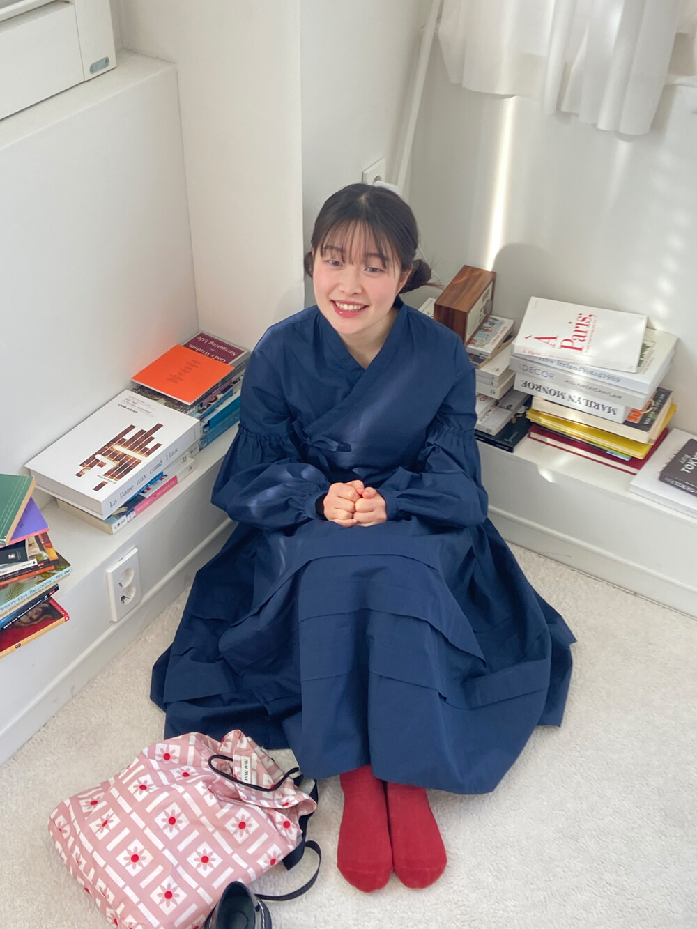 치마의 3단 핀턱과 어깨에는 퍼프가 없어서 슬림하게 떨어지지만
