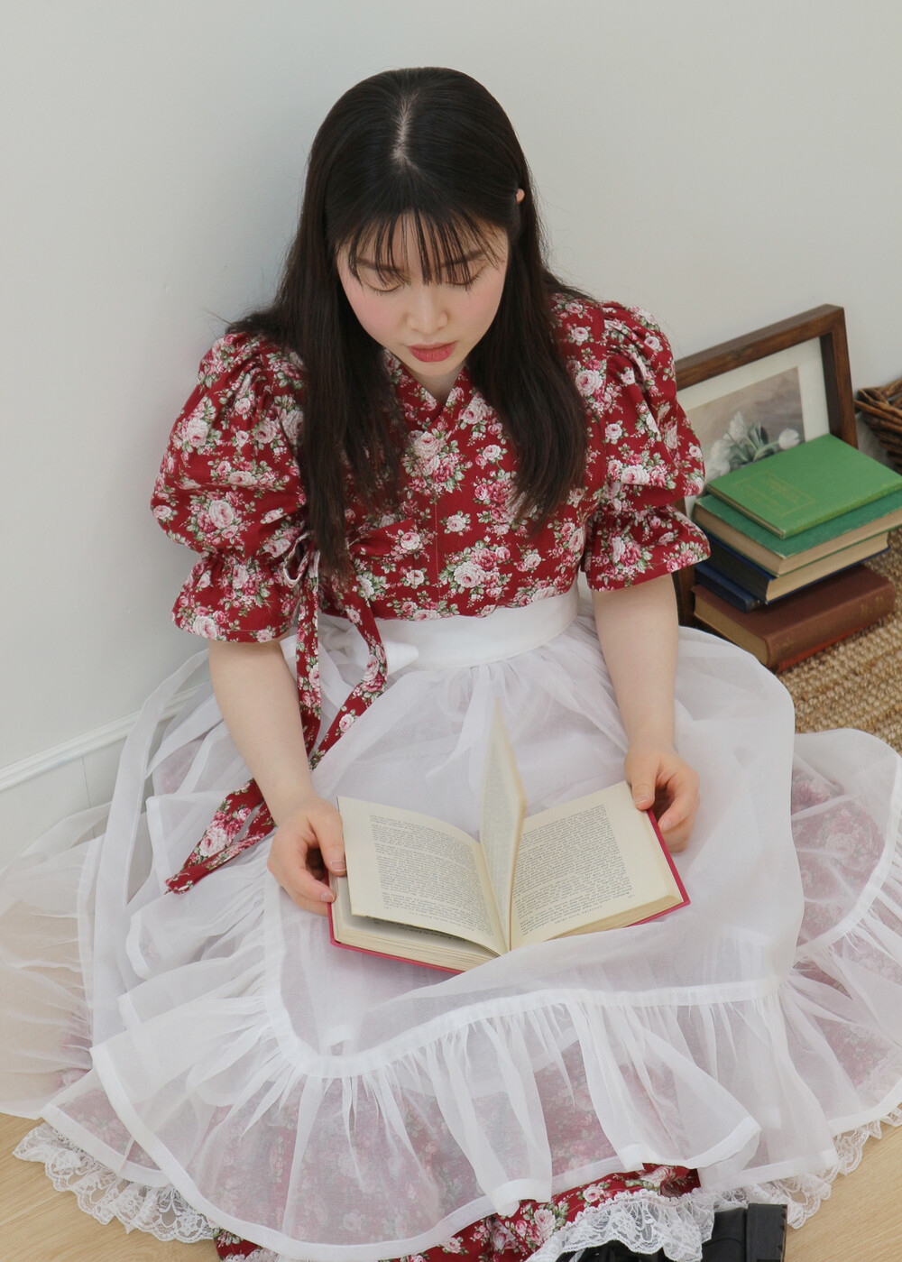 풍성한 퍼프소매에 고무줄로 소매를 연출하고,