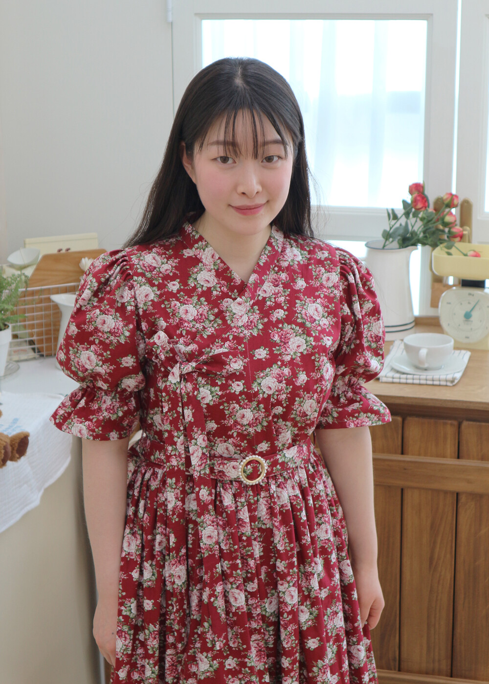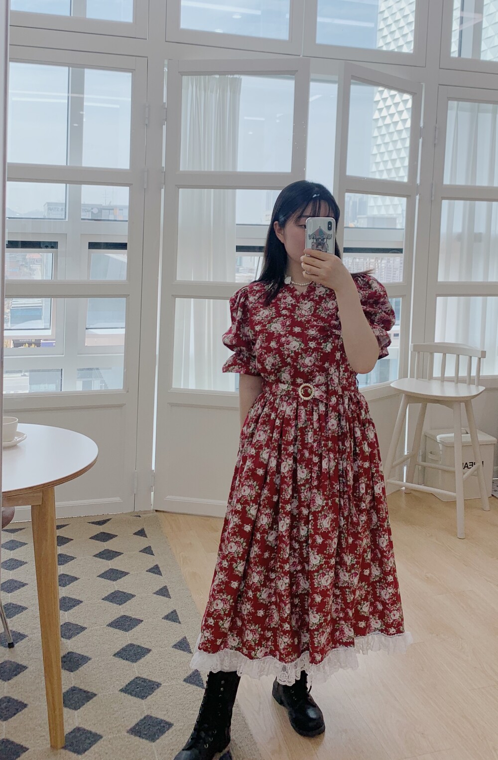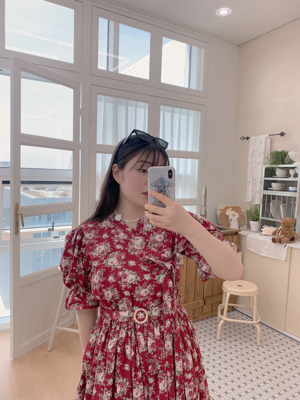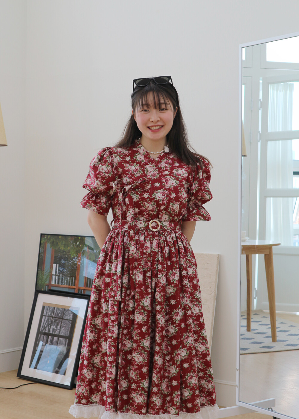 진한색감의 플라워 패턴으로 제작 된 원피스입니다.