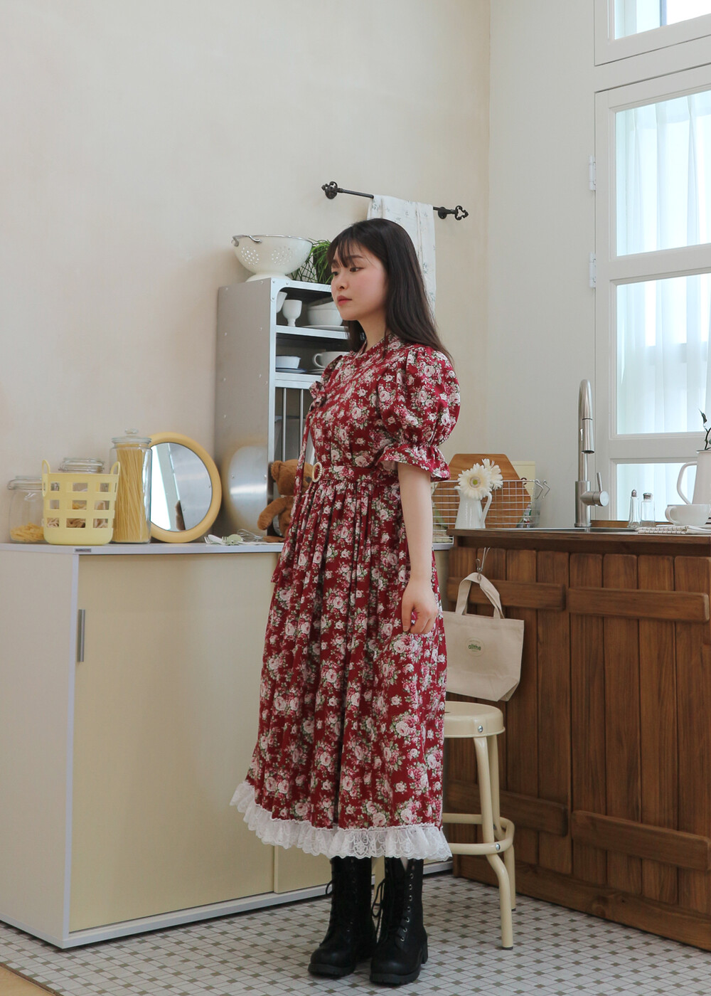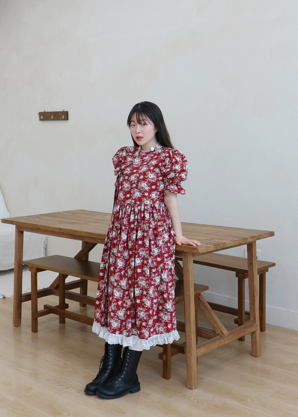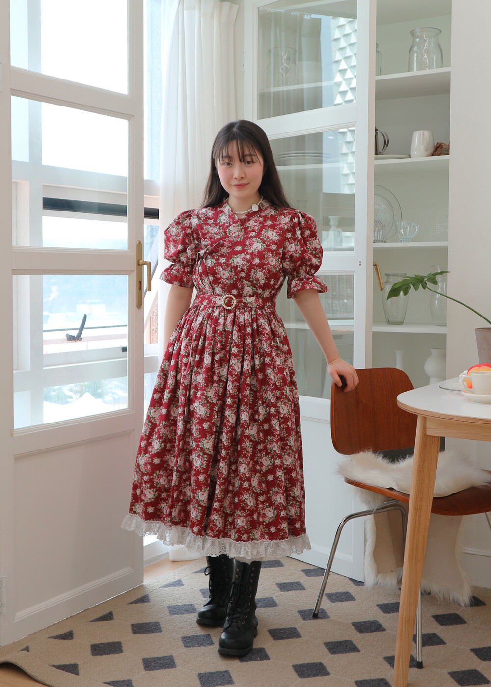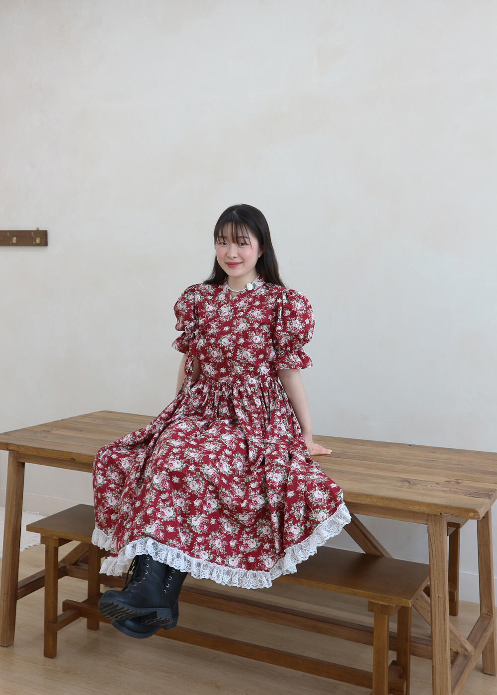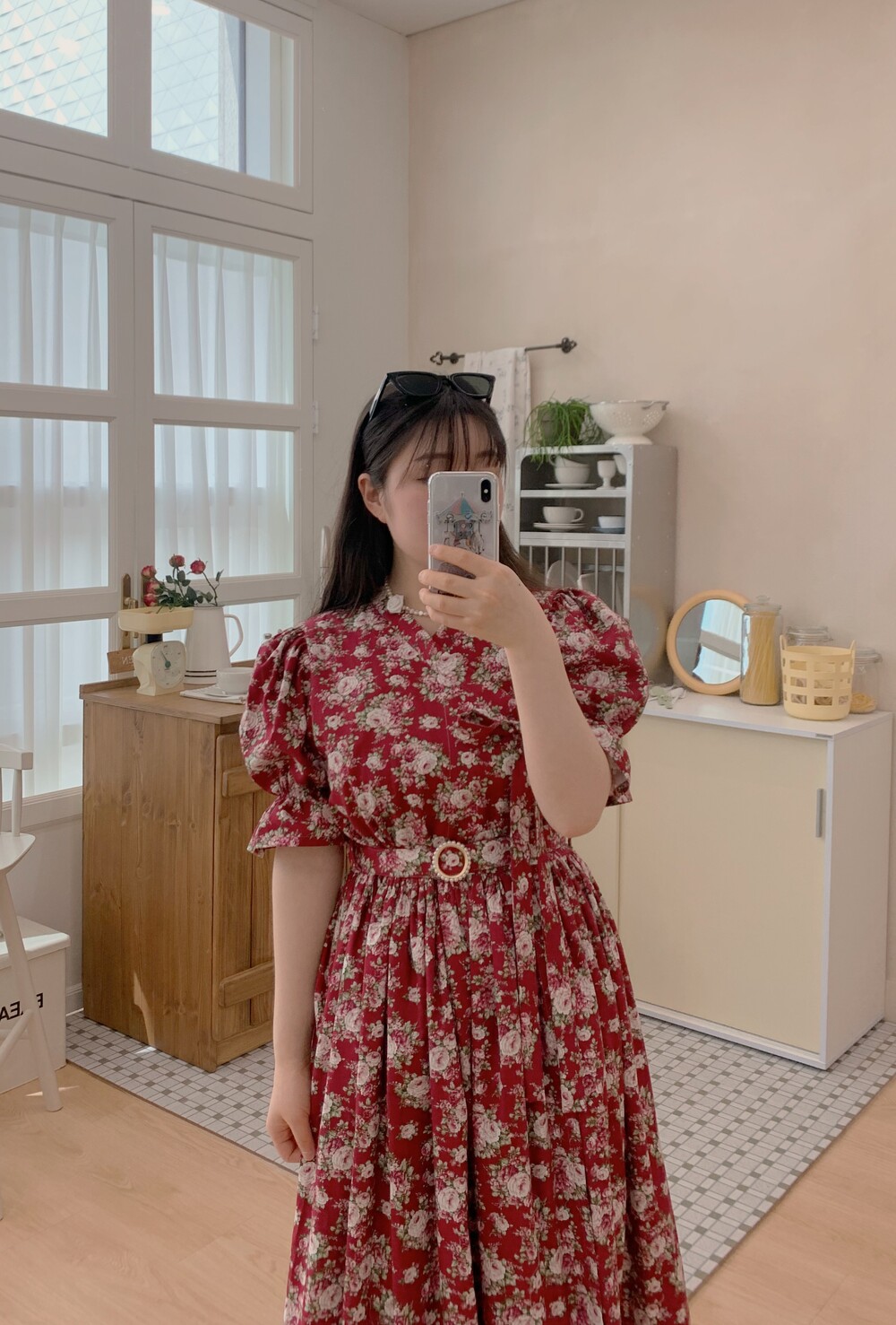 진한색감의 플라워 패턴으로 제작 된 원피스입니다.