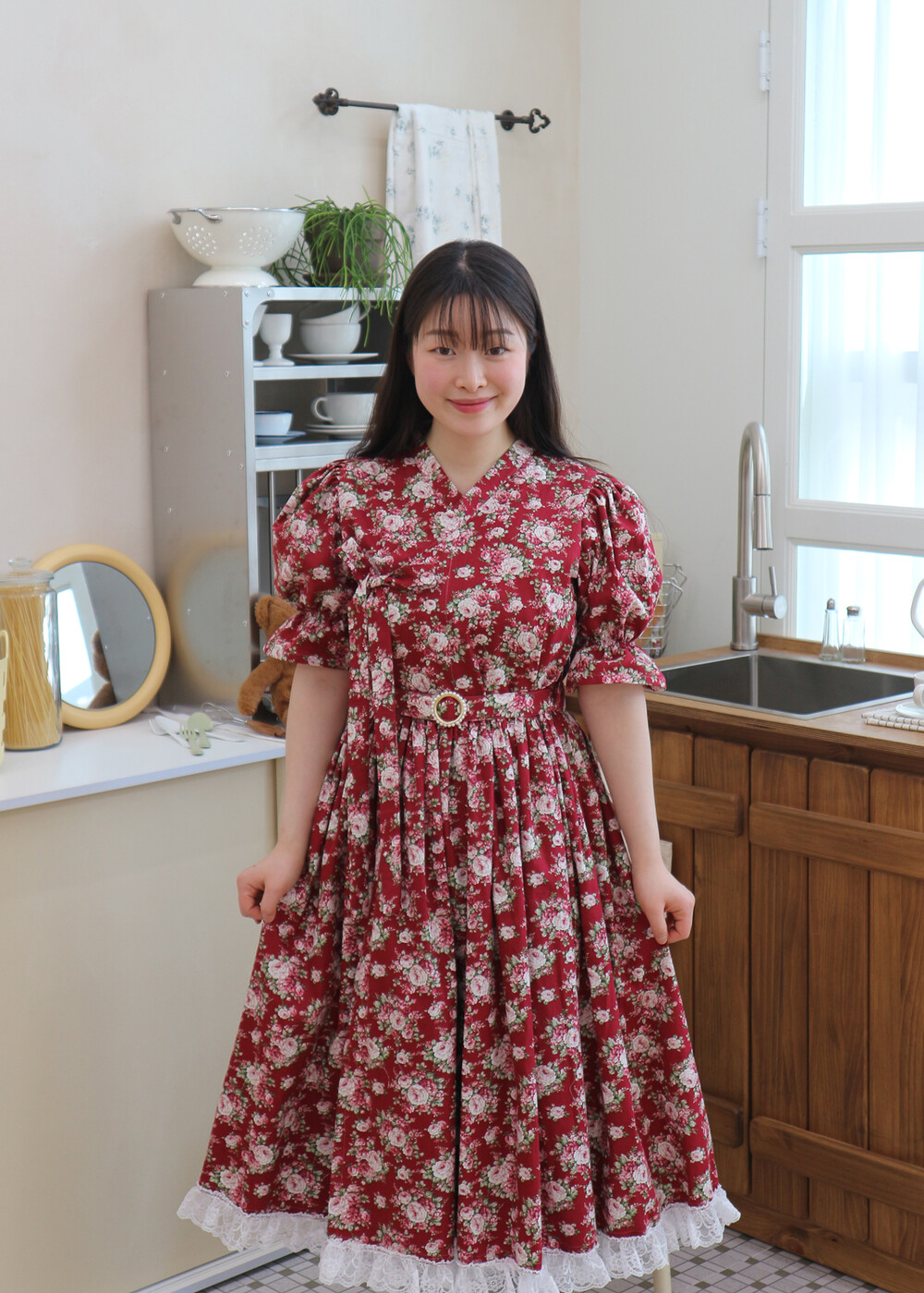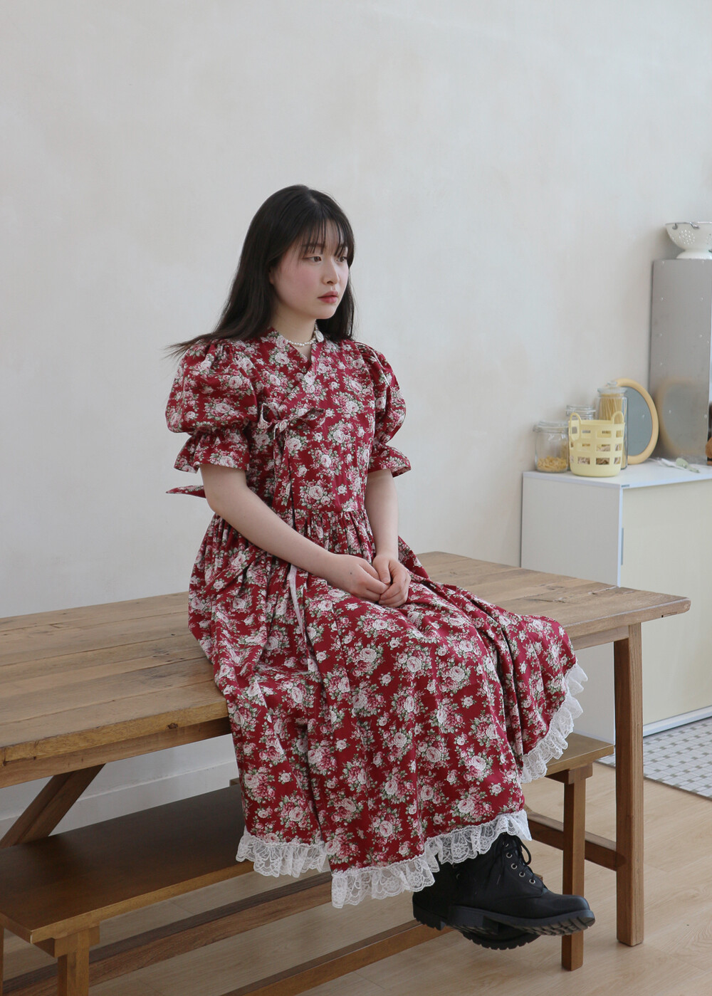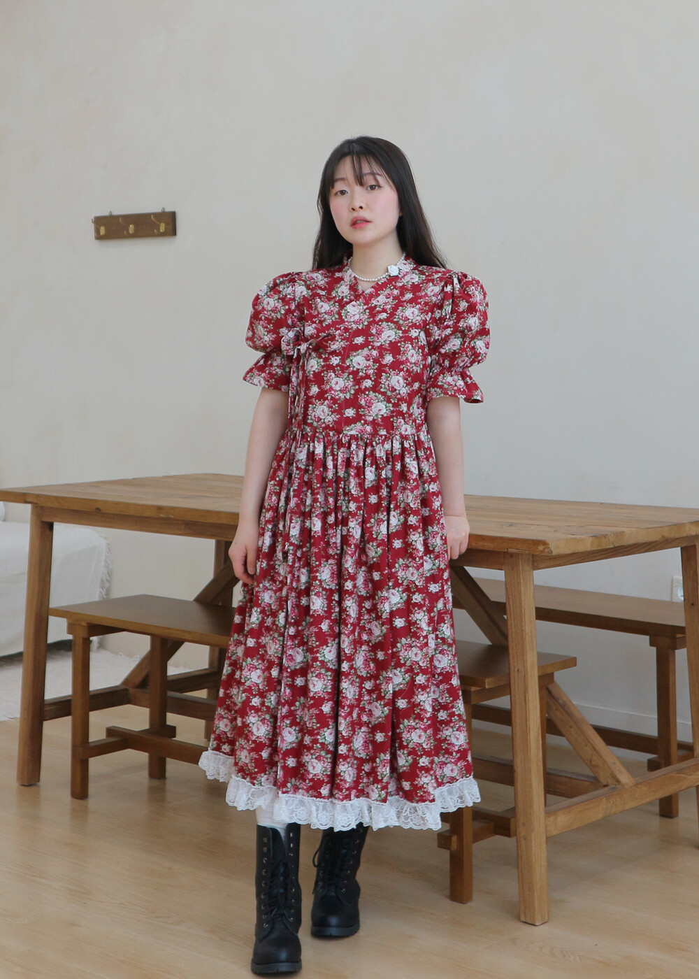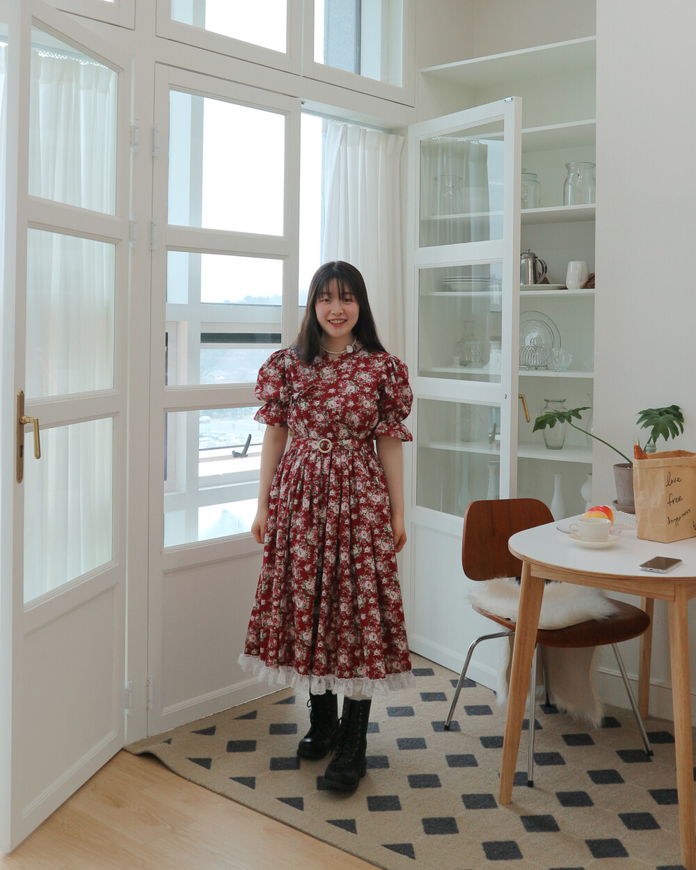 진한색감의 플라워 패턴으로 제작 된 원피스입니다.