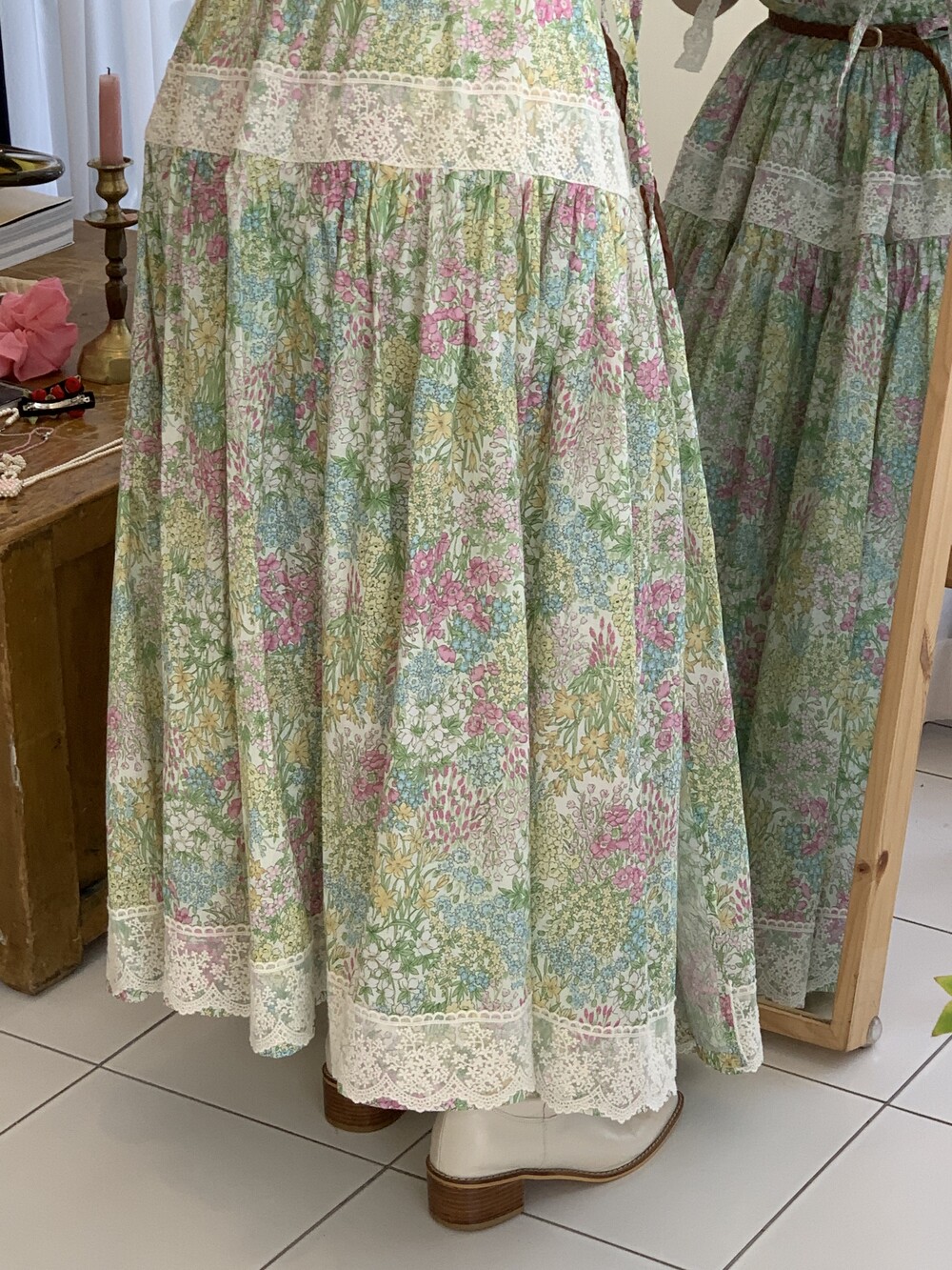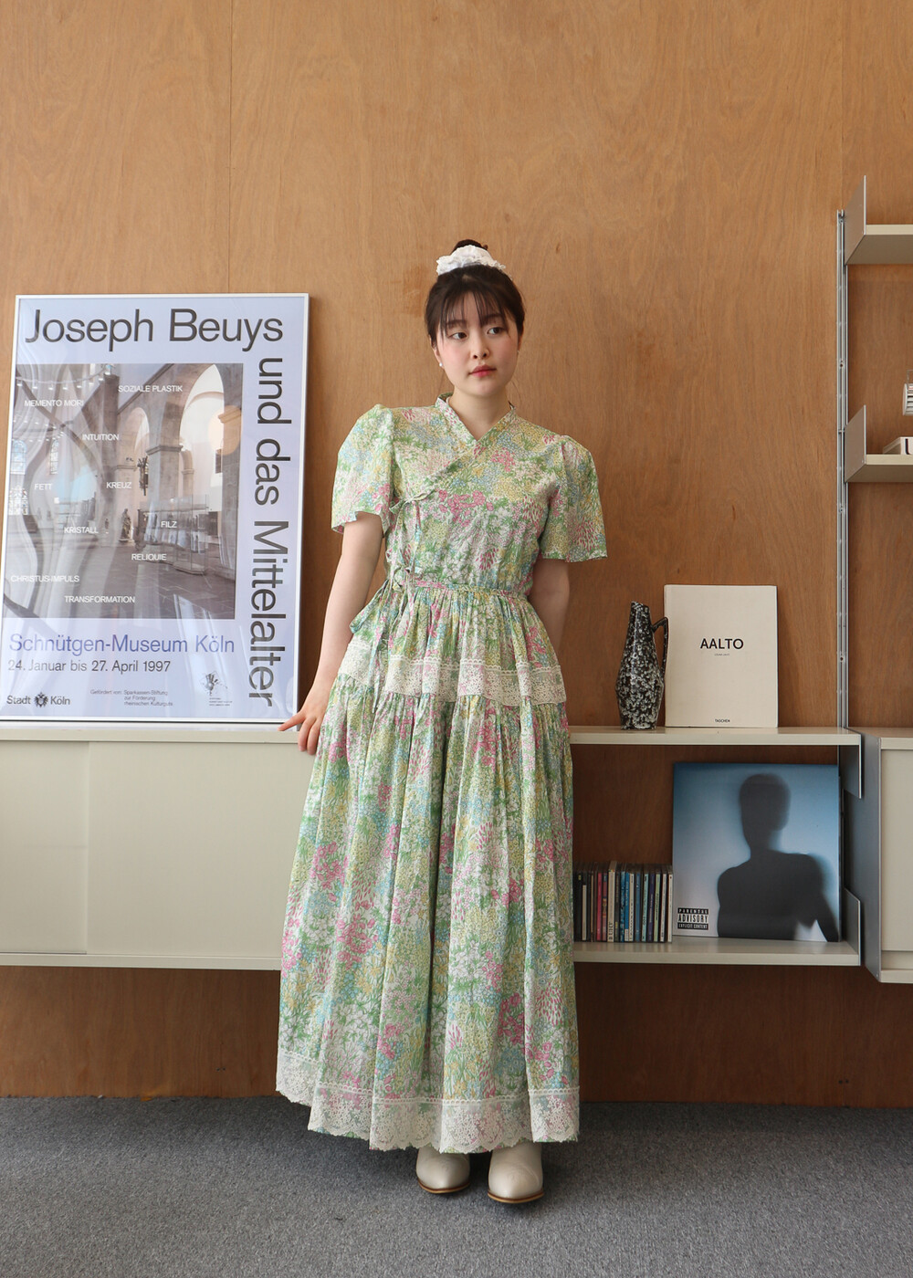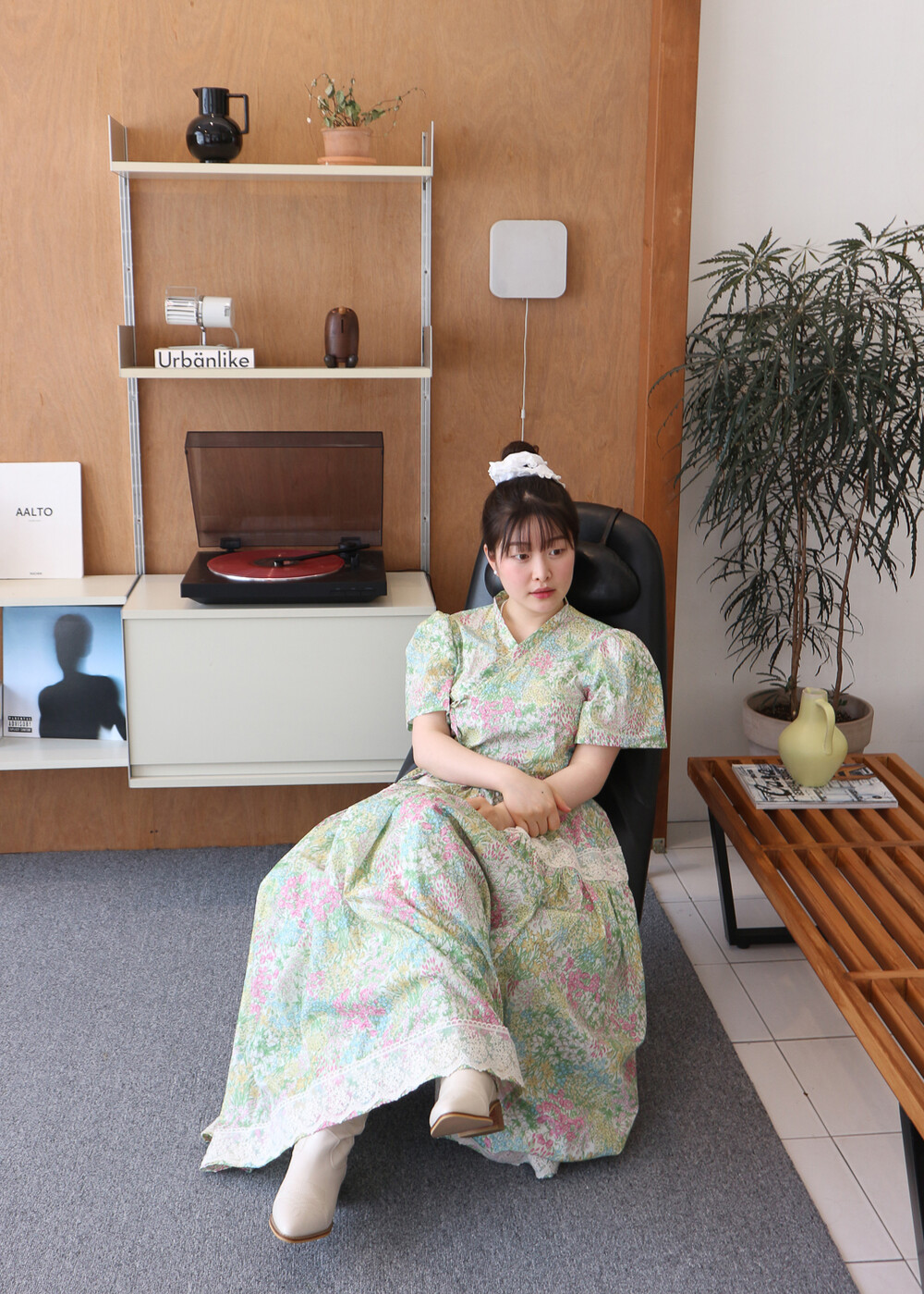 치마 아랫단과 중간에 넓은 아이보리 레이스를 달아주어 포인트를