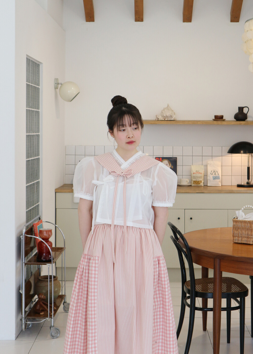 풍성한 퍼프소매에 크롭기장으로 제작되었습니다.
