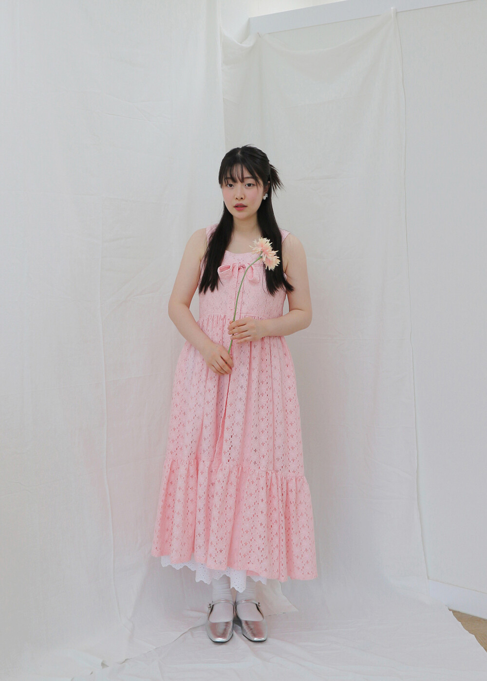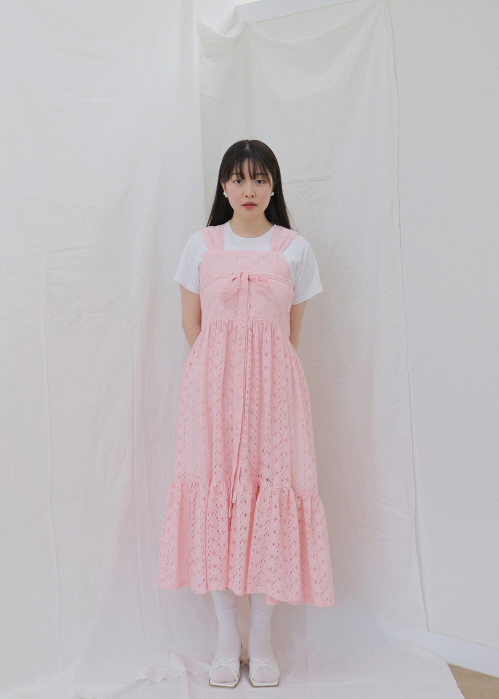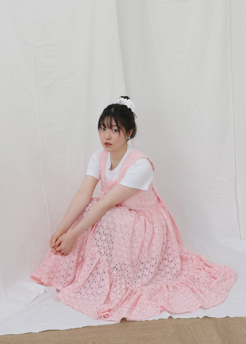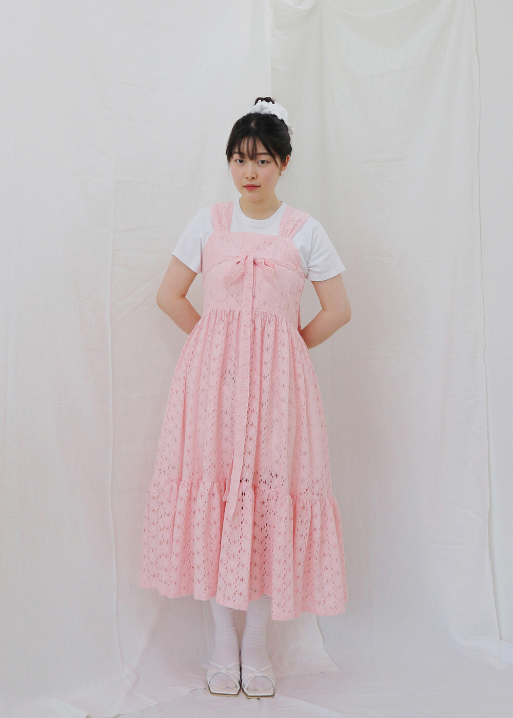 여름과 잘 어울리는 핑크 레이스 원단으로 제작 된 말기 원피스입니다.
