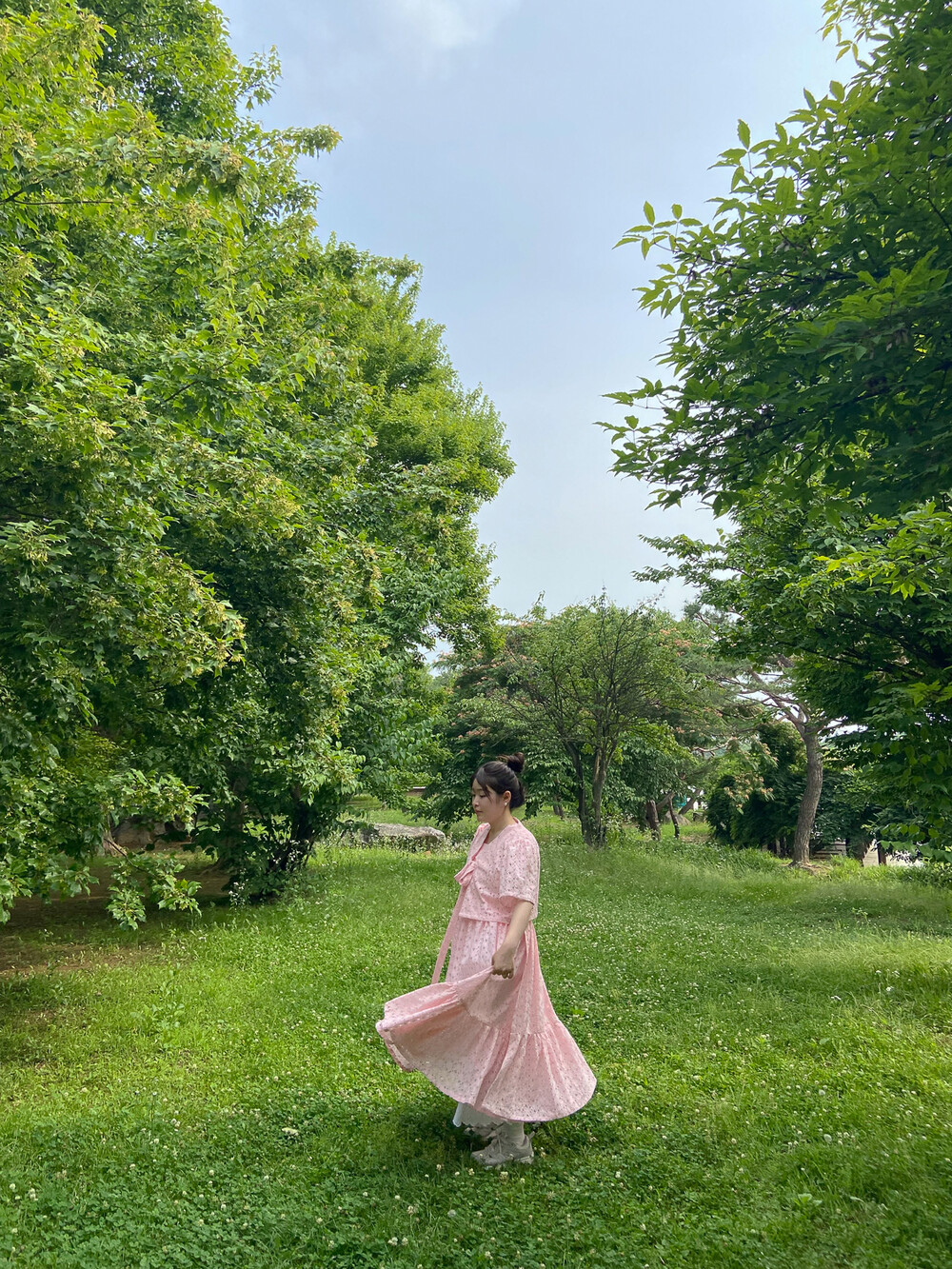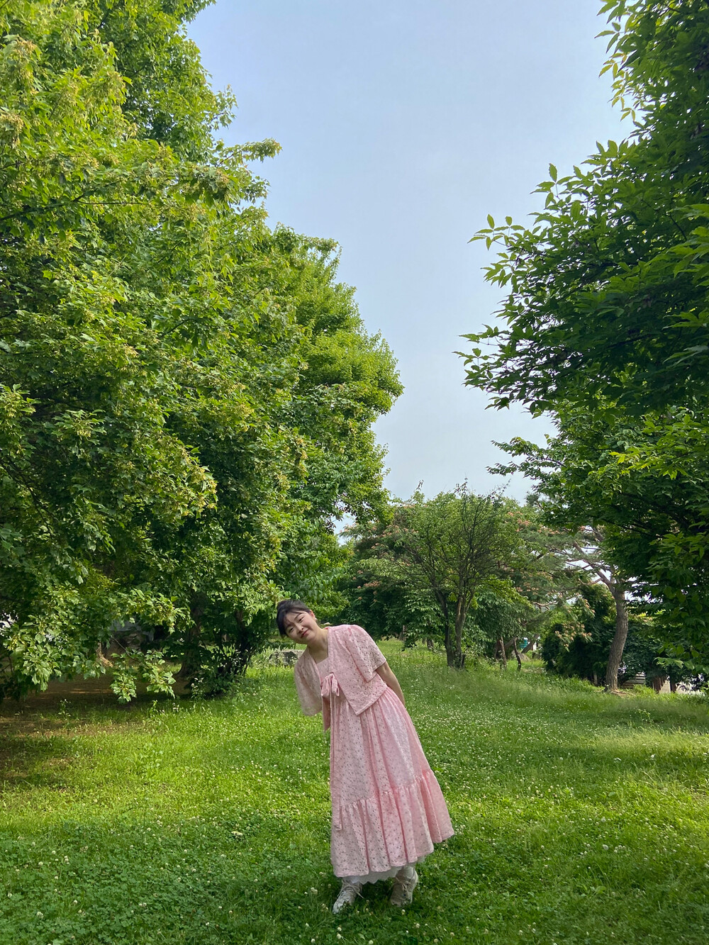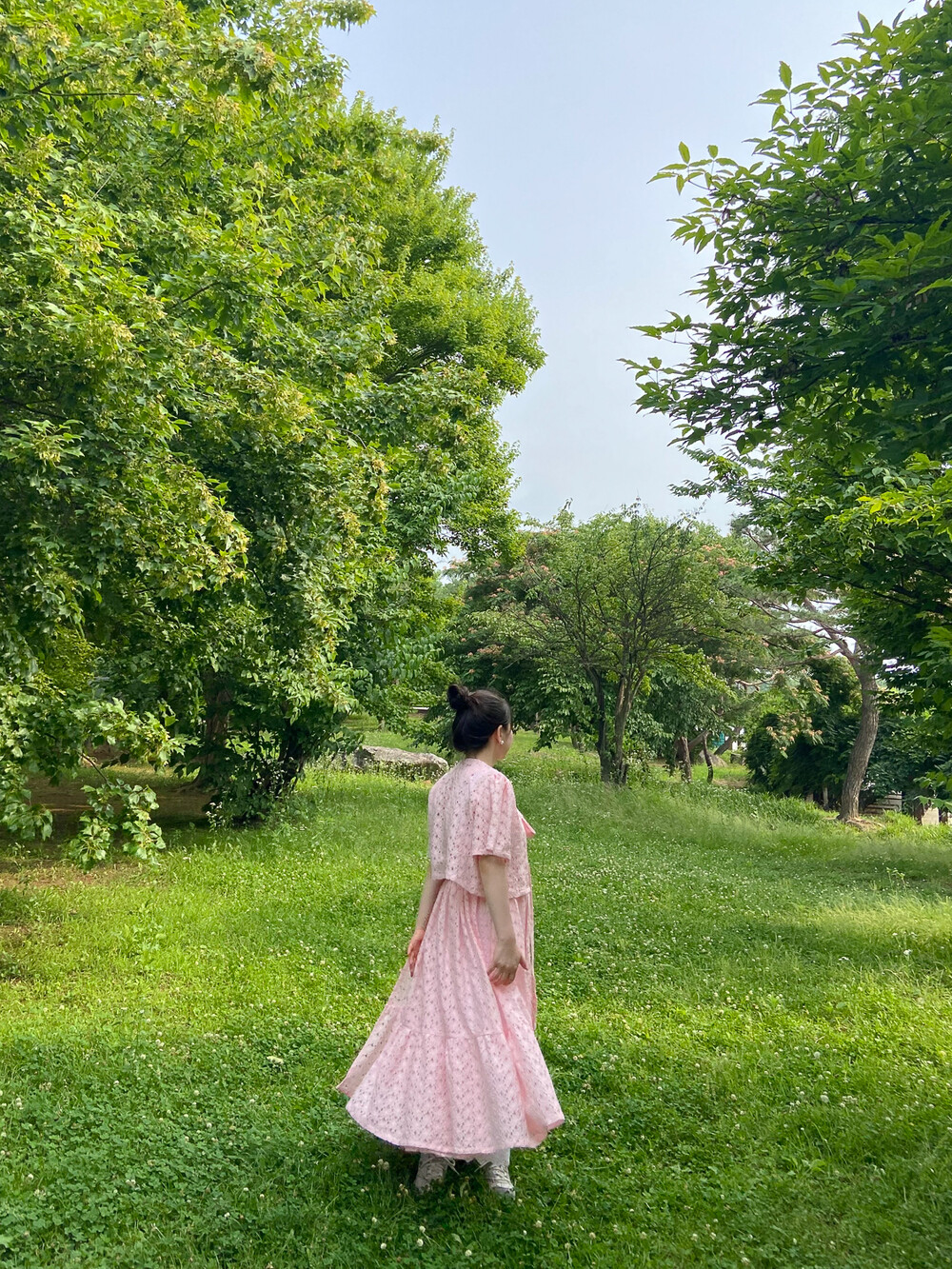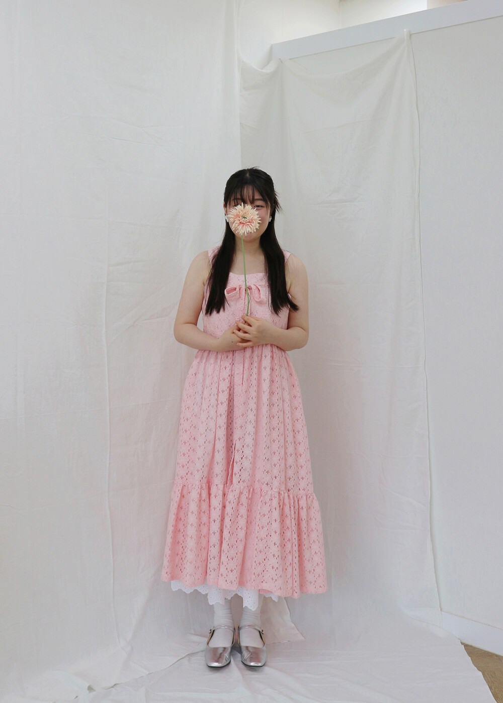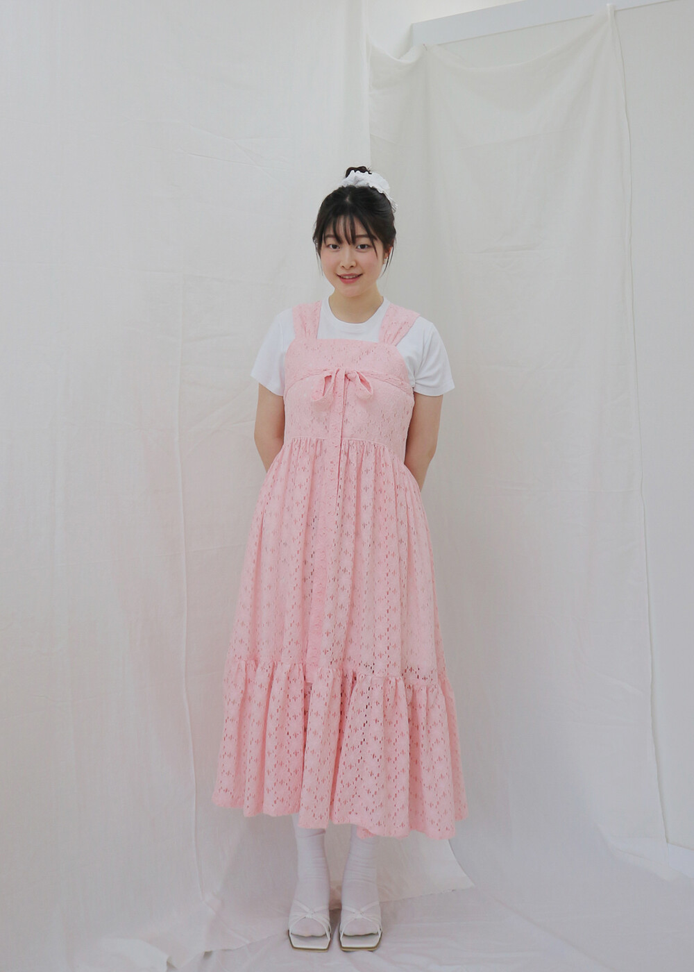 여름과 잘 어울리는 핑크 레이스 원단으로 제작 된 말기 원피스입니다.