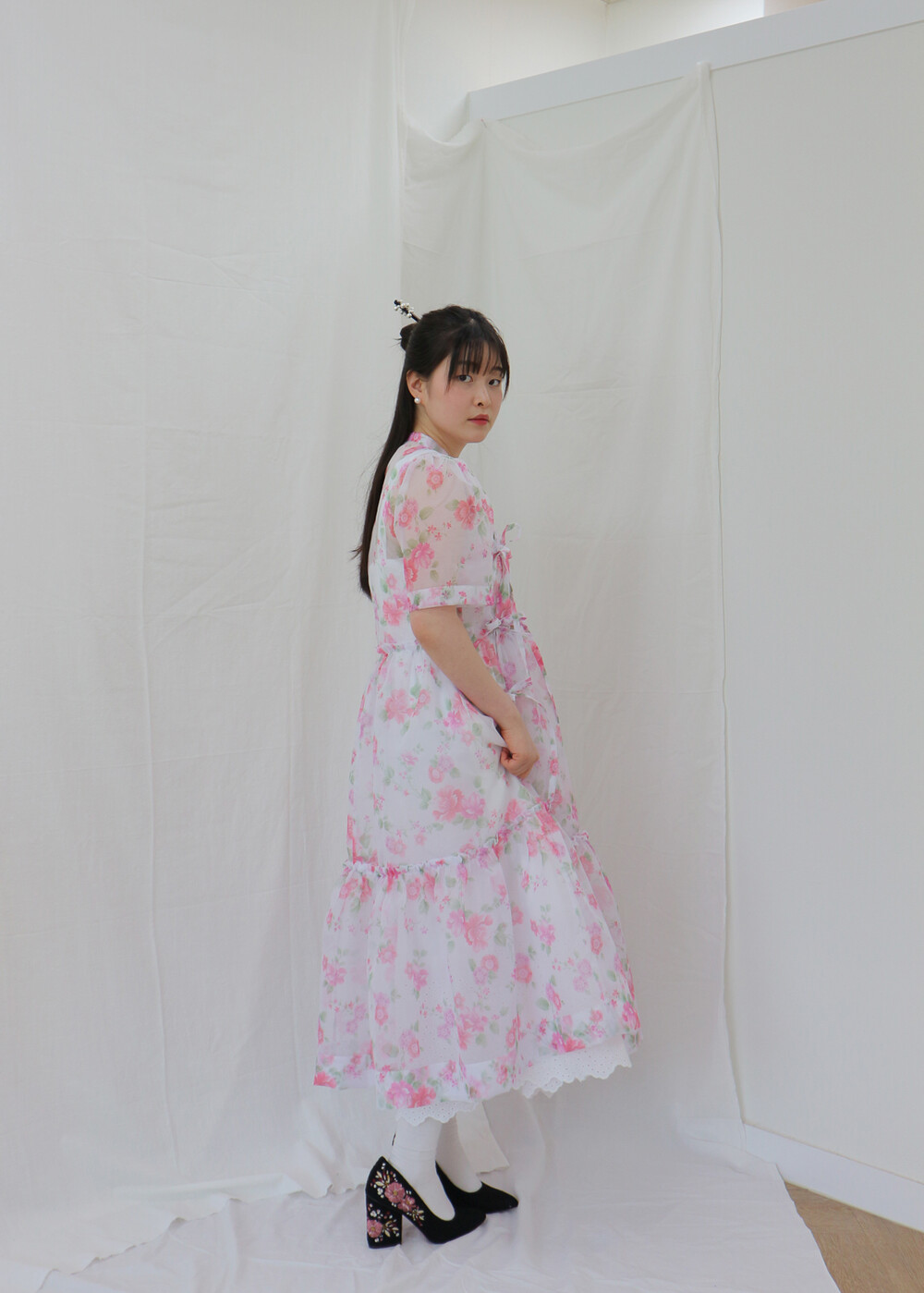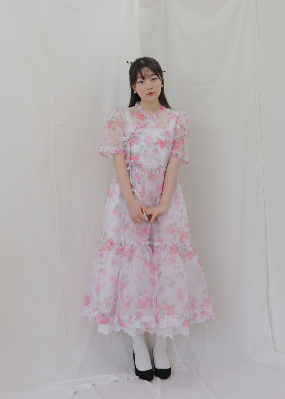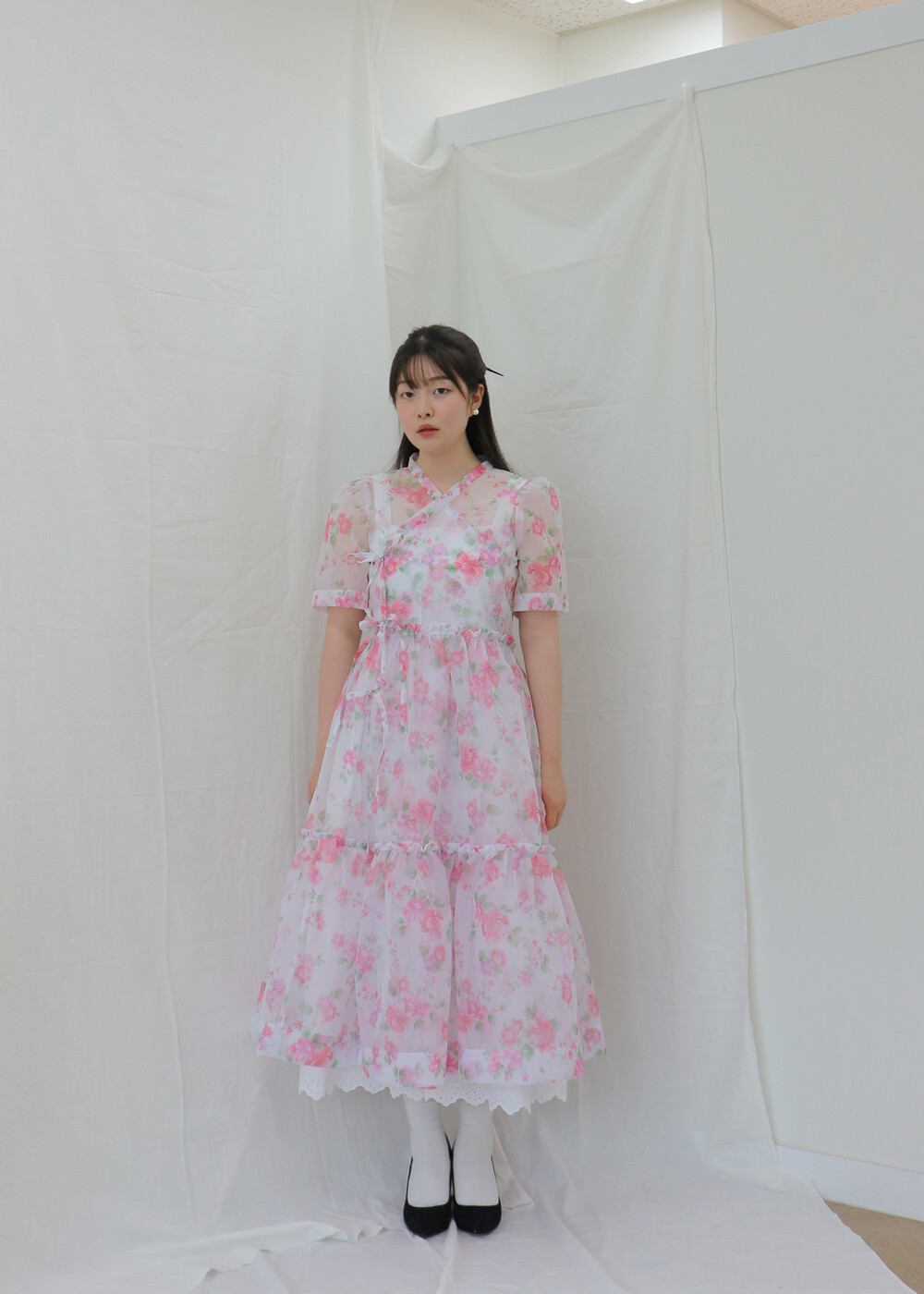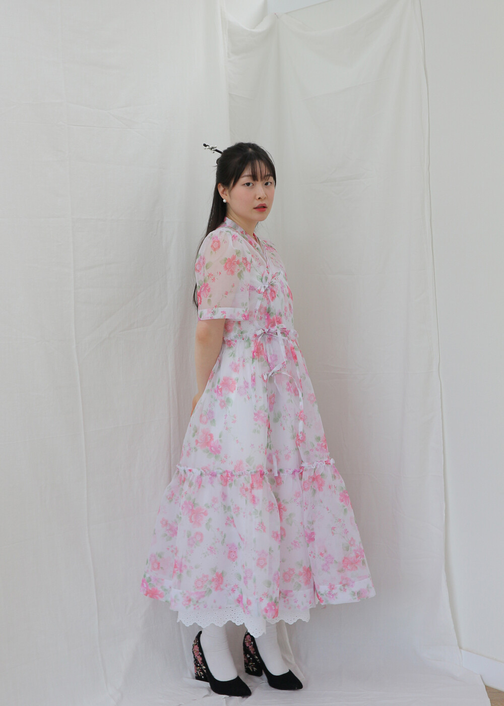풍성한 퍼프소매와 캉캉에 프릴단을 올리고 치마 아랫단을 넓게