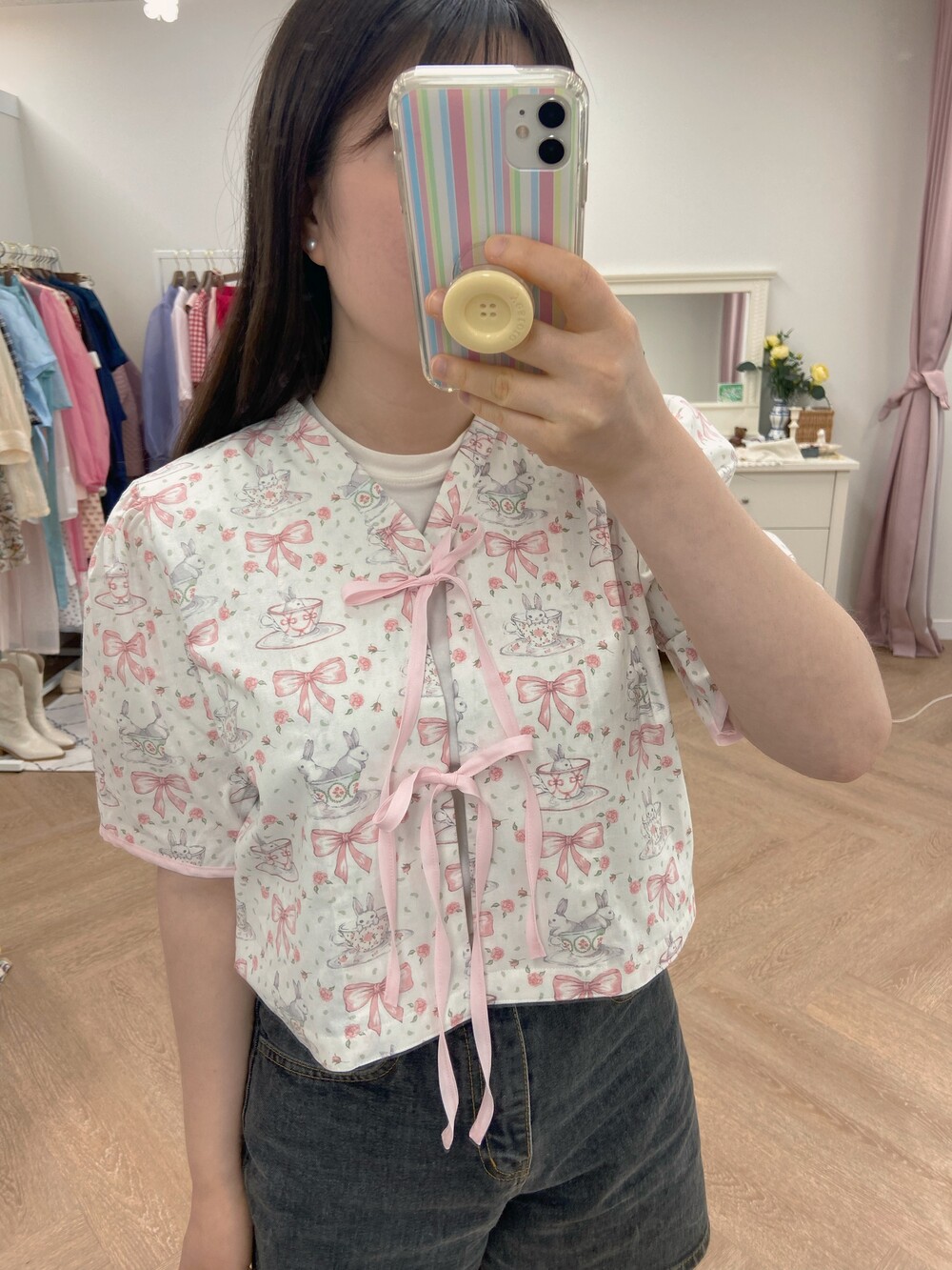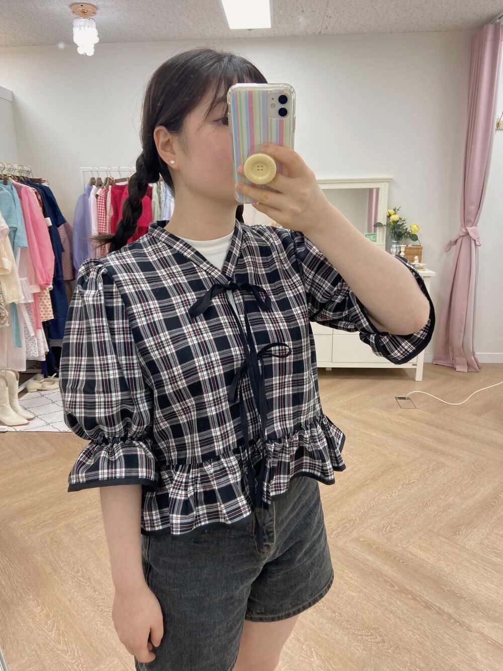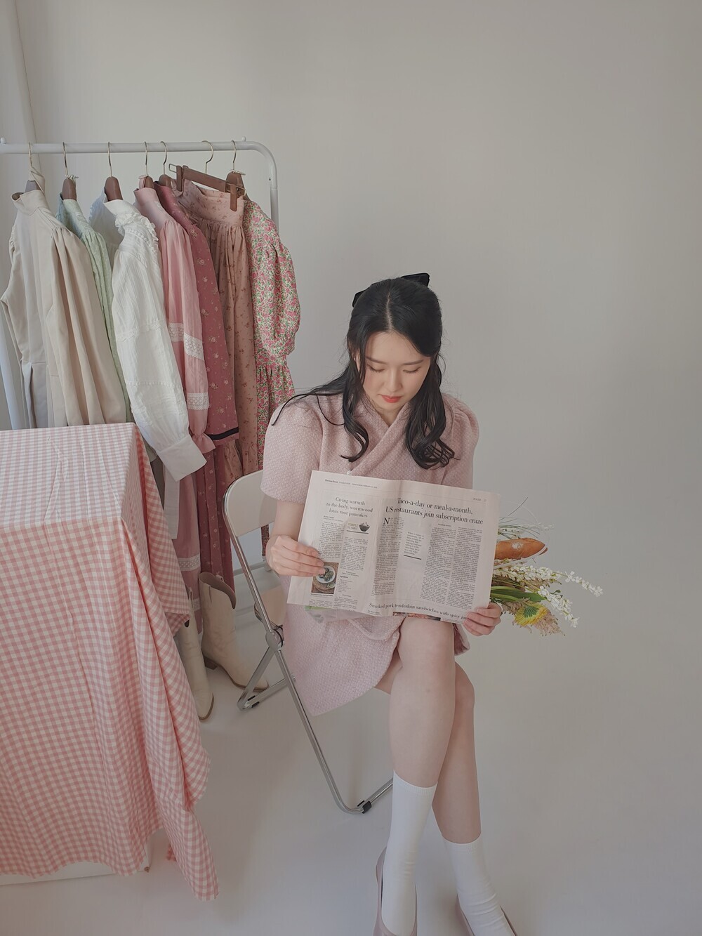 상의에 섬세한 프릴디테일과 벨벳 리본으로 포인트를 주었으며